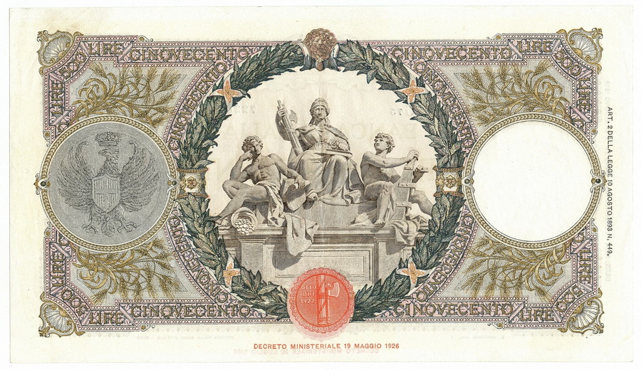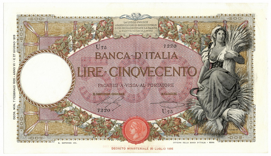 500 LIRE CAPRANESI MIETITRICE TESTINA FASCIO ROMA 07/02/1928 SPL . . . Seriale: U75 7220.