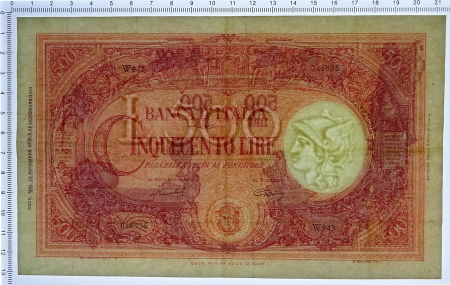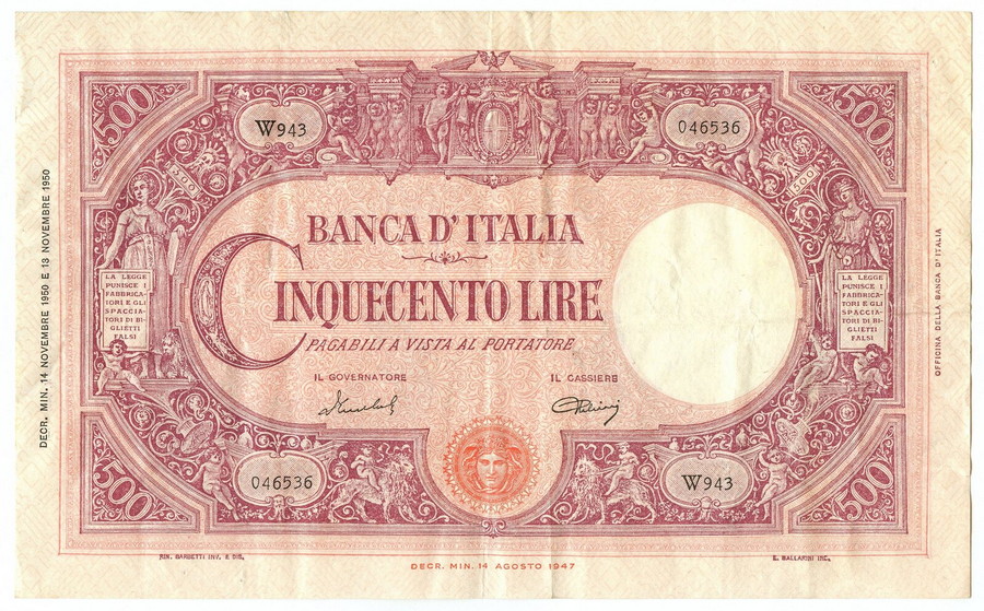 500 LIRE BARBETTI GRANDE C MEDUSA BI REPUBBLICA ITALIANA 14/11/1950 BB/BB+. . . NUMERO DI SERIE: W943 046536