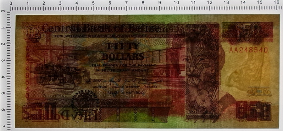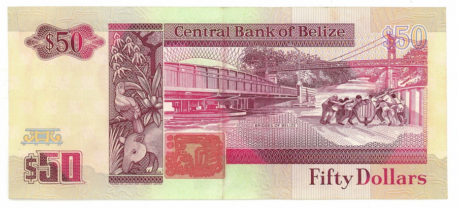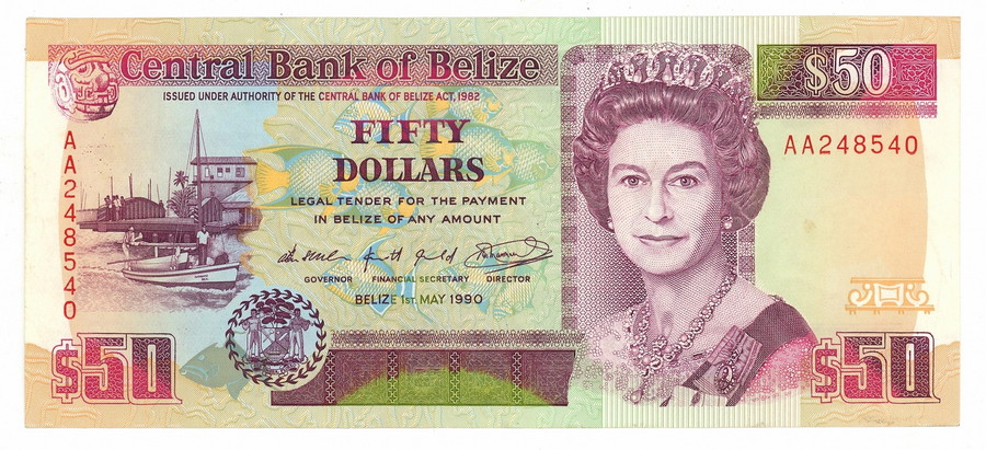 50 DOLLARS CENTRAL BANK OF BELIZE 01/05/1990 SUP+. . . Descrizione: Due accenni di piegatura angolare a destra. Un alone (circa 1,5x1,5 mm) a destra.