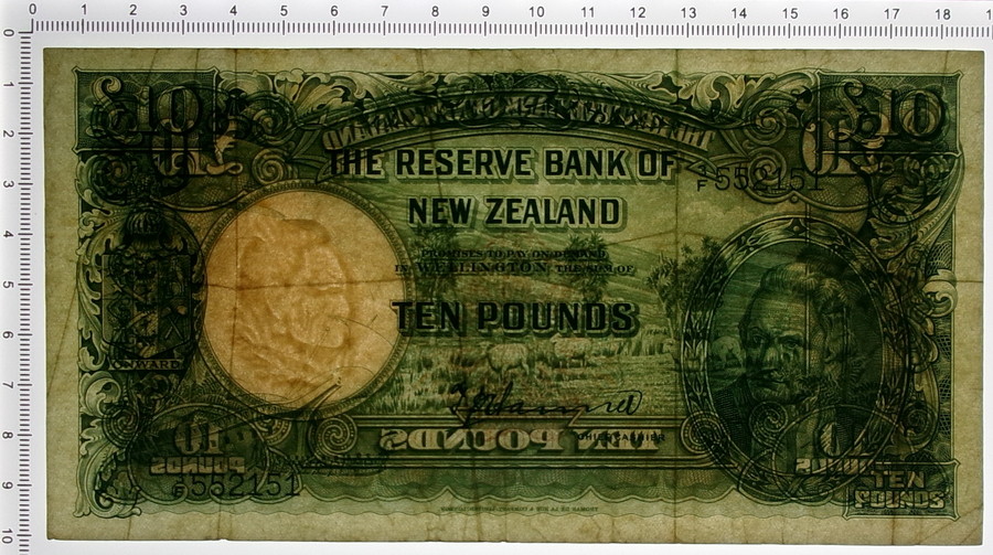 10 POUNDS THE RISERVE BANK OF NEW ZEALAND 1940-1955 BB. . . Descrizione: Pieghe diffuse con sporco raccolto.