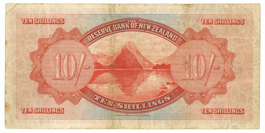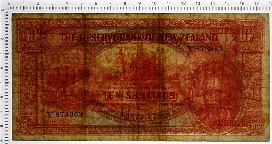 10 SHILLINGS THE RISERVE BANK OF NEW ZEALAND 01/08/1934 MB/BB. 1934. . . Pieghe diffuse, spesso ripetute, con quattro rotture interne puntiformi lungo le stesse, due sul centro-sinistra e due sul centro-destra. Tracce di sporco raccolto.