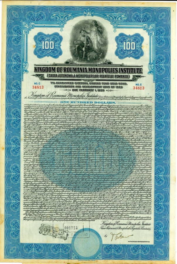 - 1929 - KINGDOM OF ROUMANIA MONOPOLIES INSTITUTE 7% GOLD DOLLAR $100.