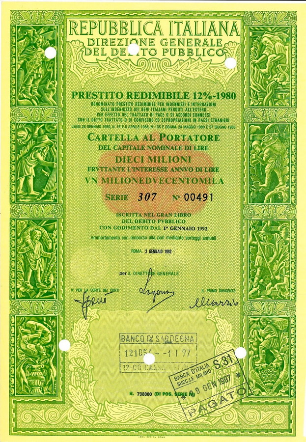1993 - PRESTITO REDIMIBILE 12% - 1980 - CARTELLA 10.000.000 LIRE (Attività agreste, viola). . .