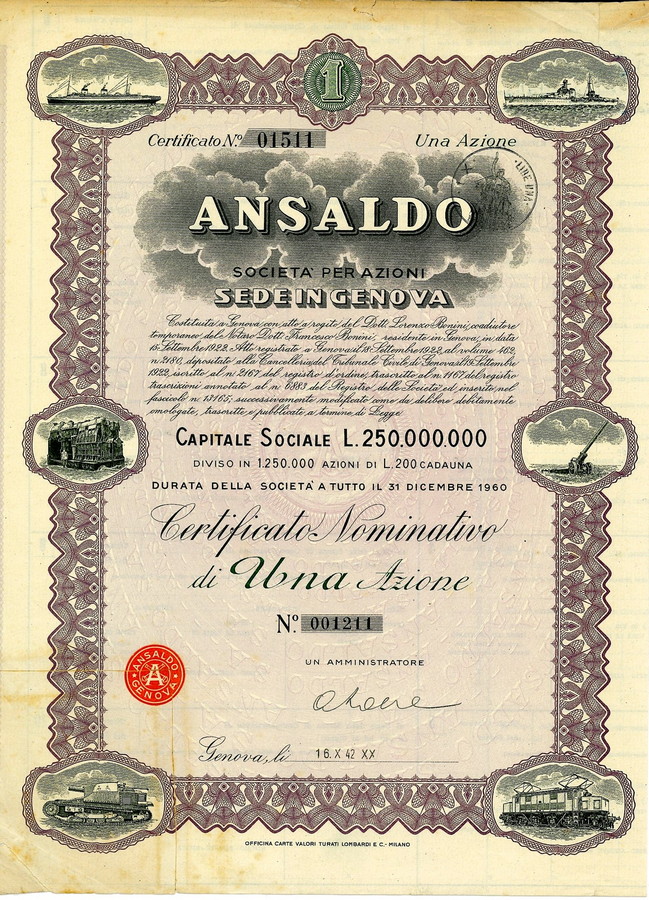 Previous Lot 397 Next Capitolium Art - Via Carlo Cattaneo 55, 25121 Brescia Asta 521 | NUMISMATICA IV Tornata, 319-419 Wednesday 7 May 2025 hours 19:00 (UTC +01:00) - 1943 - ANSALDO SOC. PER AZIONI 1 AZIONE - GENOVA. 1943 - ANSALDO SOC. PER AZIONI 1 AZIONE - GENOVA. . .