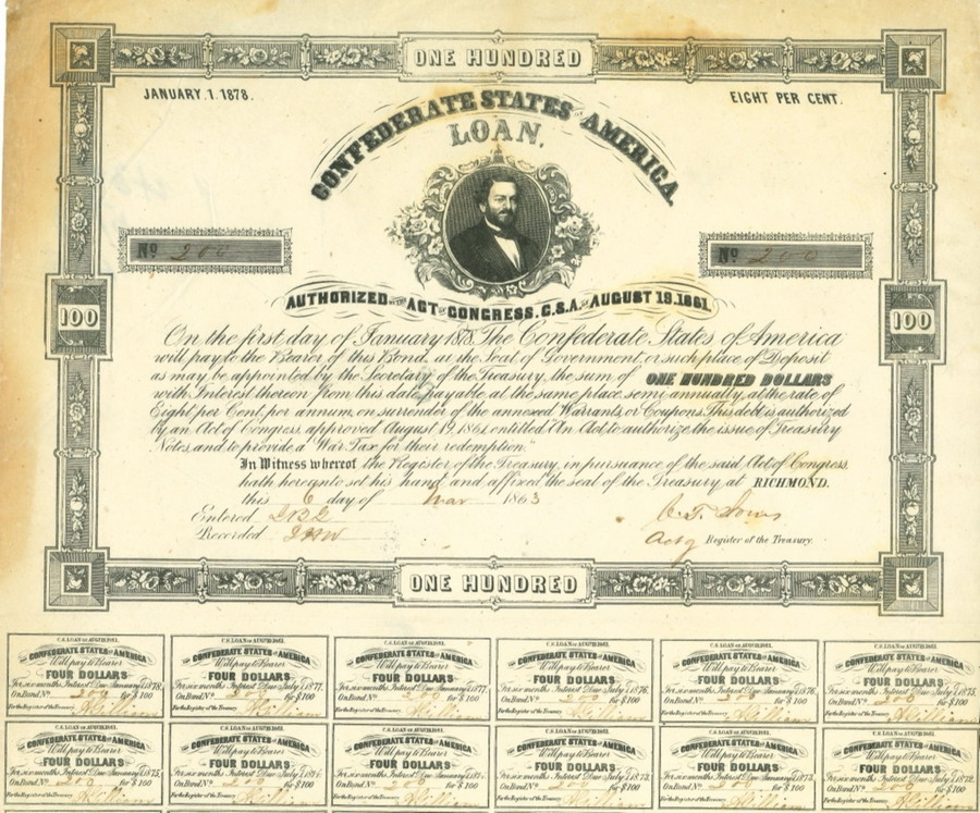 - 1864 - CONFEDERATE STATES AMERICAN LOAN - 1000 DOLLARI.