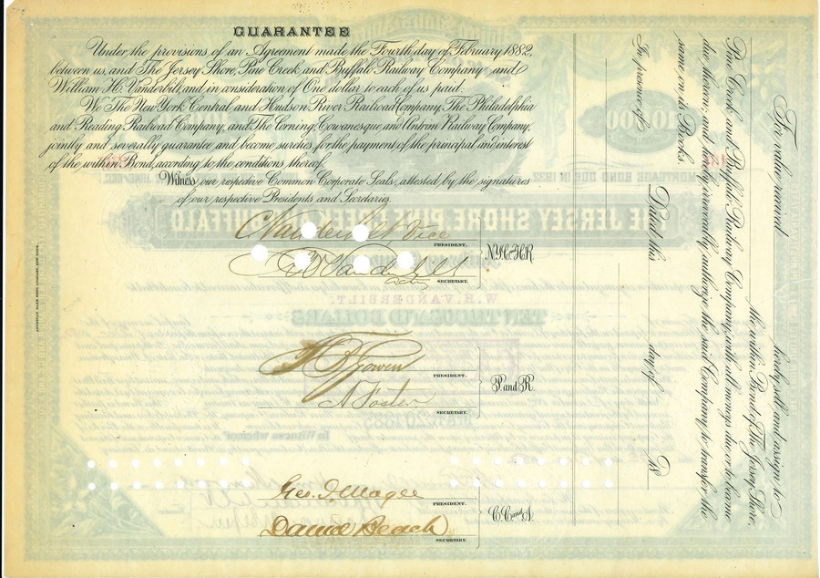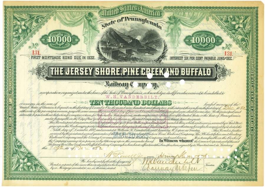 - 1882 - THE JERSEY SHORE, PINE CREEK AND BUFFALO - 10000 DOLLARI (Firma W.H. Vanderbilt e Chauncey Depew).