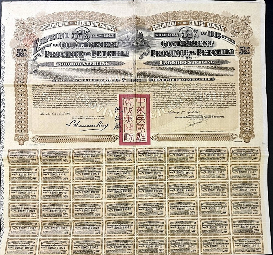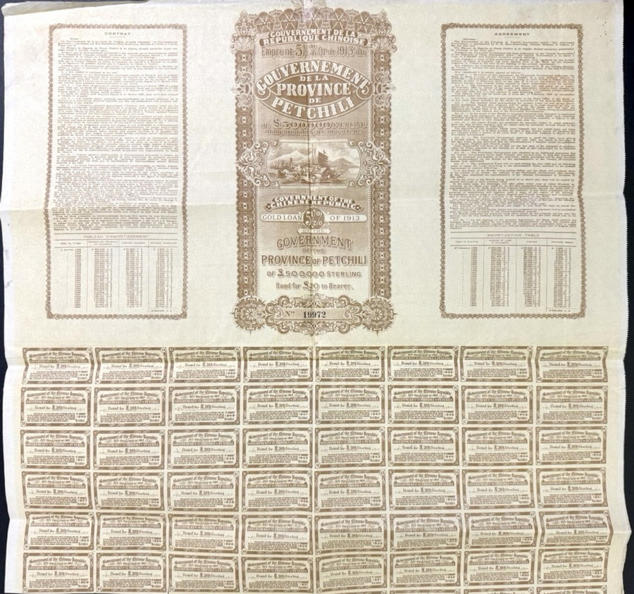- 1913 - GOVERNEMENT DE LA REPUBLIQUE CHINOISE BOND 5 1/2% PROVINCE DE PETCHILI £20 GOLD LOAN.