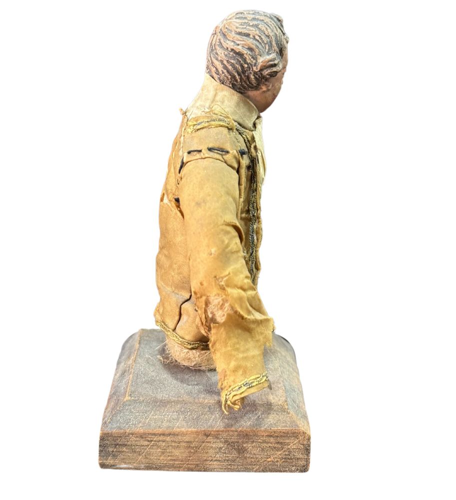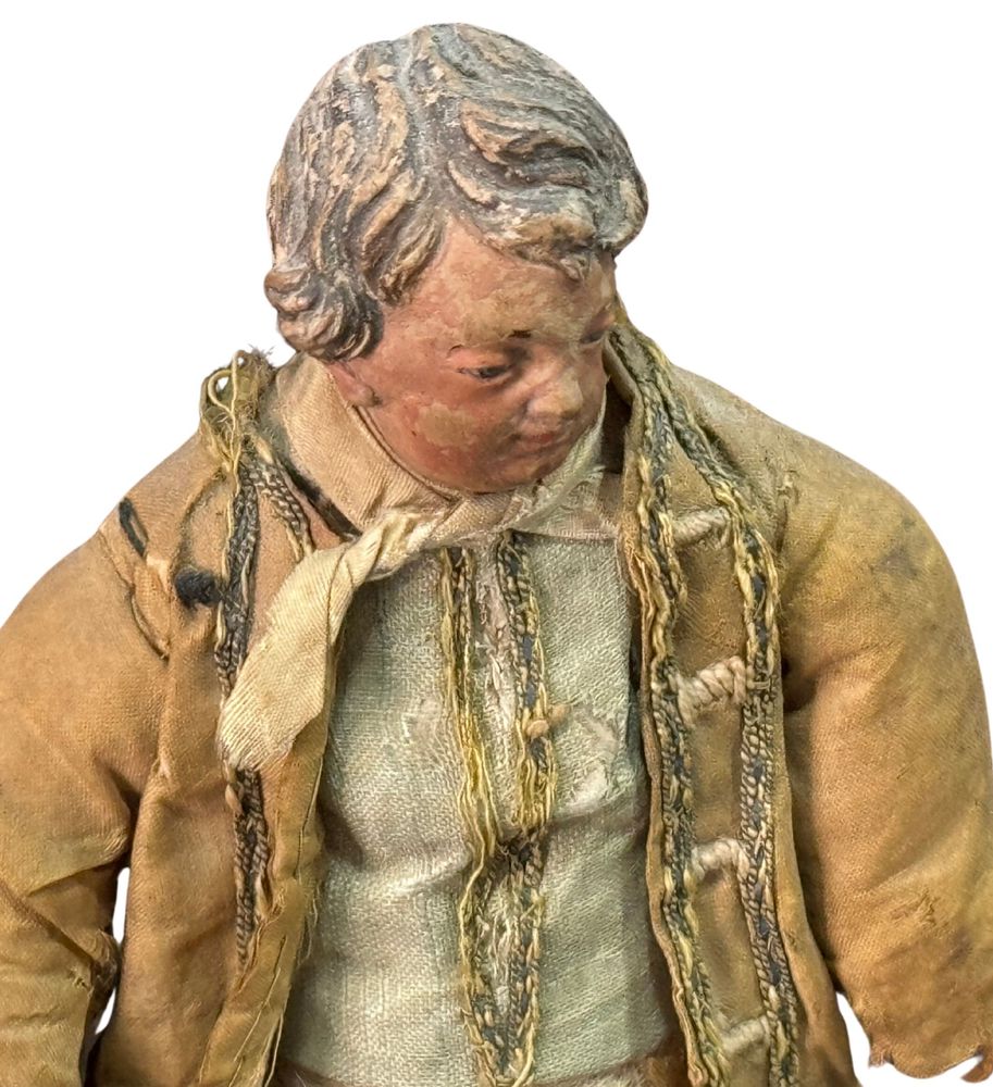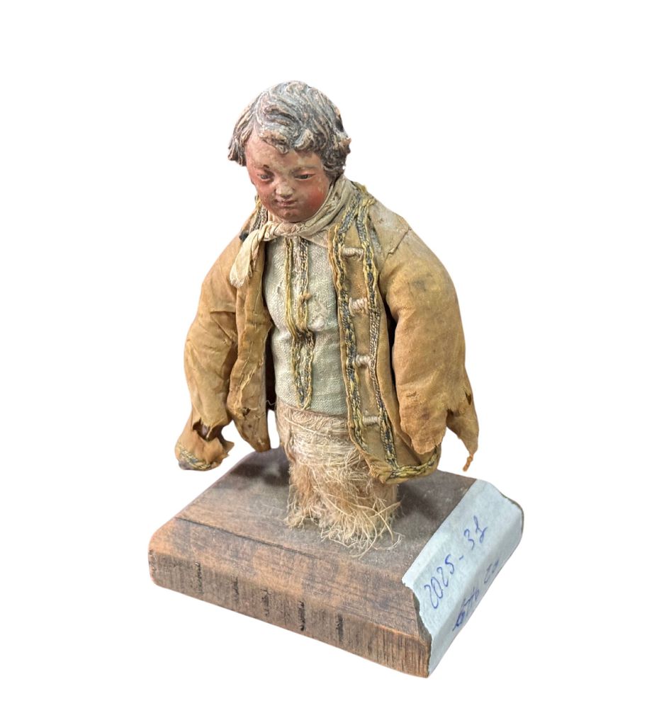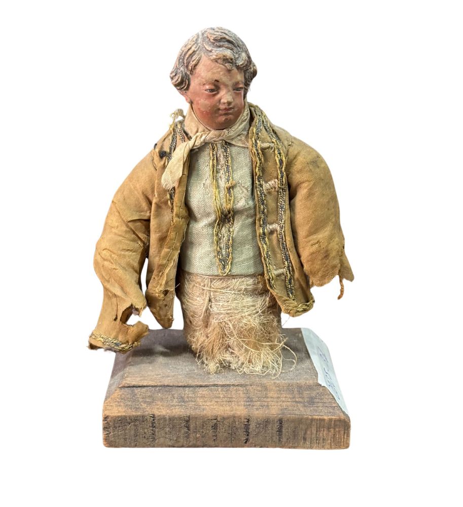 Pastore napoletano, periodo XIX secolo. Dimensioni: h:13 cm. Segno di vissuto difetti e mancanze.
