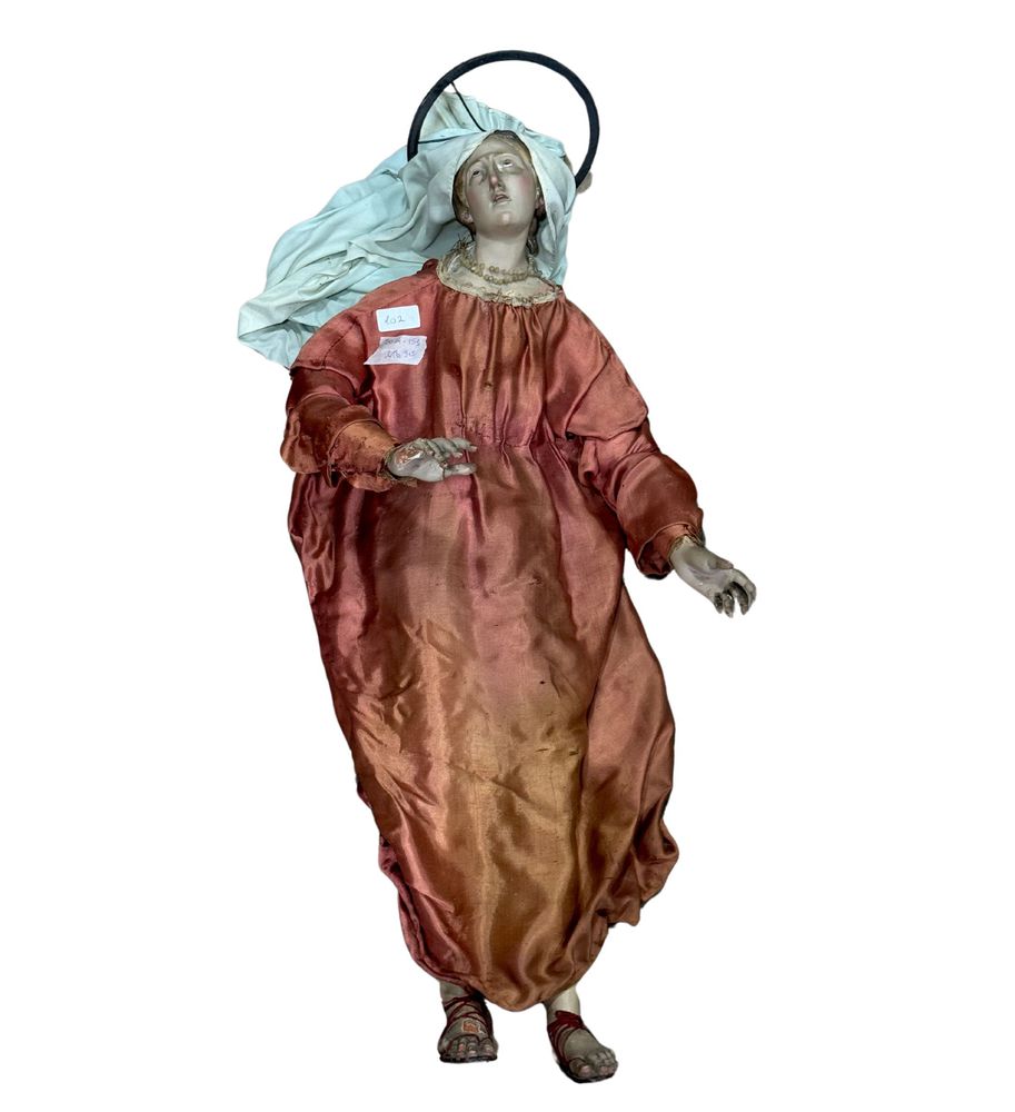 Scultura da presepe in legno, periodo XVIII secolo raffigurante Vergine Maria. Dimensioni: h80 cm. Scultura così composta: Testa, mani e piedi in legno scolpito. Occhi in vetro e corpo in canapa.