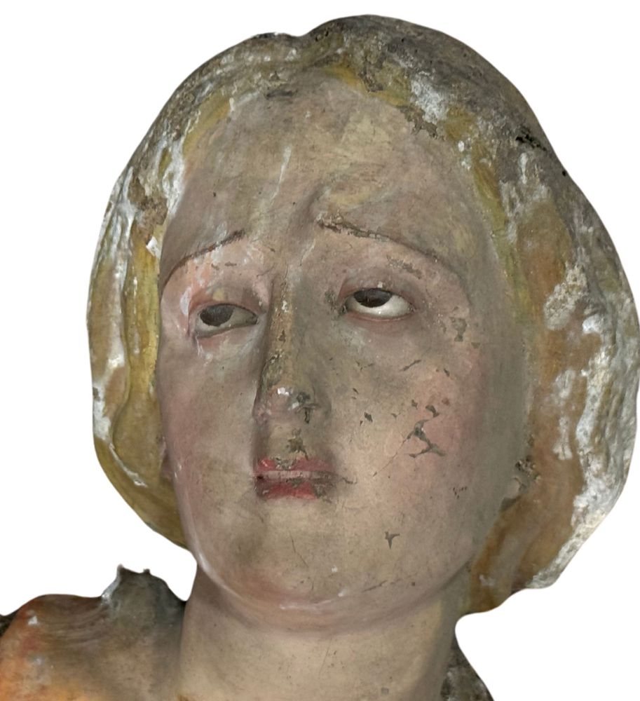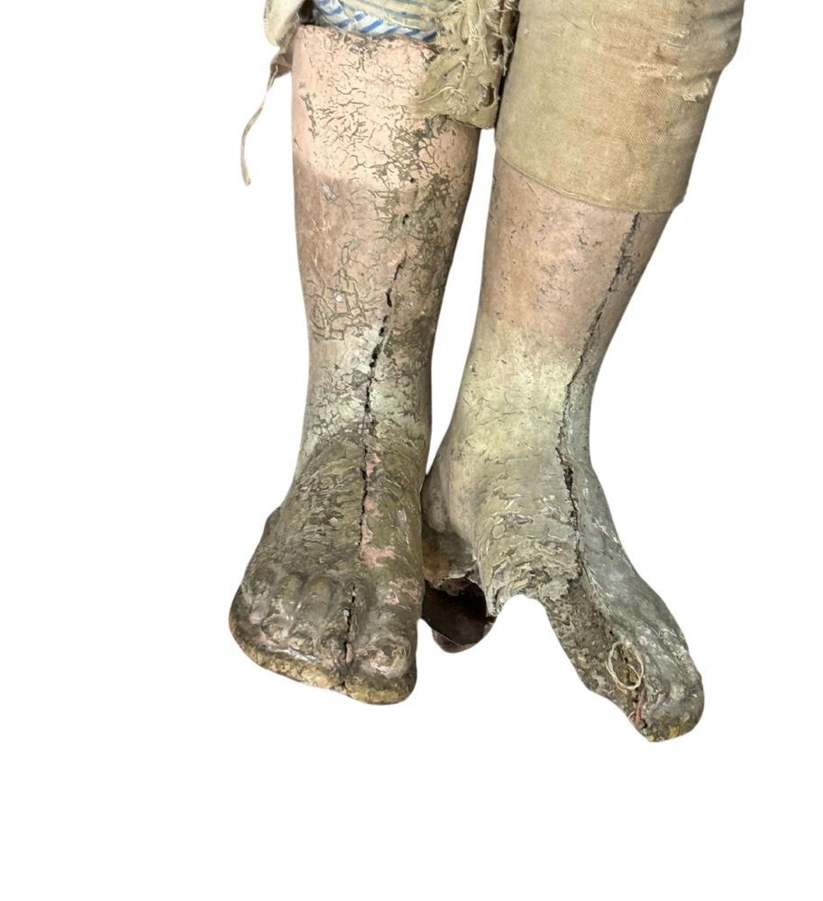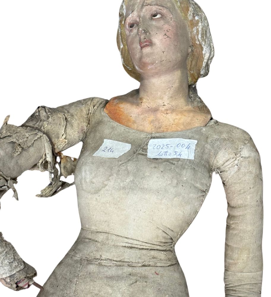 Scultura presepiale, periodo XVIII secolo, raffigurante Figura femminile. Così composta: corpo in canapa antica, testa e piedi in cartapesta, occhi in vetro. Dimensioni: h110 cm. Scultura in discrete condizioni, assenza delle mani, con vistosi segni di vissuto come da foto allegate.
