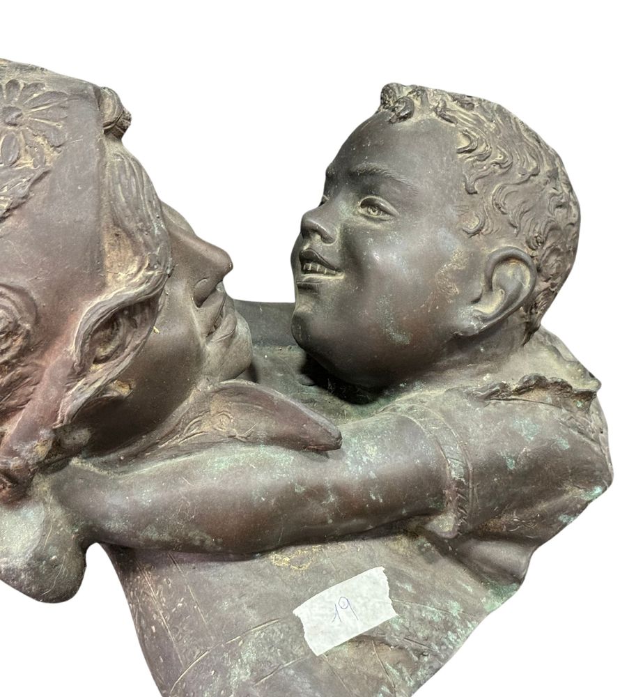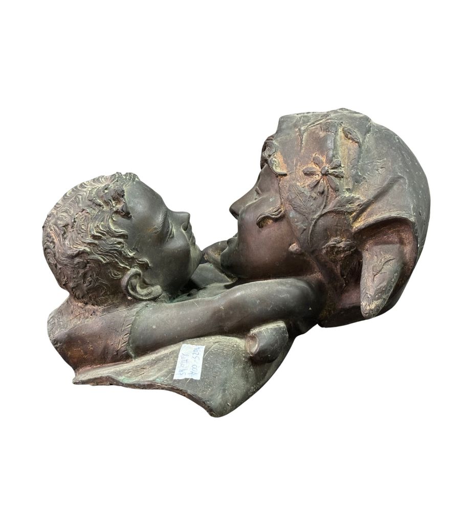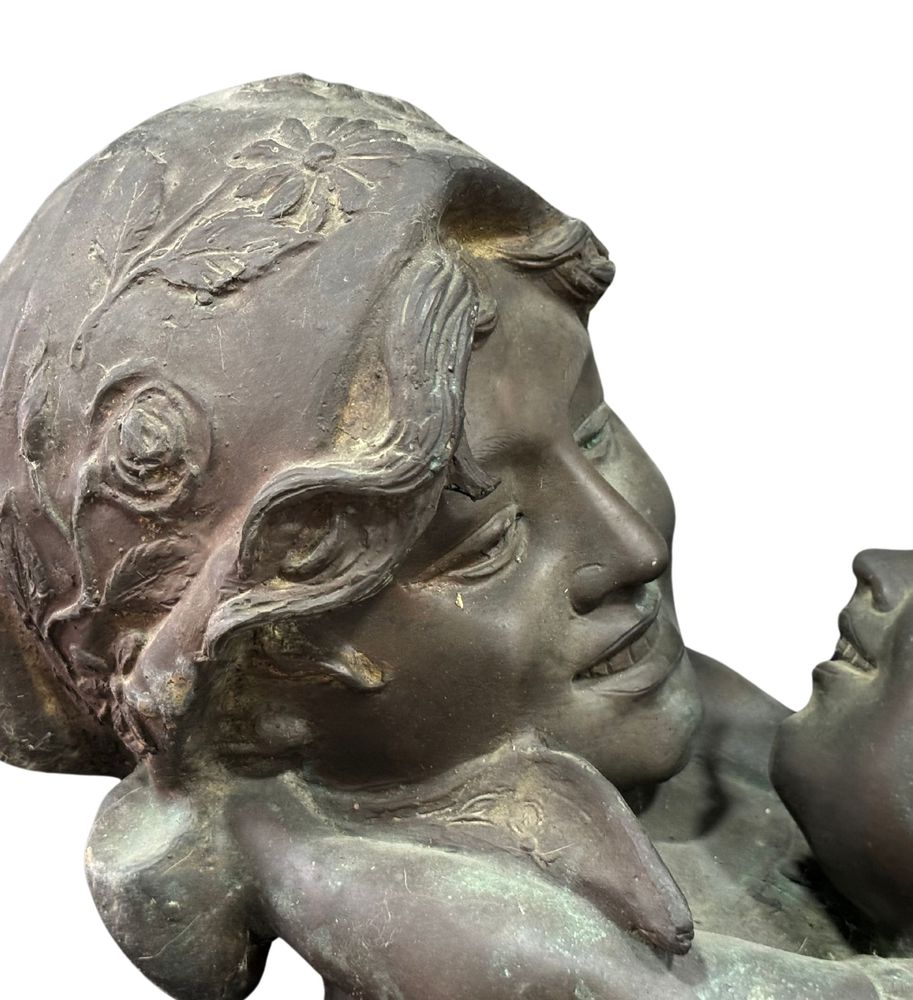 Scultura in bronzo a cera persa, periodo XX secolo, raffigurante Scena materna. Dimensioni: h29x39x35 cm. Scultura in buone condizioni. Reca firma Merente.