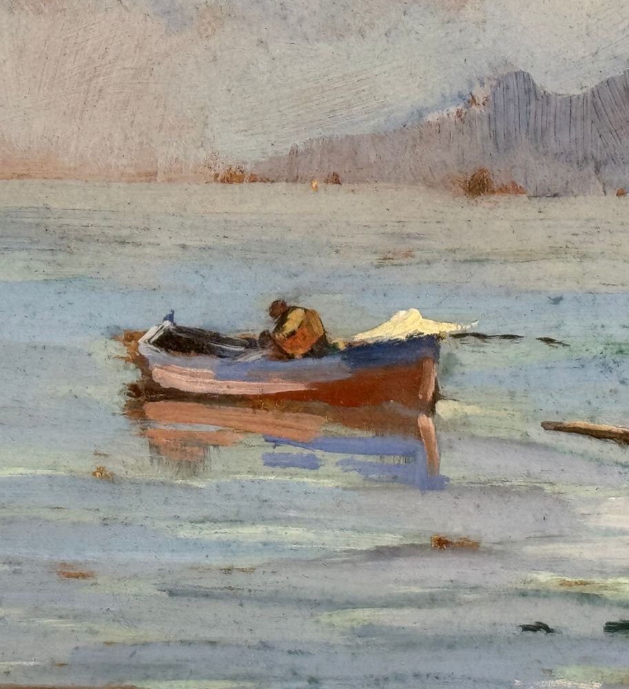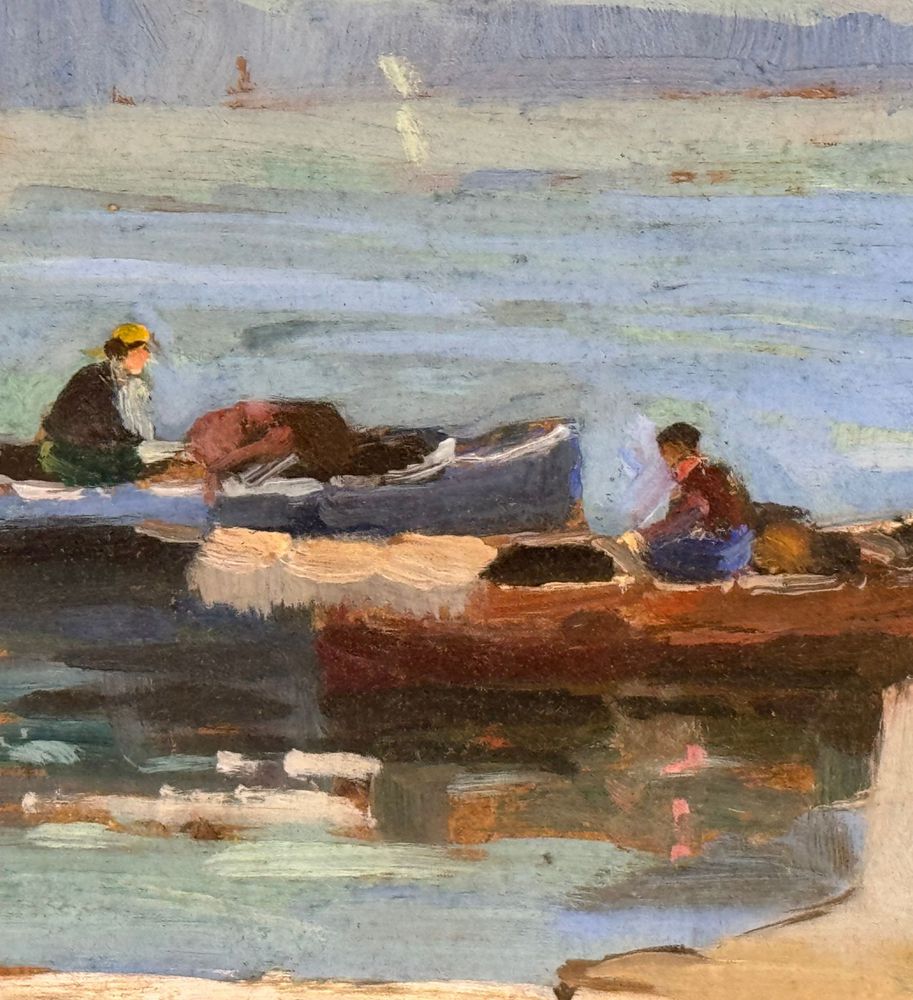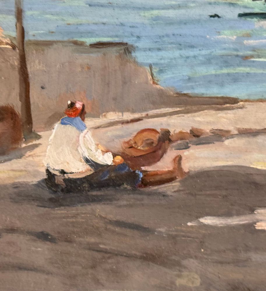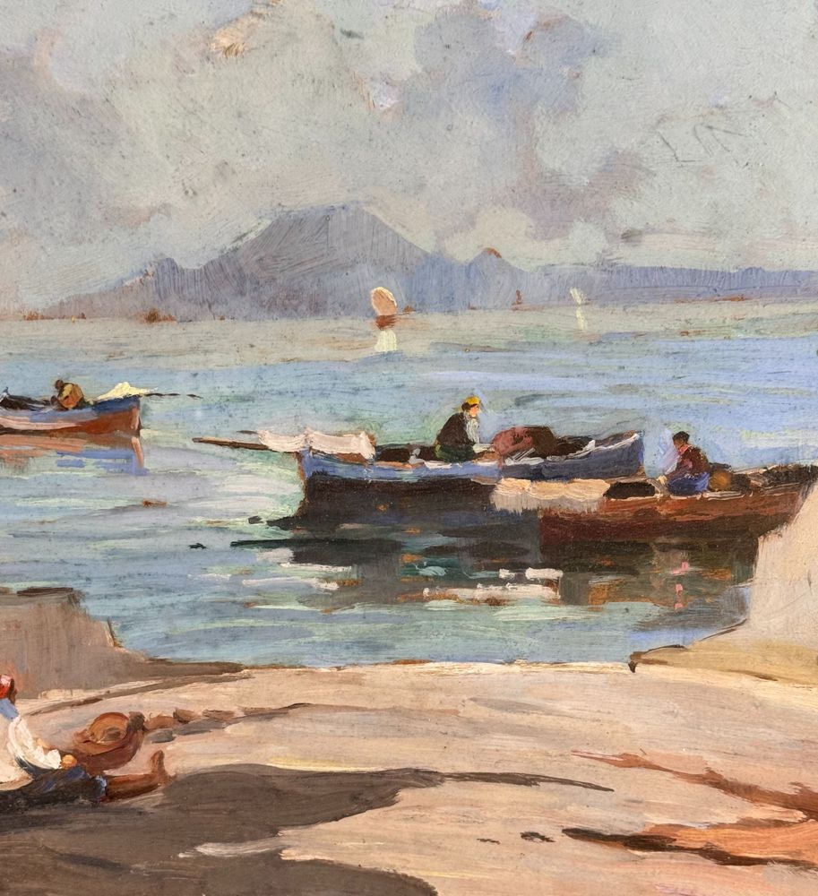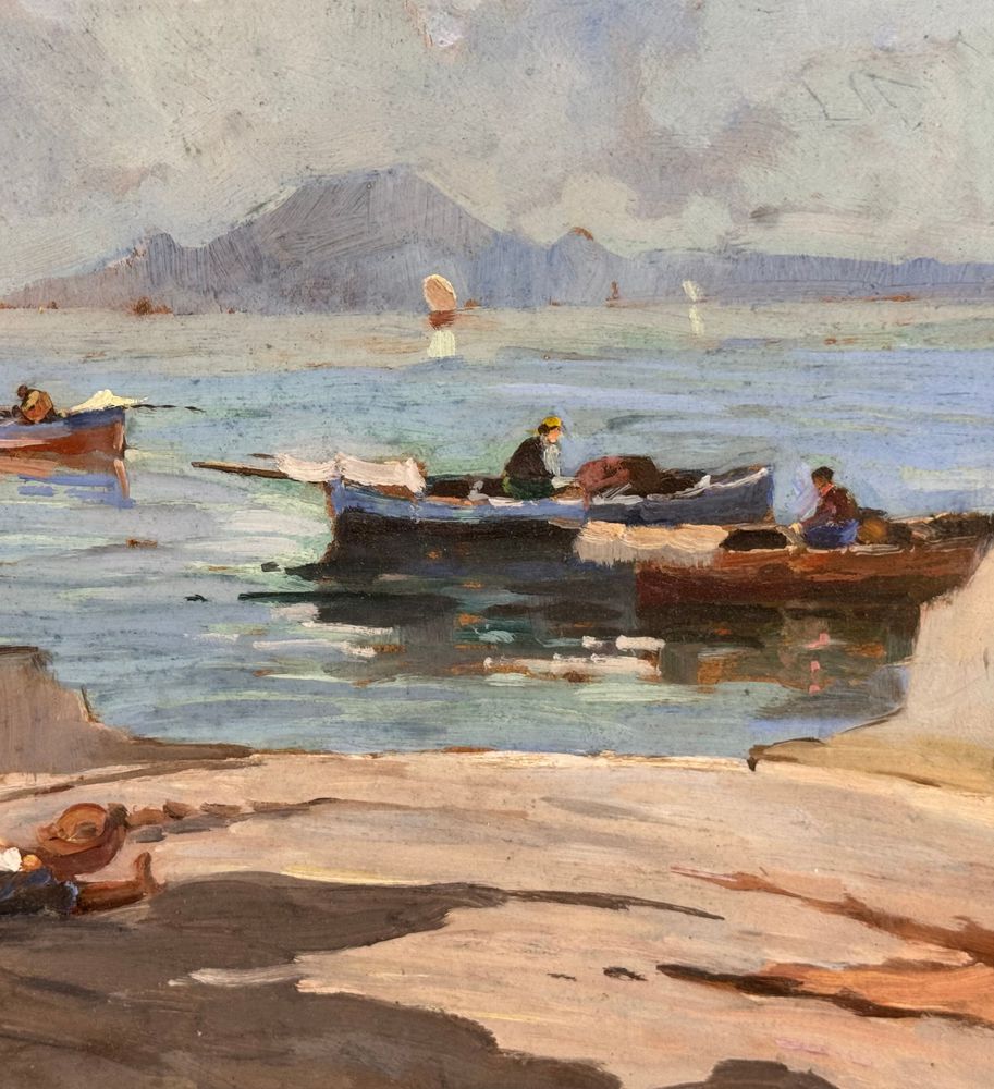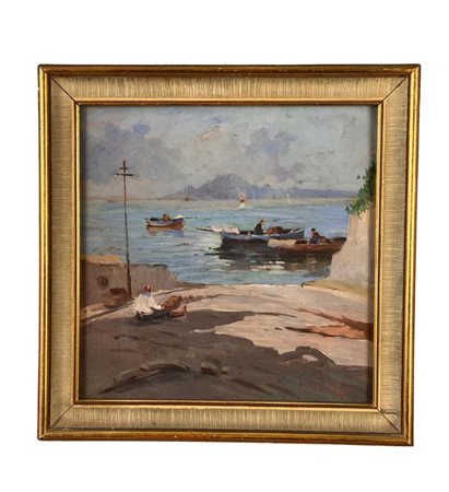 Dipinto olio su pannello, periodo XX secolo scuola Italiana, raffigurante Scorcio di marina napoletana. Dimensioni compreso cornice: 38x38 cm. Dimensioni interno cornice: 31x31 cm. Reca firma in basso a destra artista non identificato. Opera in buone condizioni.