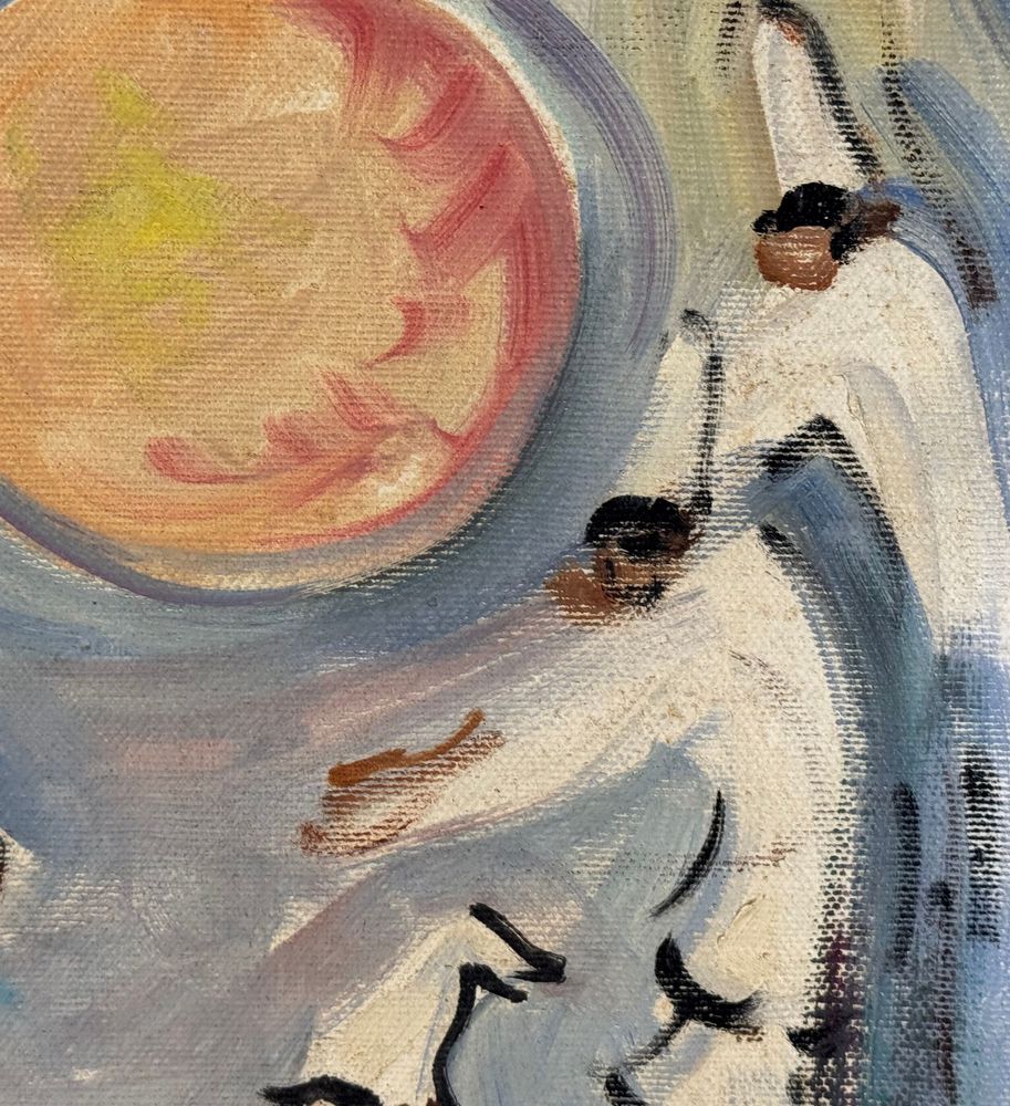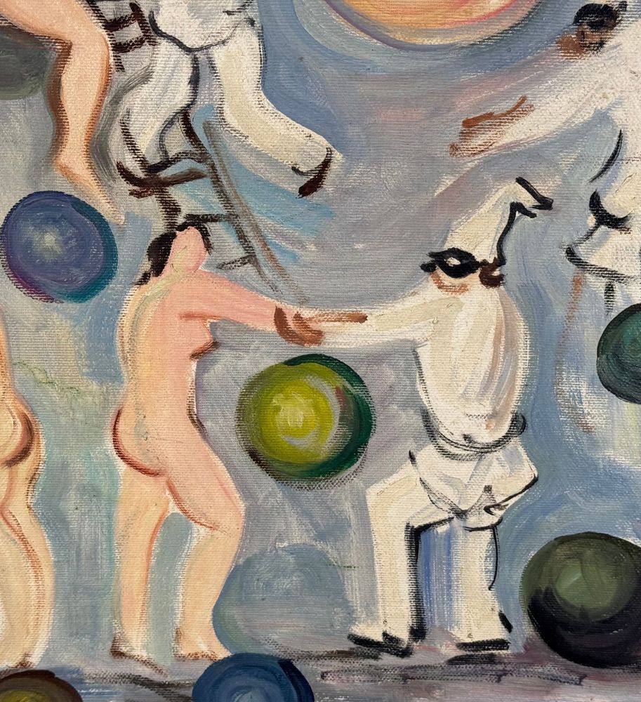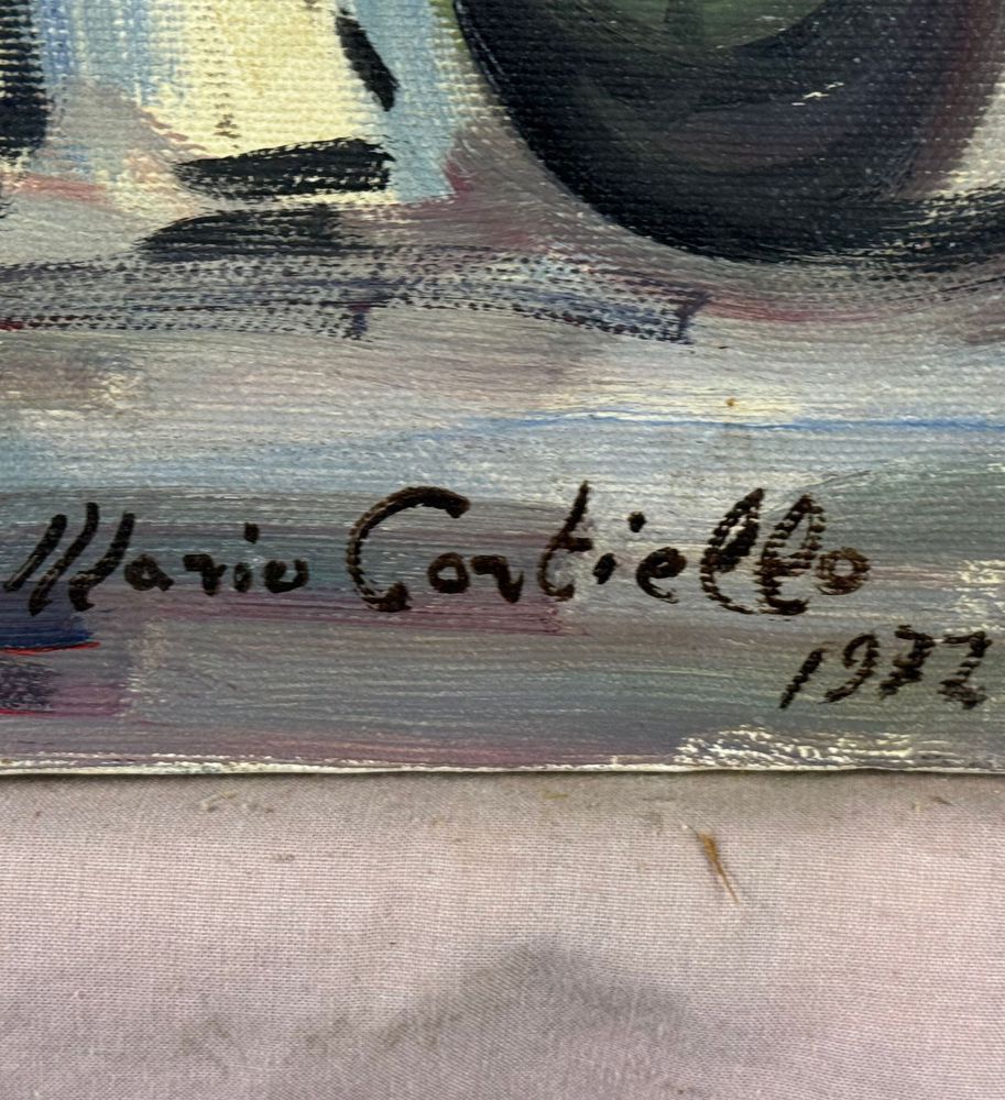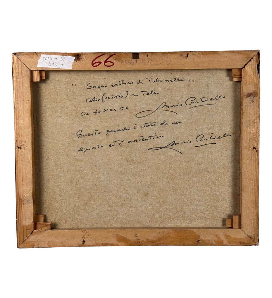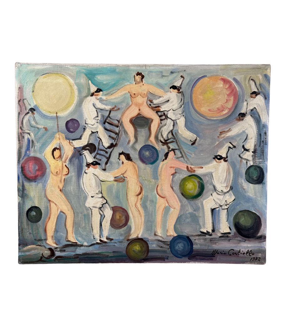 Dipinto olio su tela, periodo 1972, scuola Italiana, raffigurante Sogno erotico di Pulcinella. Dimensioni: 40x50 cm. Reca firma in basso a destra Mario Cortiello. Opera in buone condizioni.