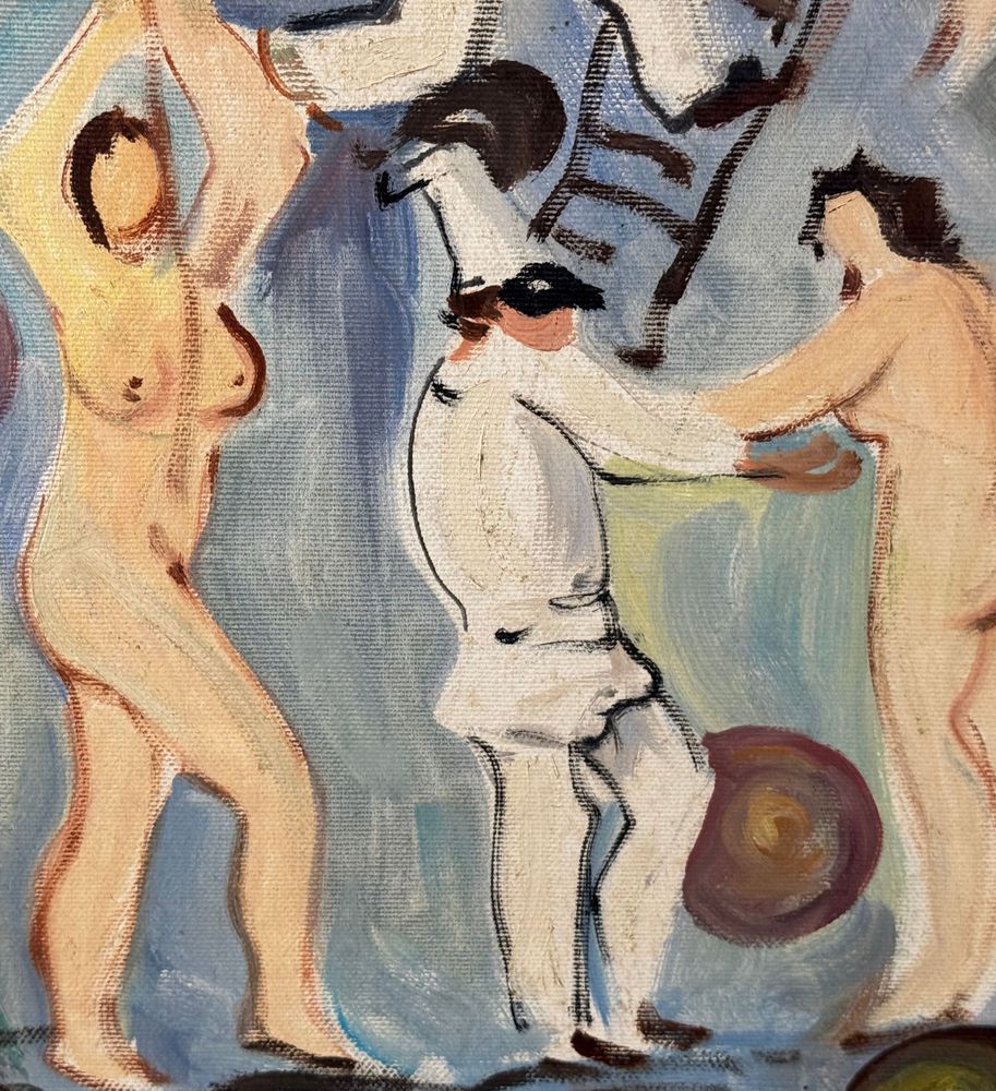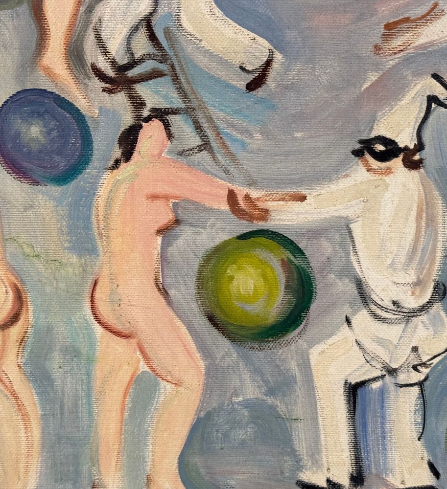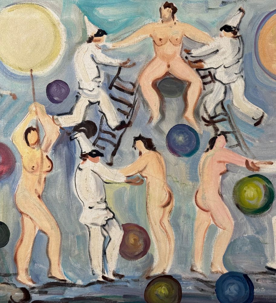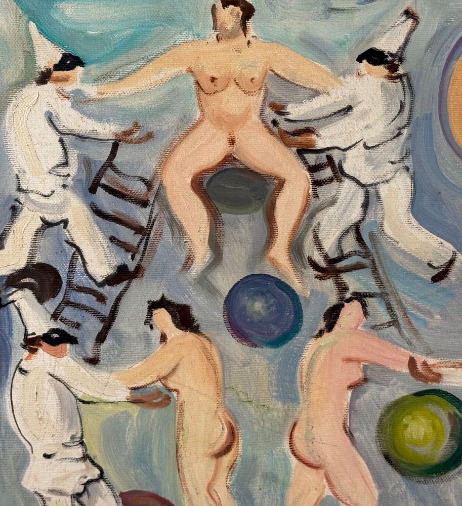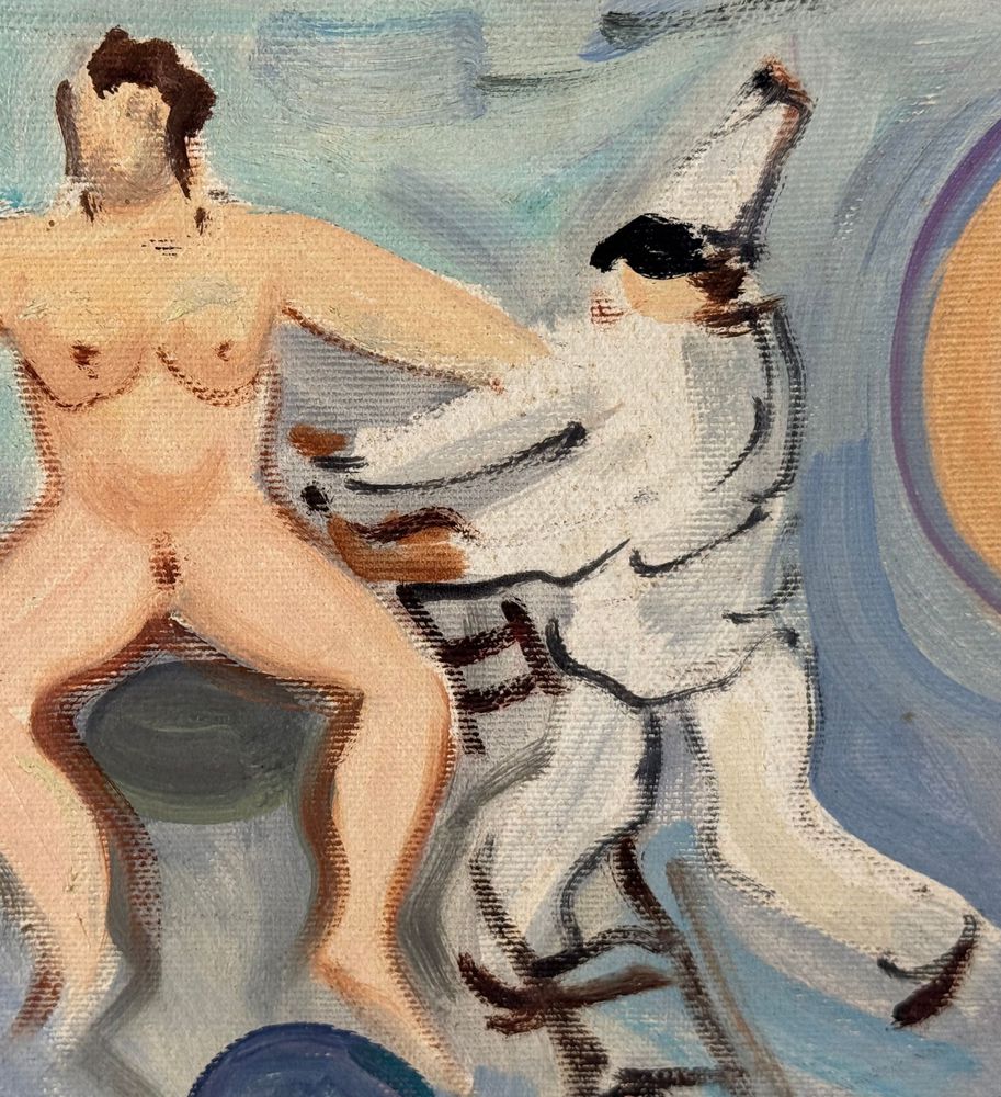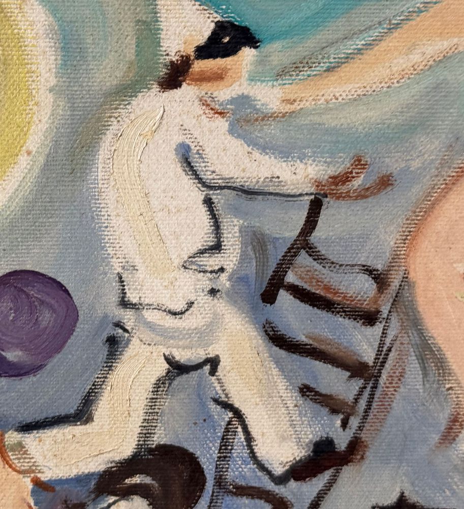 Dipinto olio su tela, periodo 1972, scuola Italiana, raffigurante Sogno erotico di Pulcinella. Dimensioni: 40x50 cm. Reca firma in basso a destra Mario Cortiello. Opera in buone condizioni.