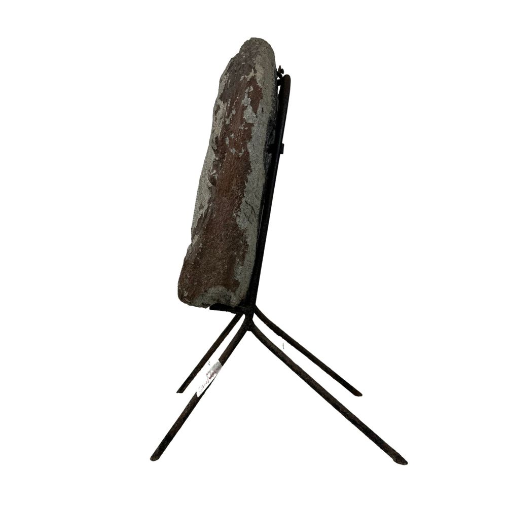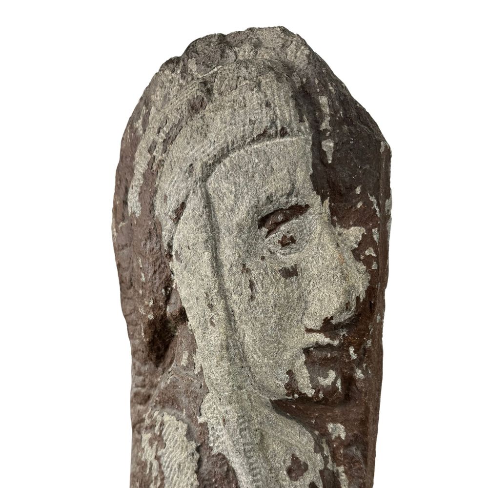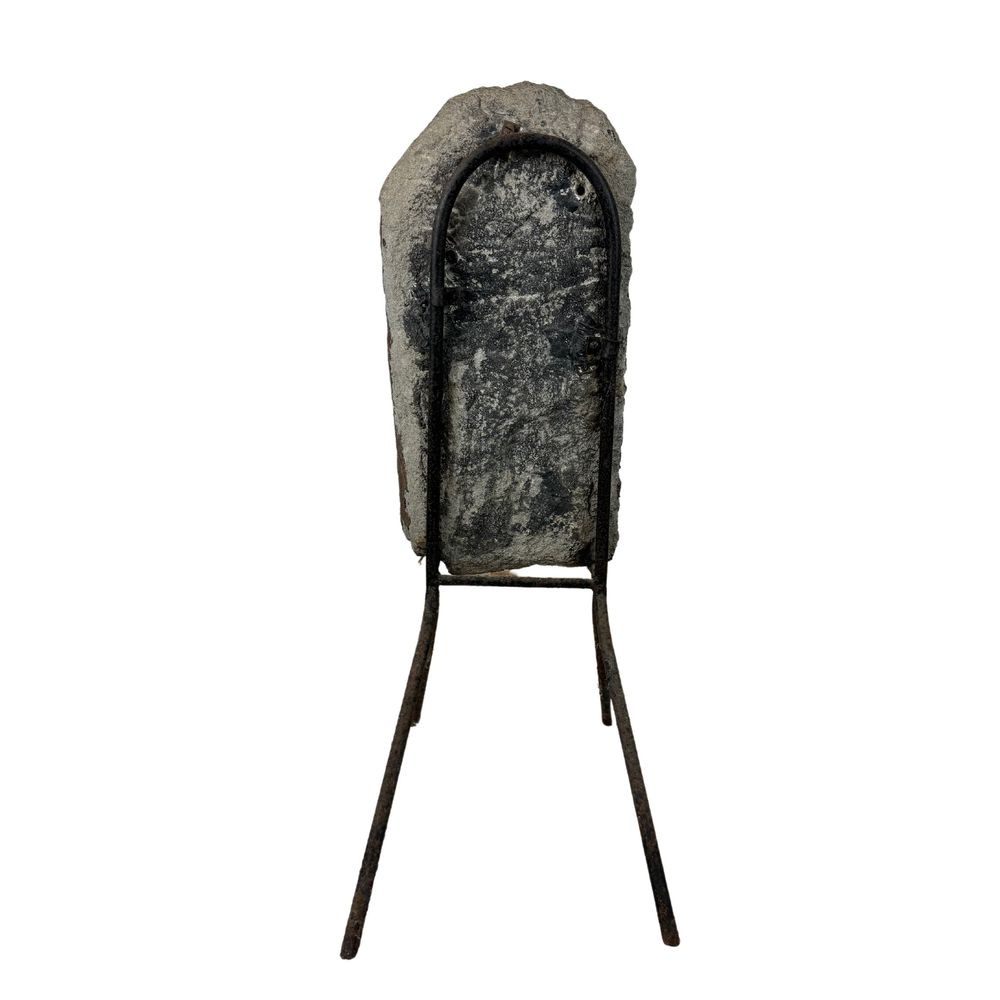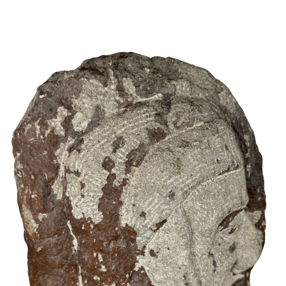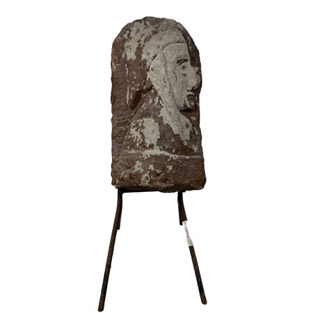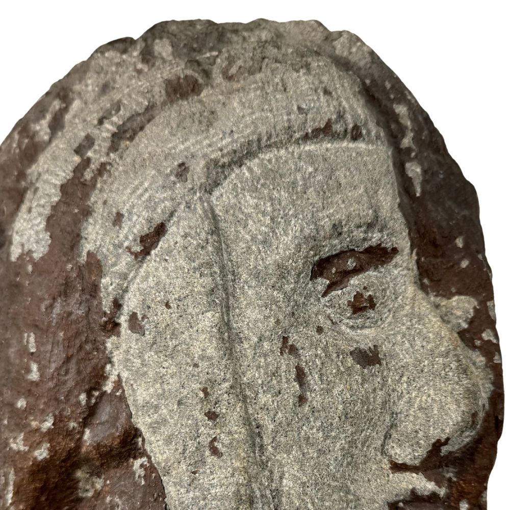 Scultura in pietra, periodo inizio XX secolo, raffigurante Testa non identificata, poggiante su base in ferro.