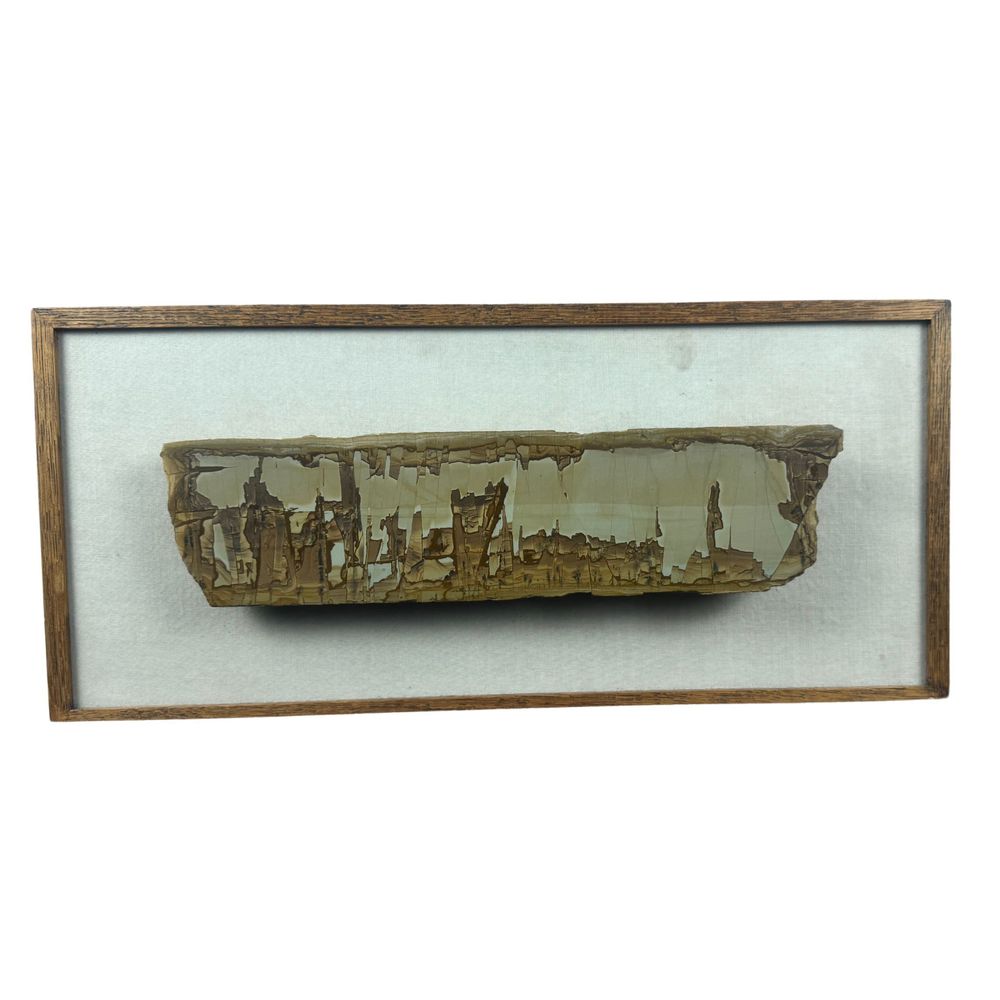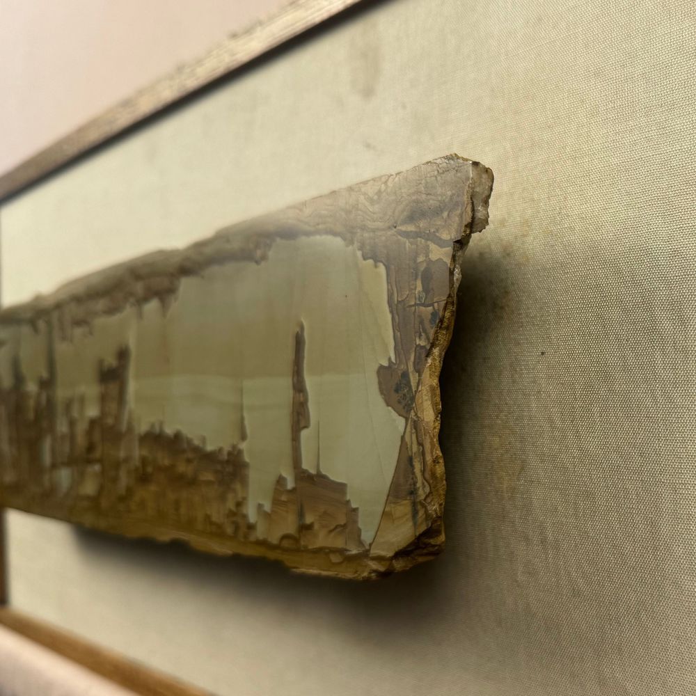 Pietra paesina poggiata su base in legno, periodo XIX/XX secolo. Dimensioni: 46x21 cm compreso cornice. Dimensioni pietra: 33x8 cm Presenta leggera lesione.