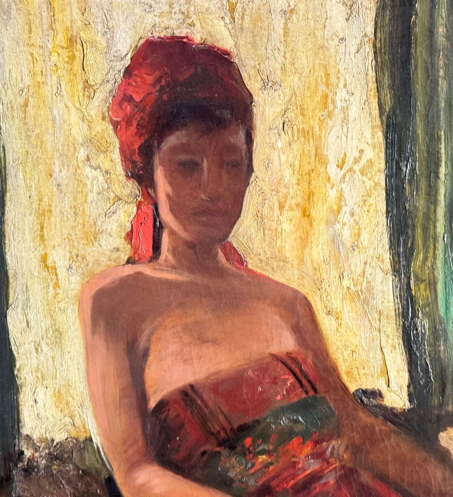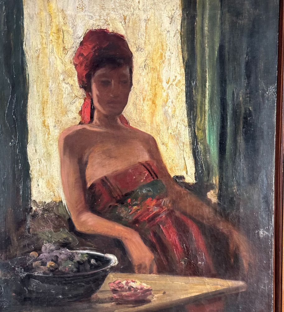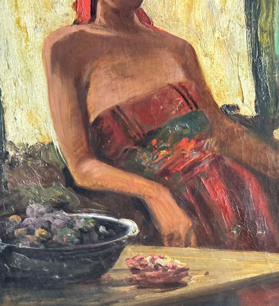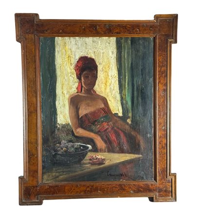 Dipinto olio su tela, periodo XIX/XX secolo scuola Italiana, raffigurante Donna in un interno. Dimensioni compreso cornice: 71x84 cm. Dimensioni interno cornice: 50x65 cm. Reca firma in basso a destra da artista non identificato. Opera in buone condizioni.