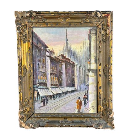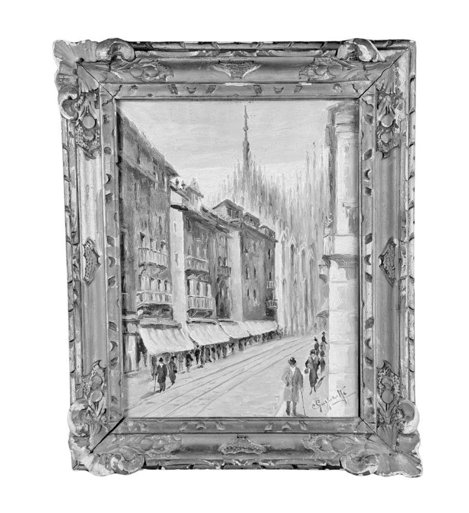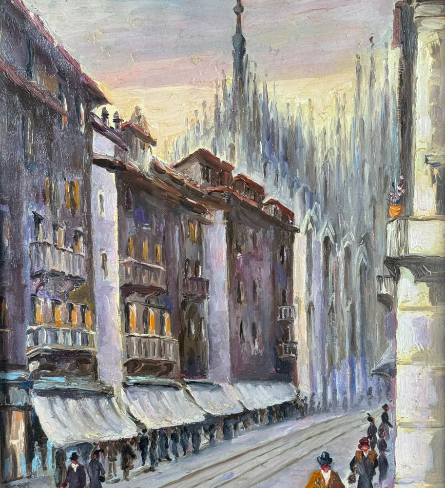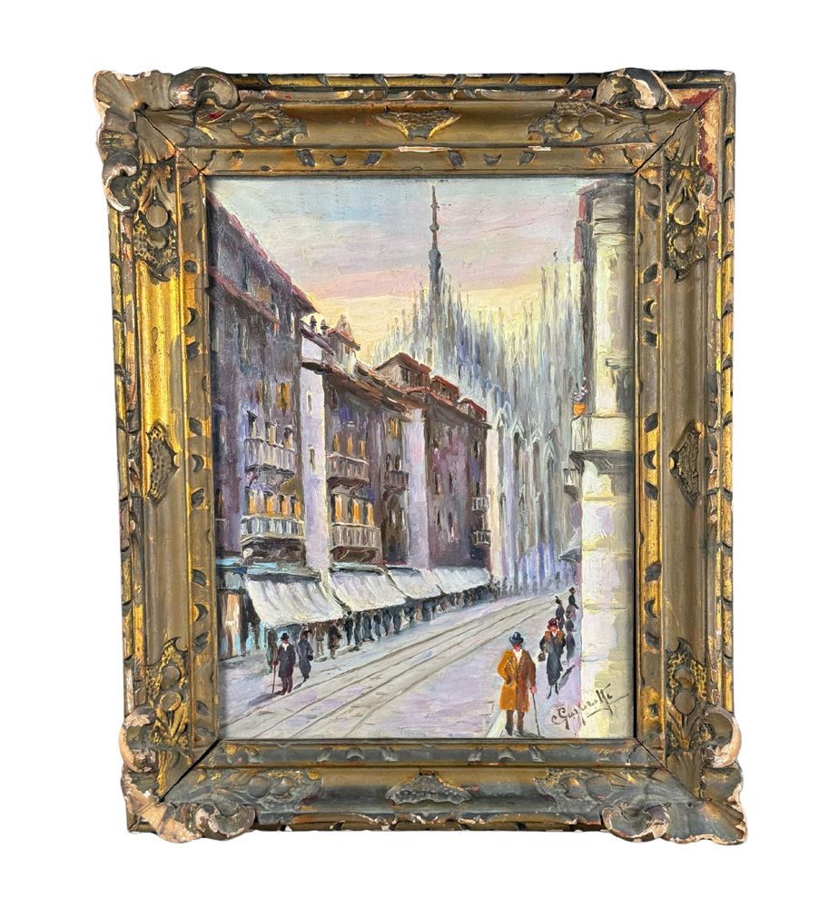 Dipinto olio su tela, periodo XX secolo scuola Italiana, raffigurante Milano. Dimensioni compreso cornice: 43x53 cm. Dimensioni interno cornice: 30x40 cm. Reca firma in basso a destra da artista non identificato. Opera in buone condizioni. Cornice difetti e mancanze.