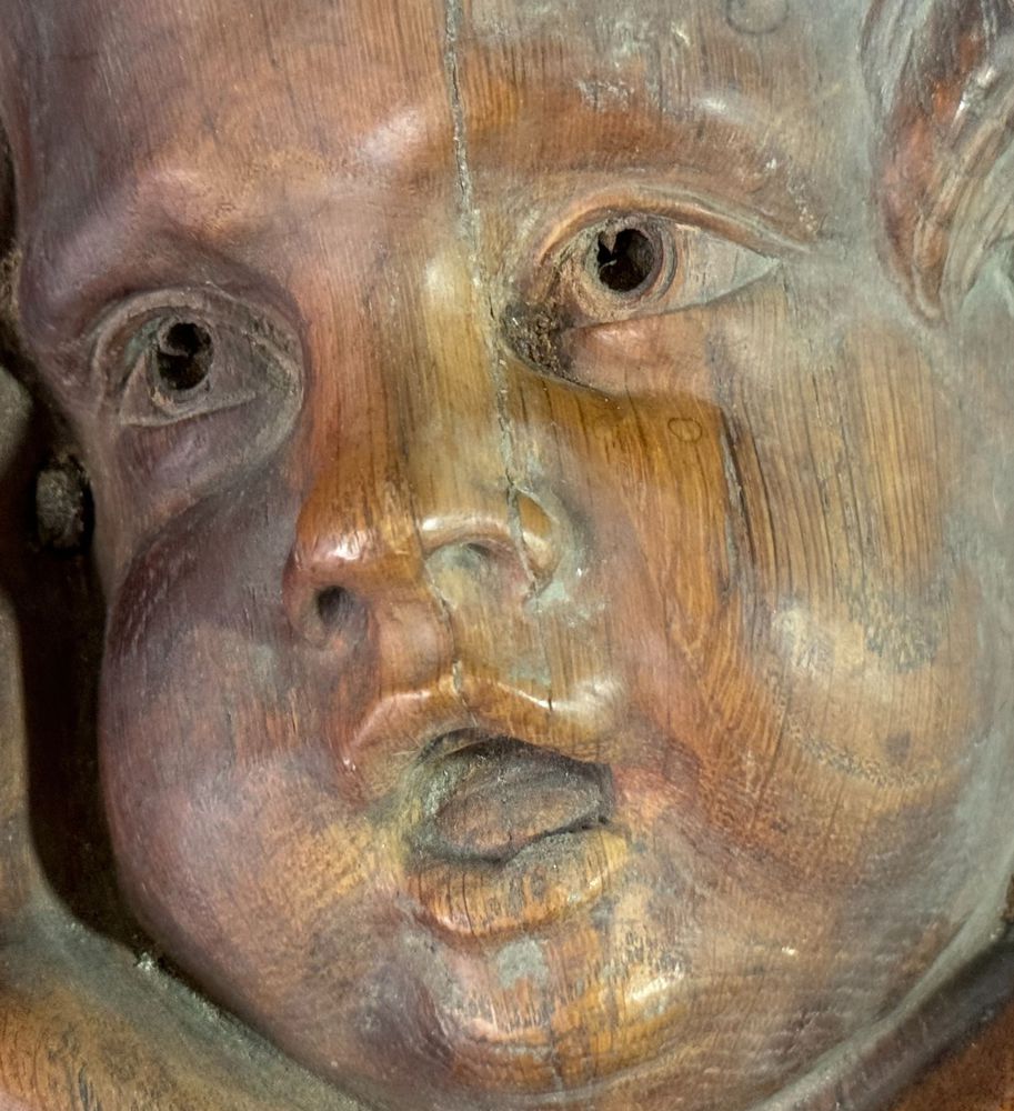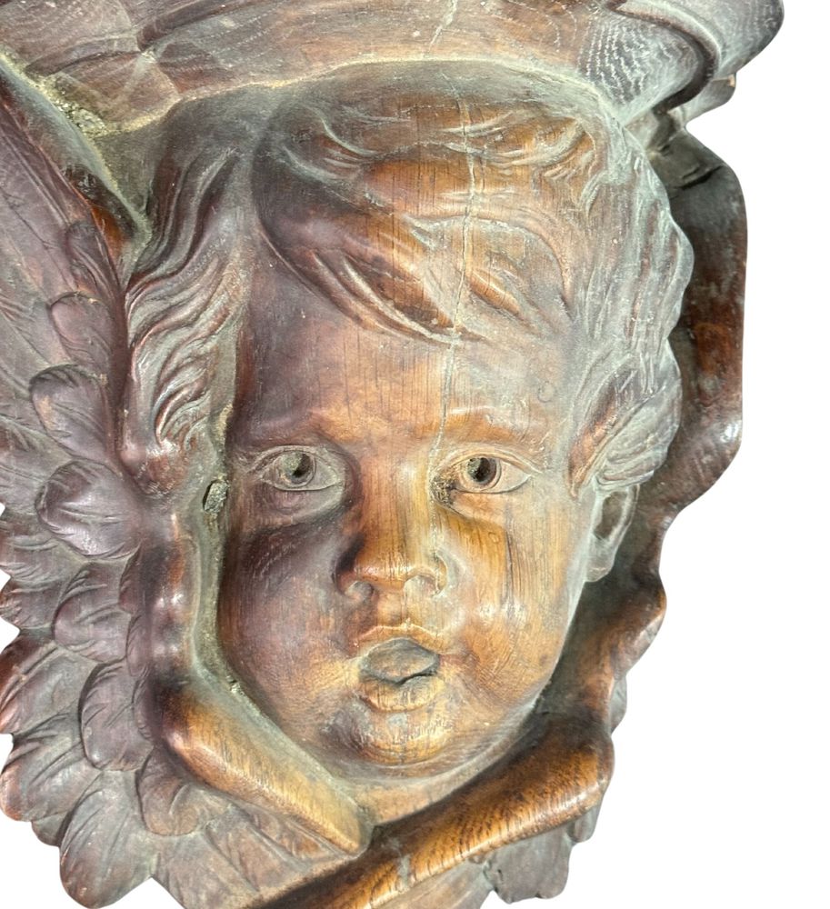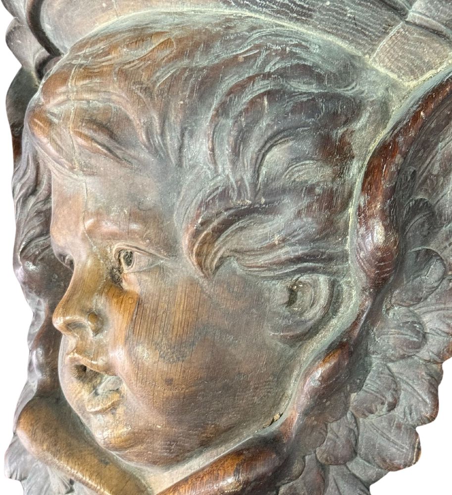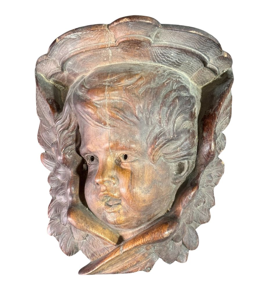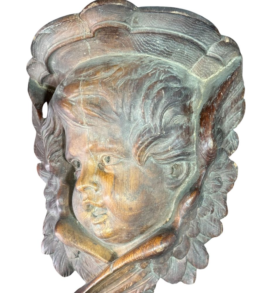 Scultura in legno intagliato a mano, periodo XIX secolo, raffigurante Puttino. Dimensioni: h26x25x16 cm. Scultura in buone condizioni.