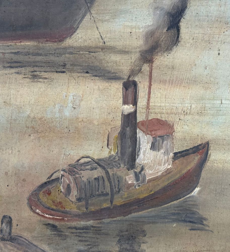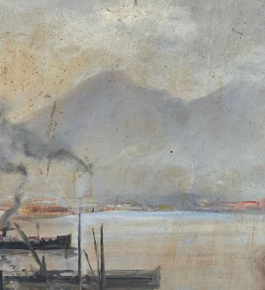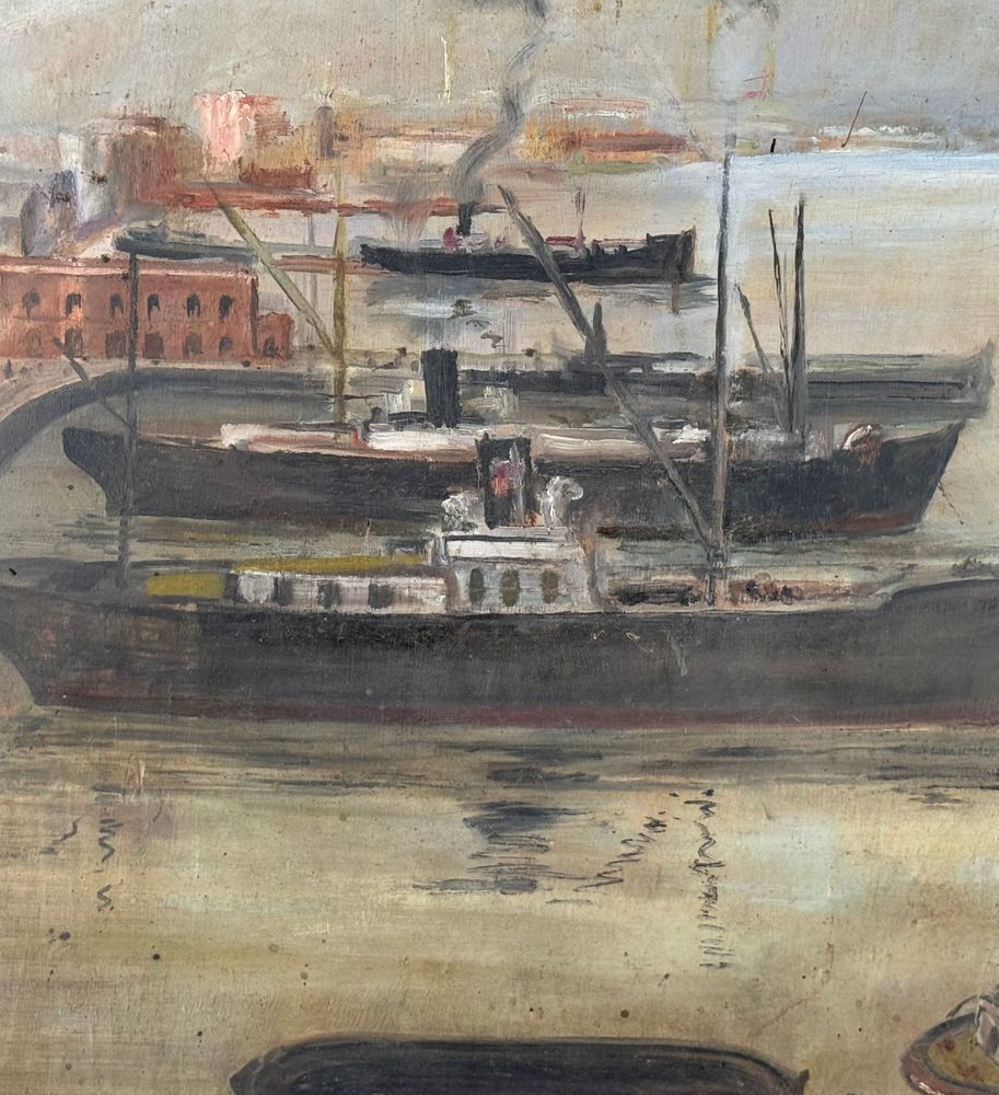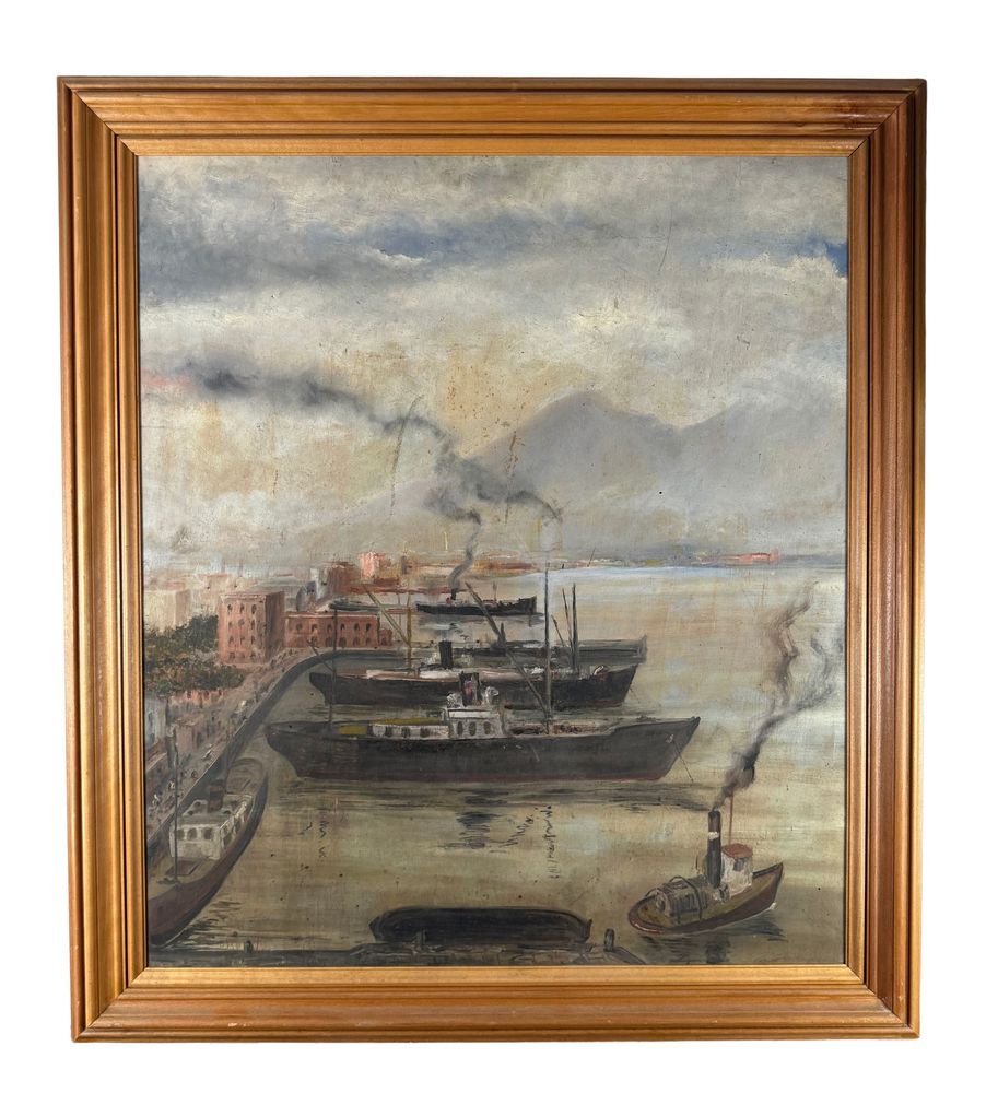 Dipinto olio su tavola, periodo XX secolo scuola napoletana, raffigurante Scorcio di porto napoletano. Dimensioni compreso cornice: 93,5x105 cm. Dimensioni interno cornice: 79x91 cm. Reca firma in basso a sinistra da artista non identificato. Opera in buone condizioni con lievi segni di vissuto come da foto allegate.