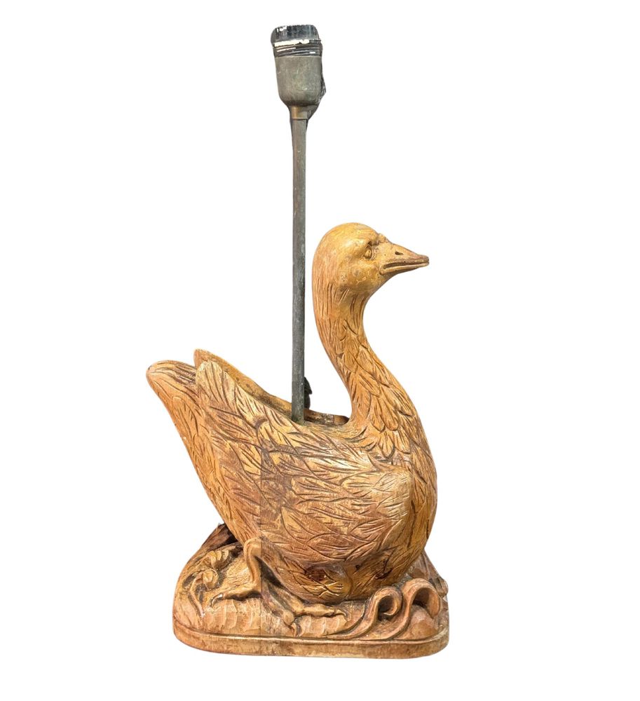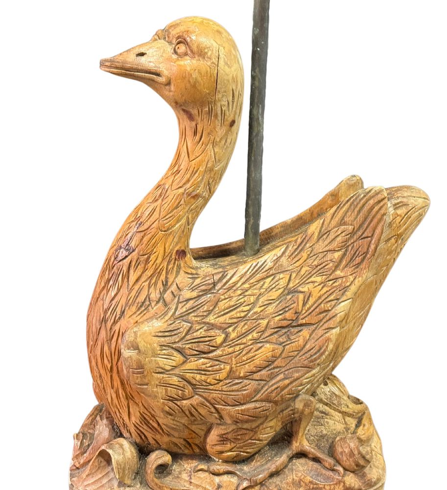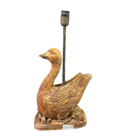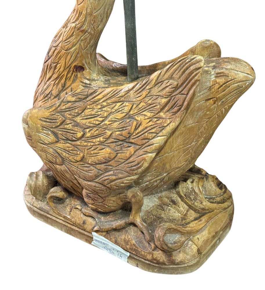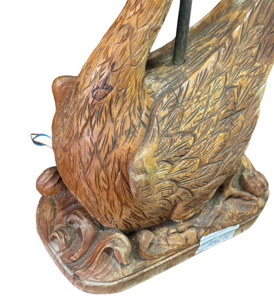 Lume con base in legno intagliata a mano, periodo XX secolo, base raffigurante Cigno. Dimensioni: h43x20x30 cm. Lume in buone condizioni con lievi segni di vissuto come da foto allegate.