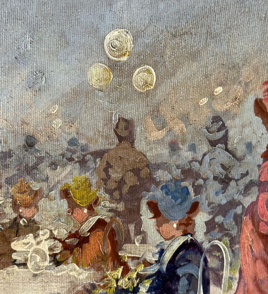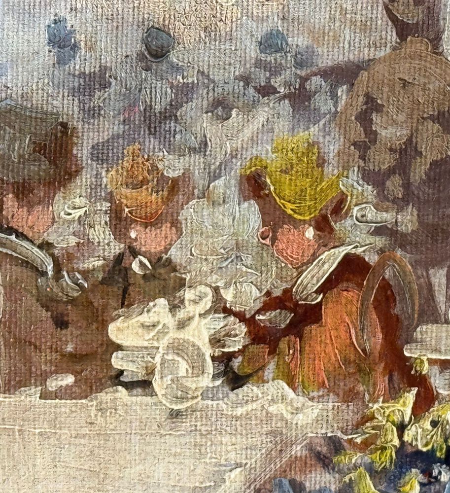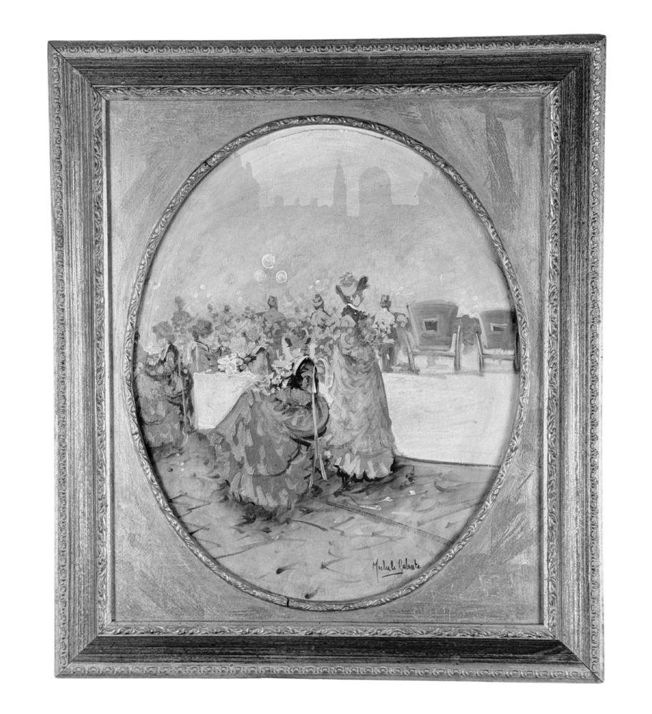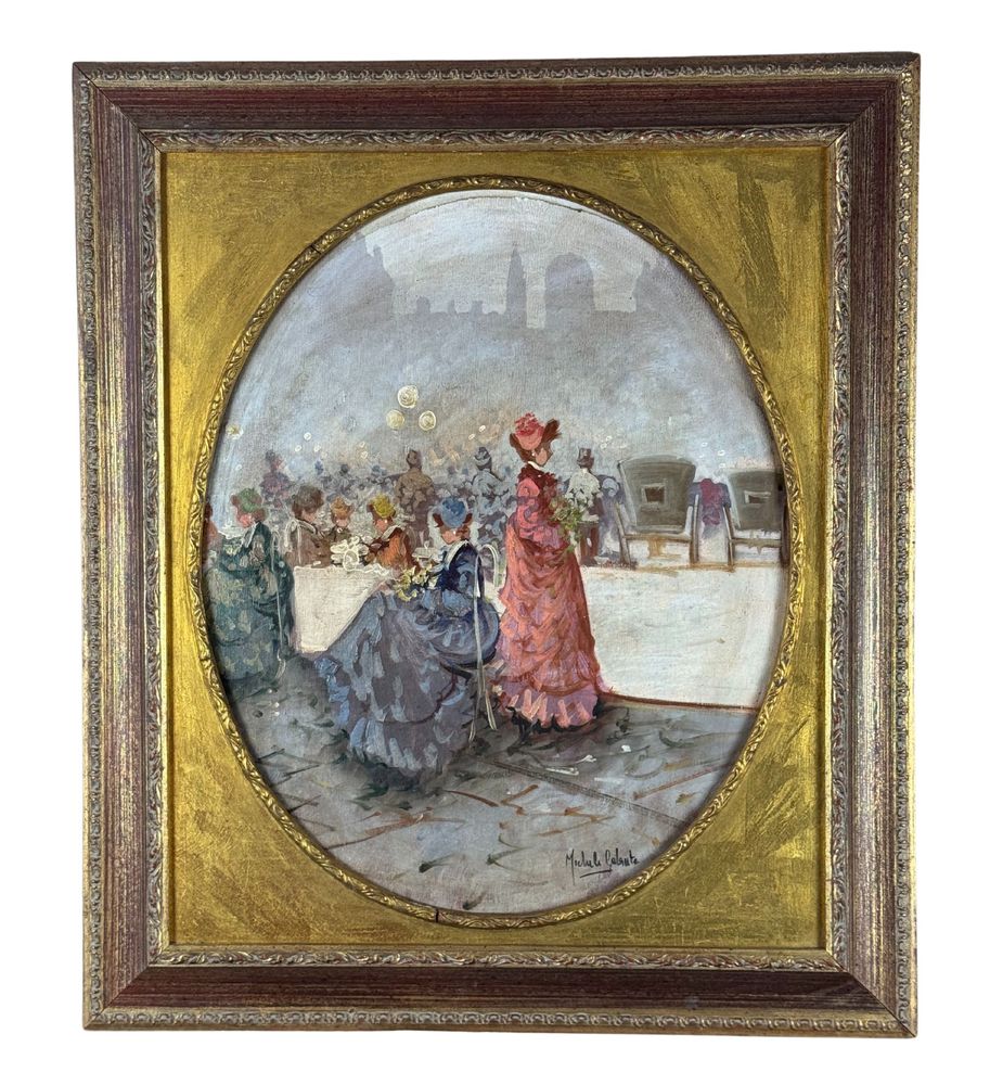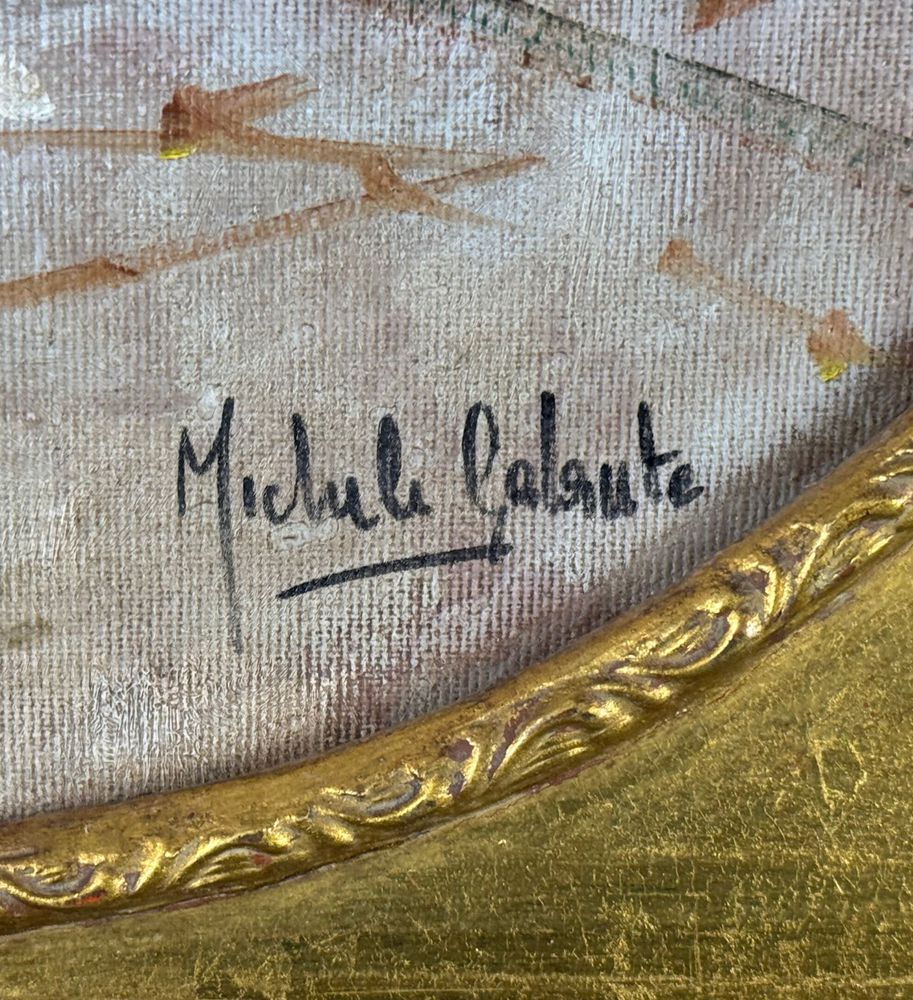 Dipinto olio su tela, periodo XX secolo scuola Italiana, raffigurante Personaggi. Dimensioni compreso cornice: 63x73 cm. Dimensioni interno cornice: 50x60 cm. Reca firma in basso a destra Michele Galante. Opera in buone condizioni.