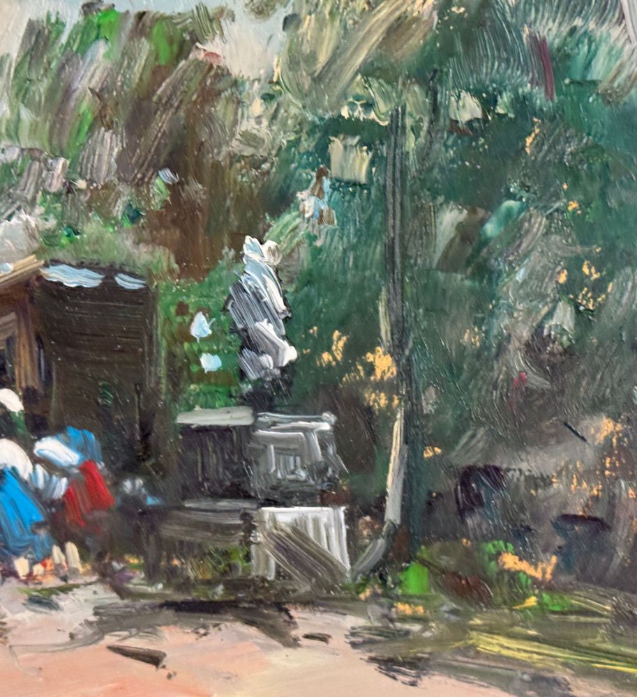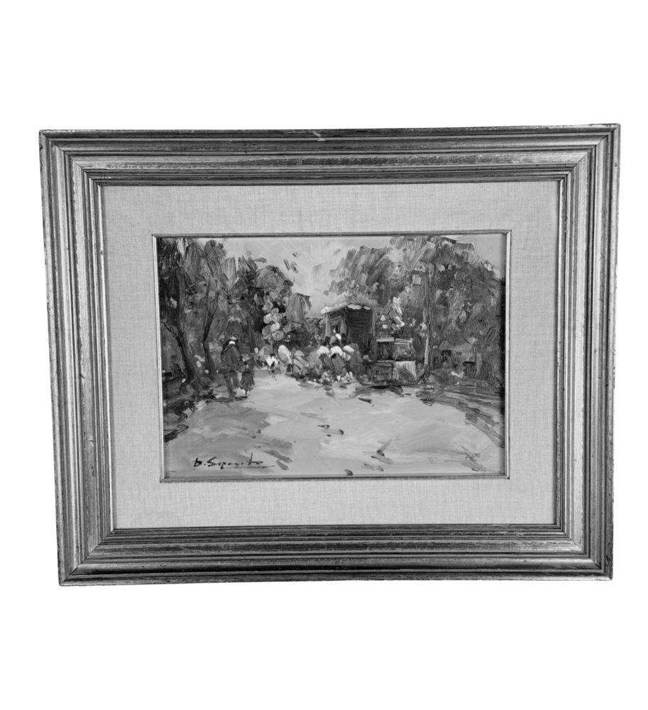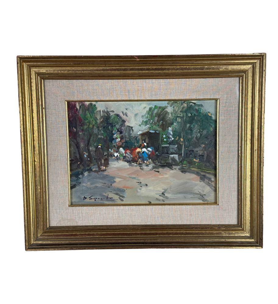 Dipinto olio su tavola, periodo XX secolo scuola Italiana, raffigurante Paesaggio con personaggi. Dimensioni compreso cornice: 54x43 cm. Dimensioni interno cornice: 25x35 cm. Reca firma in basso a sinistra artista non identificato. Opera in buone condizioni.