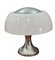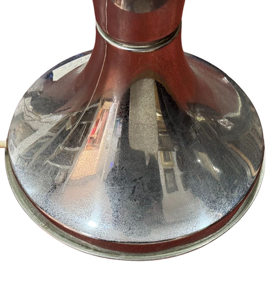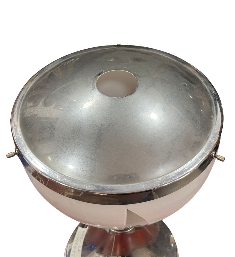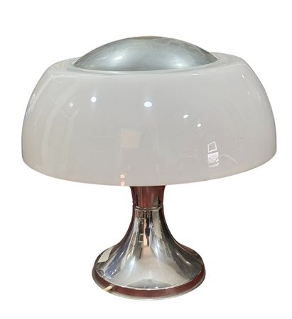 Lampada da tavolo in alluminio cromato e plexiglass. Anni '60-'70. Dimensioni: 40x42 cm. Rottura del globo interno come da foto allegate.