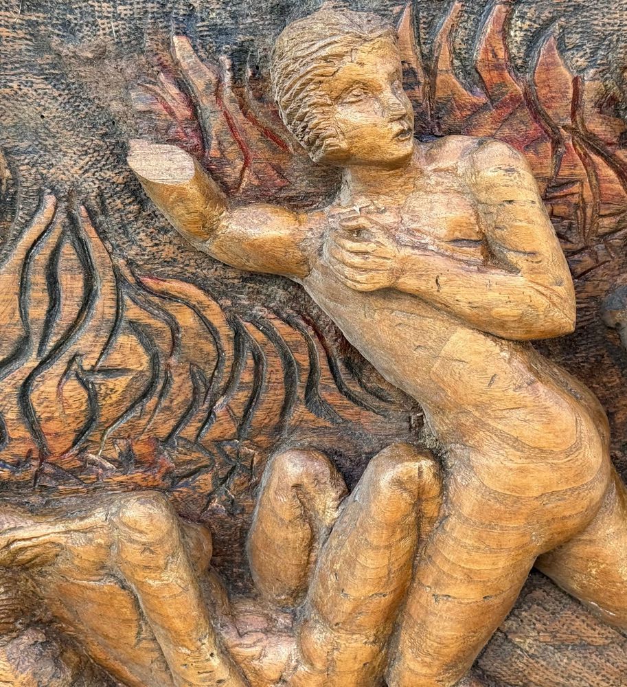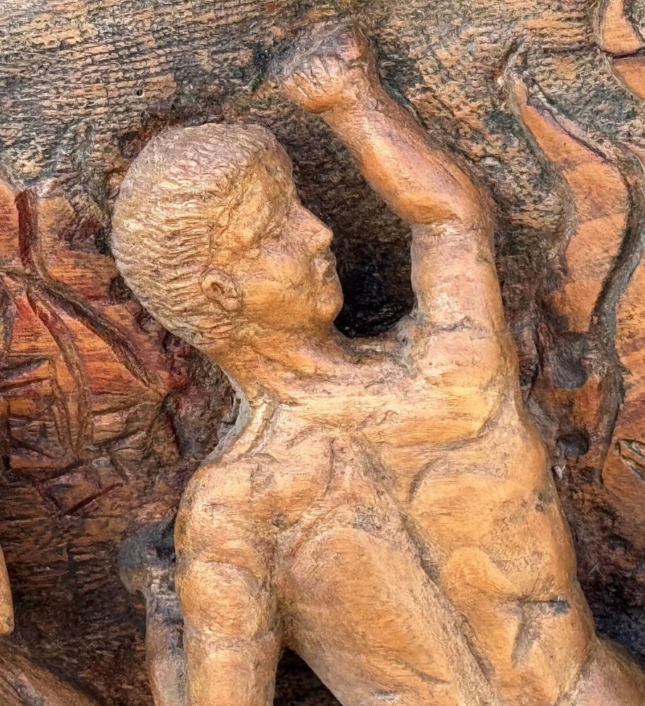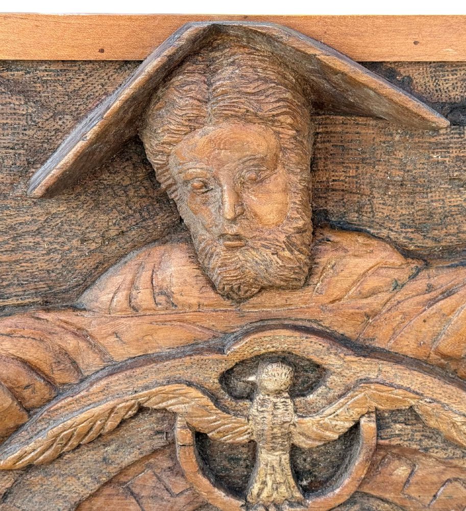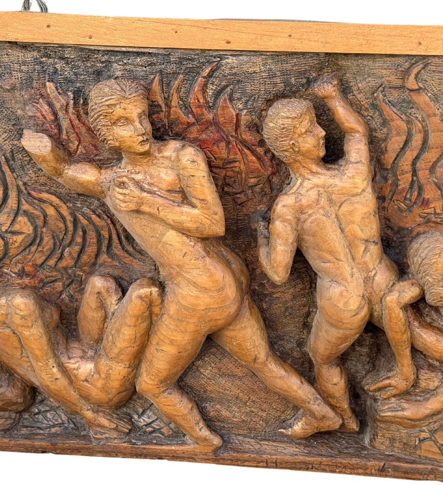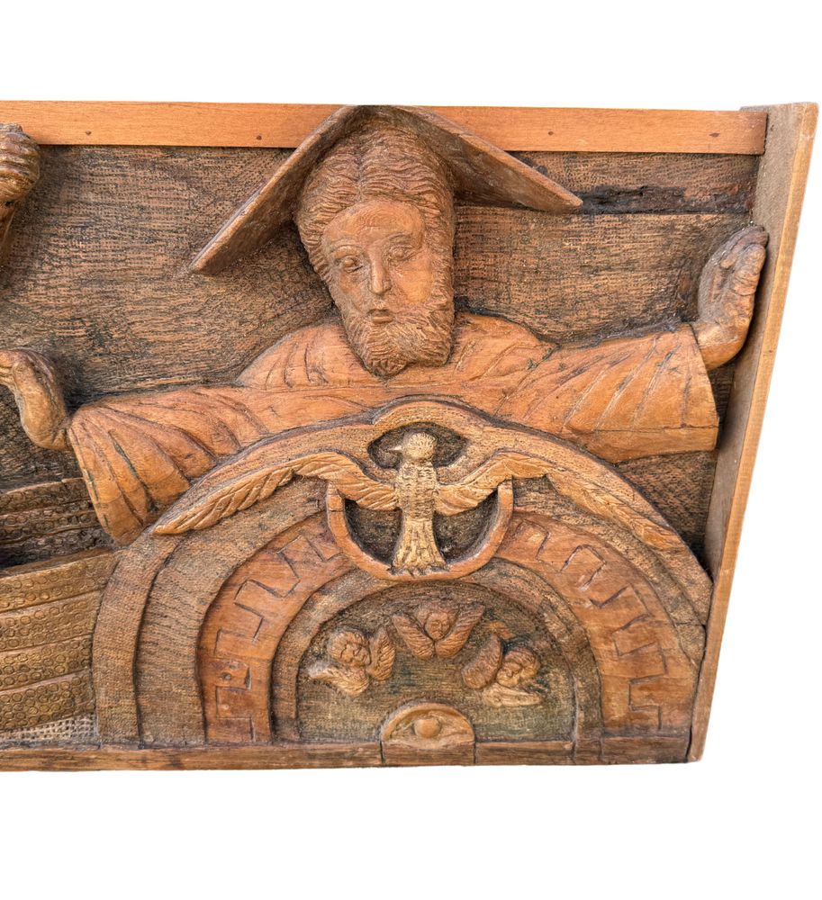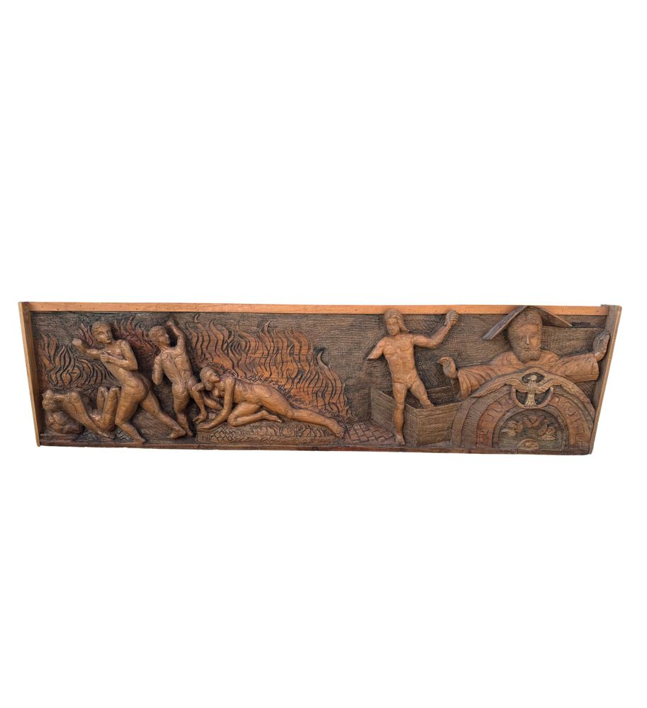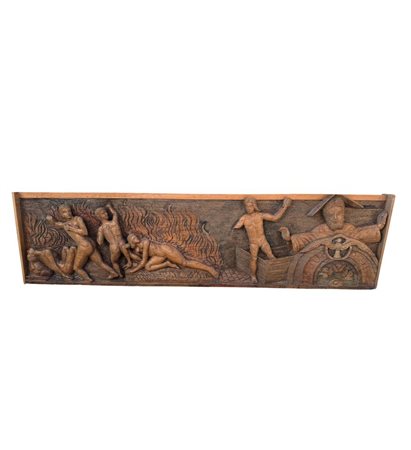 Pannello in legno scolpito a mano, periodo XIX/XX secolo raffigurante vari personaggi di scena biblica. Dimensioni: 167x42x9 cm. Difetti e mancanze.