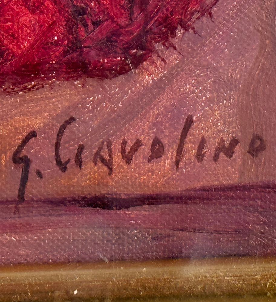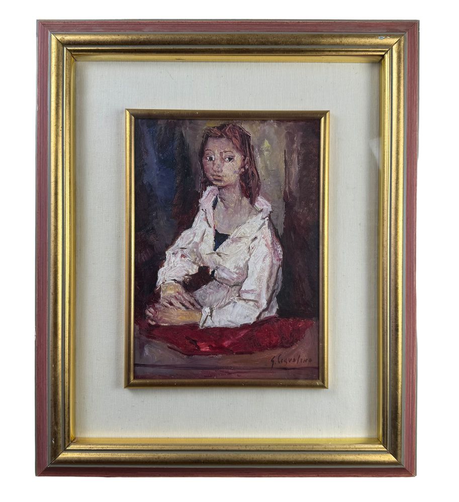 Dipinto olio su tela applicata su pannello, periodo XX secolo scuola Italiana, raffigurante Ritratto di giovane donna. Dimensioni interno cornice: 36x26,5 cm. Dimensioni compreso cornice: 61x50,5 cm. Reca firma in basso a destra da Giuseppe Ciavolino (1918 - 2011).