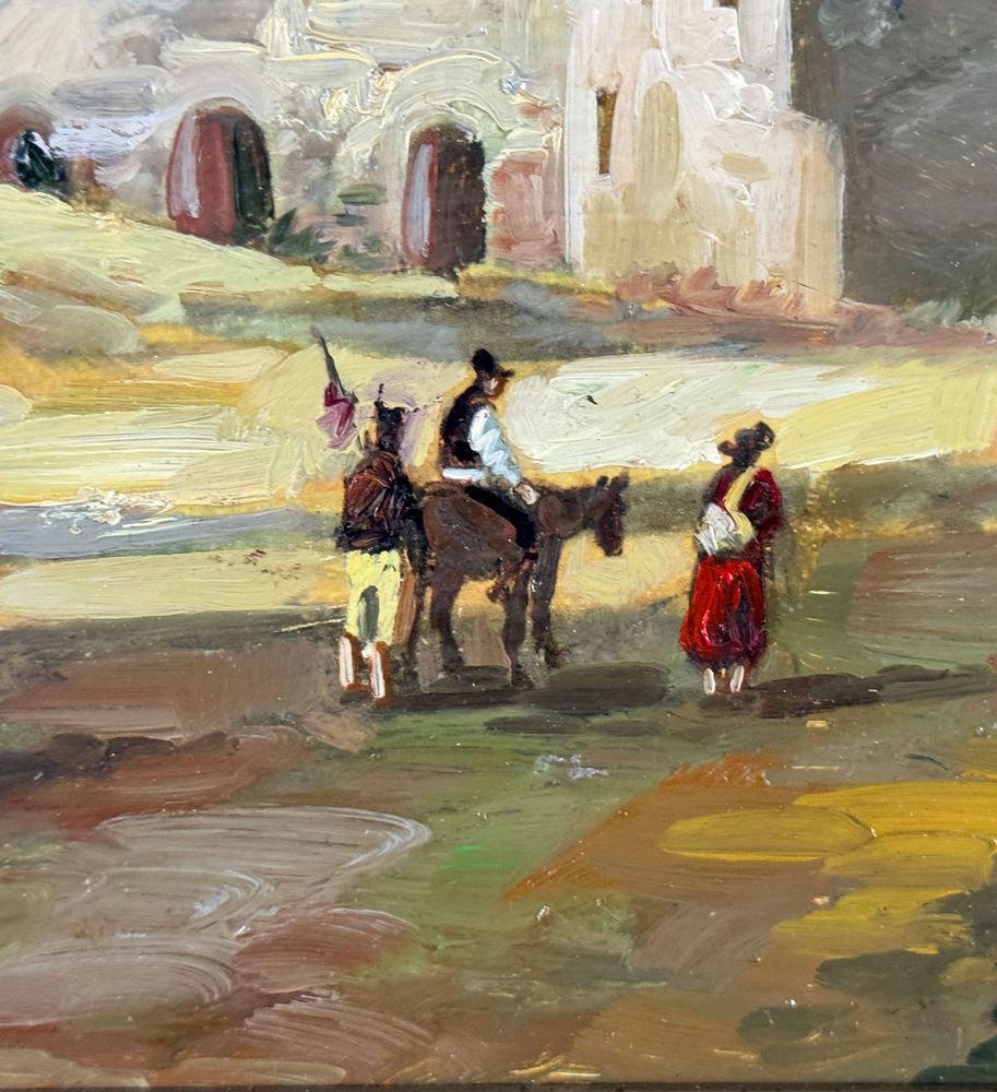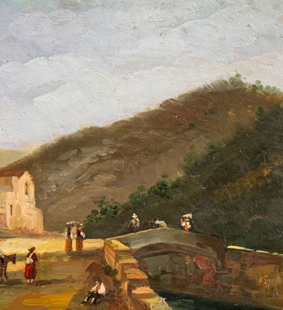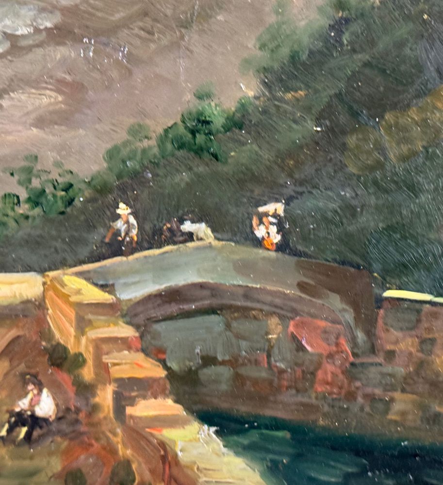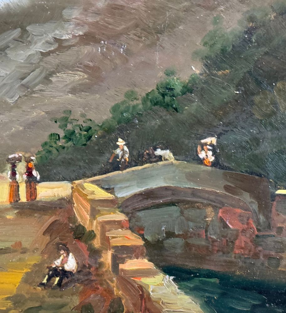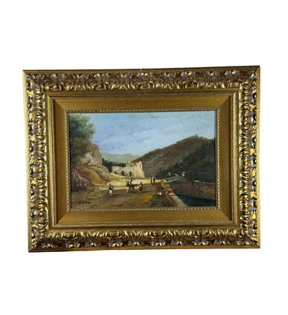 Dipinto olio su tavola, periodo XX secolo, scuola Italiana, raffigurante Paesaggio con ponte e personaggi. Dimensioni compreso cornice: 66x52 cm. Dimensioni interno cornice: 42x28 cm. Reca firma in basso a sinistra artista non identificato. Opera in buone condizioni.