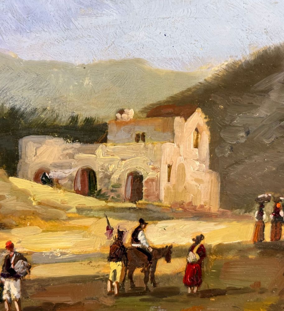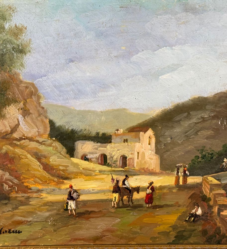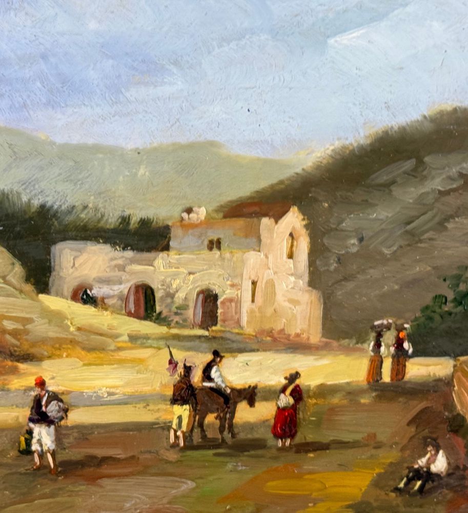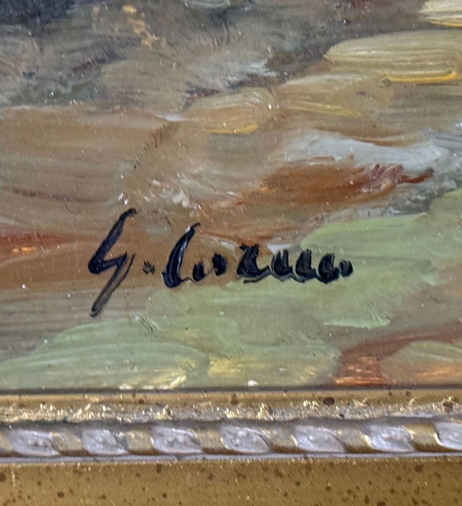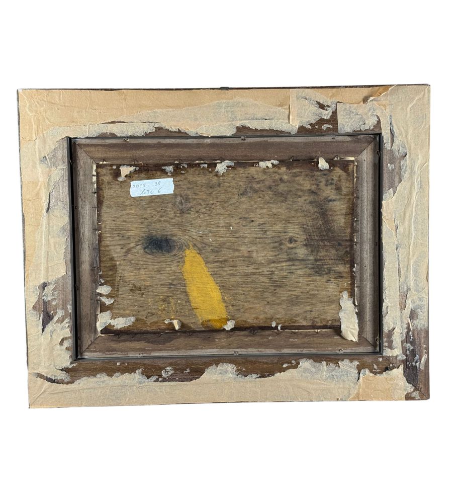 Dipinto olio su tavola, periodo XX secolo, scuola Italiana, raffigurante Paesaggio con ponte e personaggi. Dimensioni compreso cornice: 66x52 cm. Dimensioni interno cornice: 42x28 cm. Reca firma in basso a sinistra artista non identificato. Opera in buone condizioni.