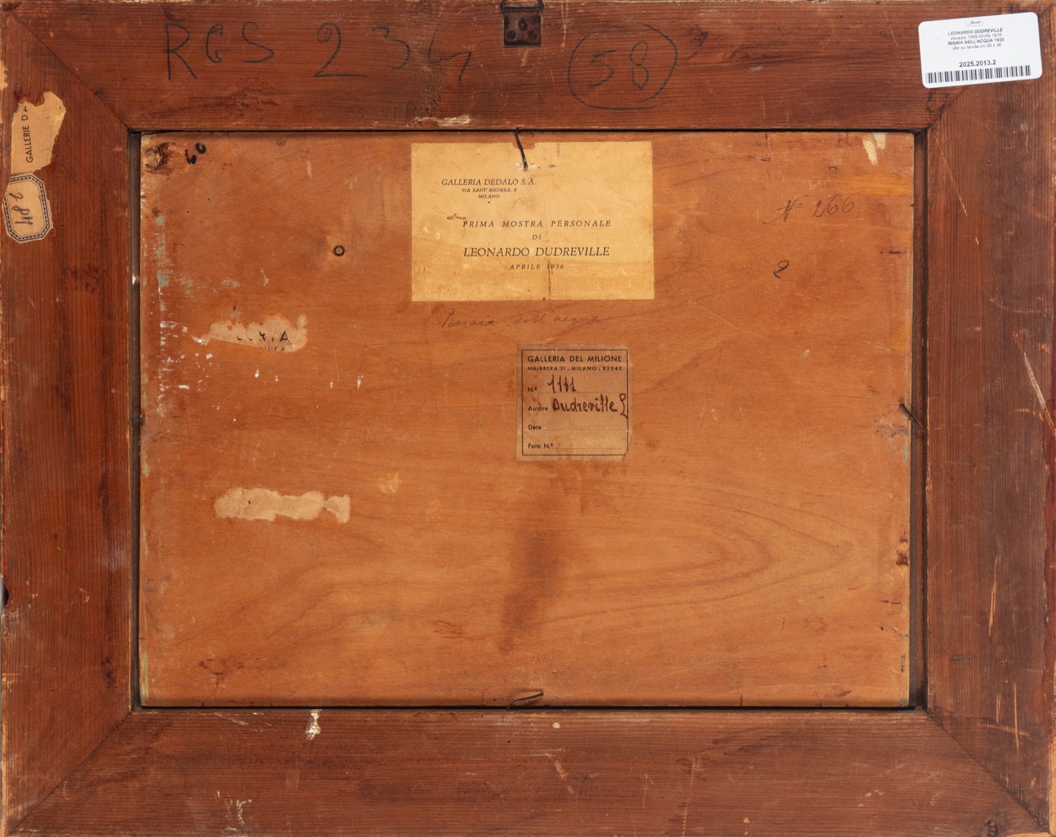 al retro, sulla tavola, titolato; etichette della Galleria Dedalo e della Galleria del Milone, Milano