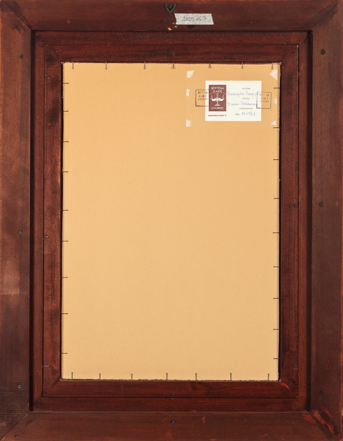 al retro, sul cartoncino di chiusura, timbri ed etichetta della Bottega d'Arte di Livorno