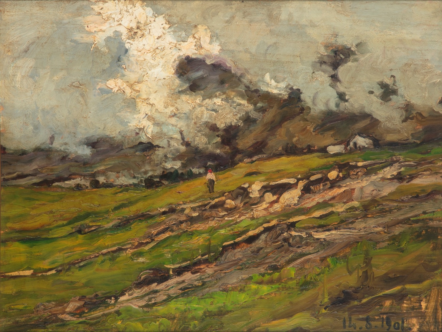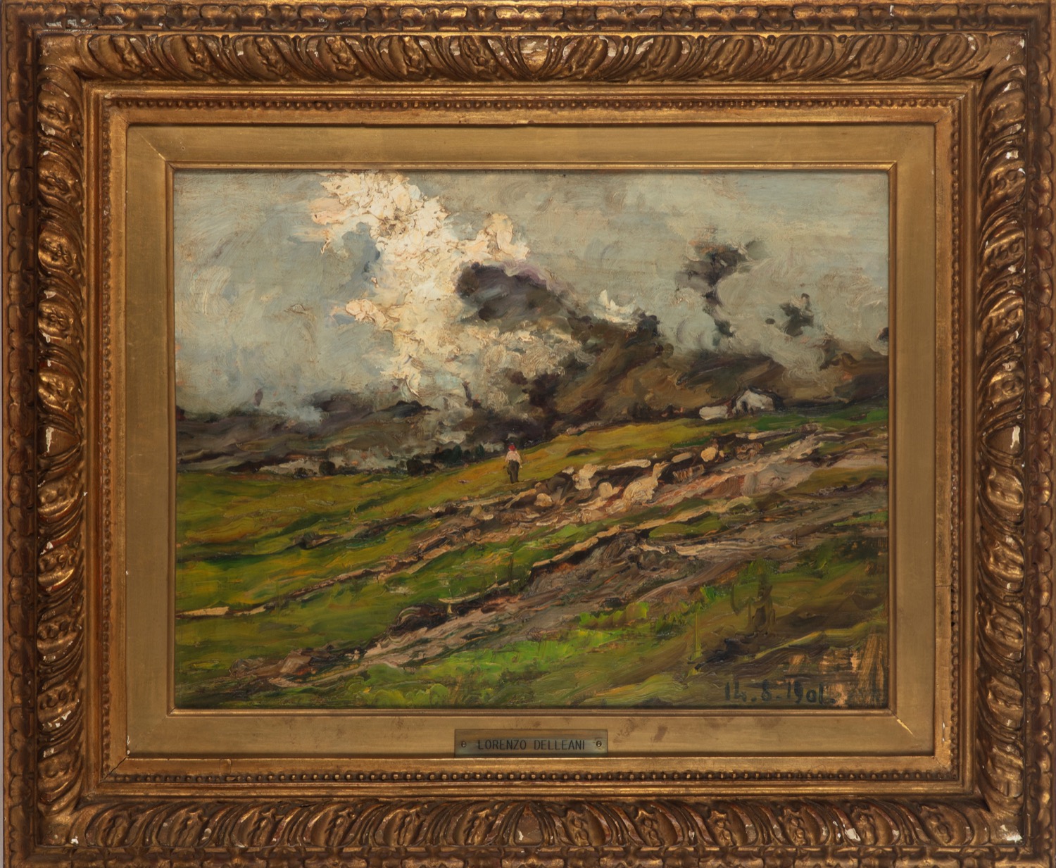 Lorenzo Delleani (Pollone 1840 - Torino 1908) - Paesaggio alpestre con figura, 1901