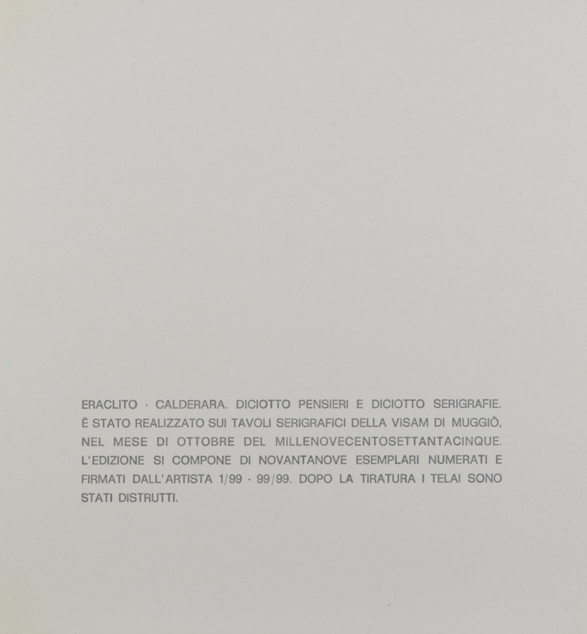 cartella completa contenente diciotto pensieri di Eraclito (tradotti dal greco da Carmine Benincasa) e diciotto serigrafie di Calderara.