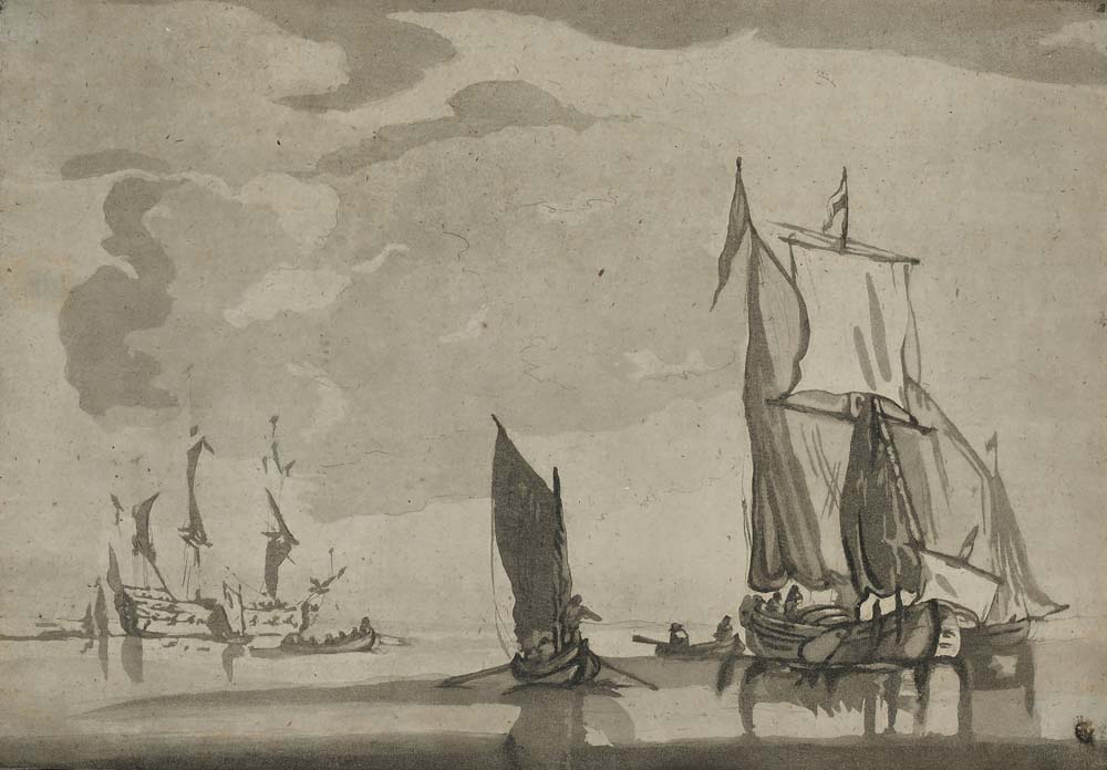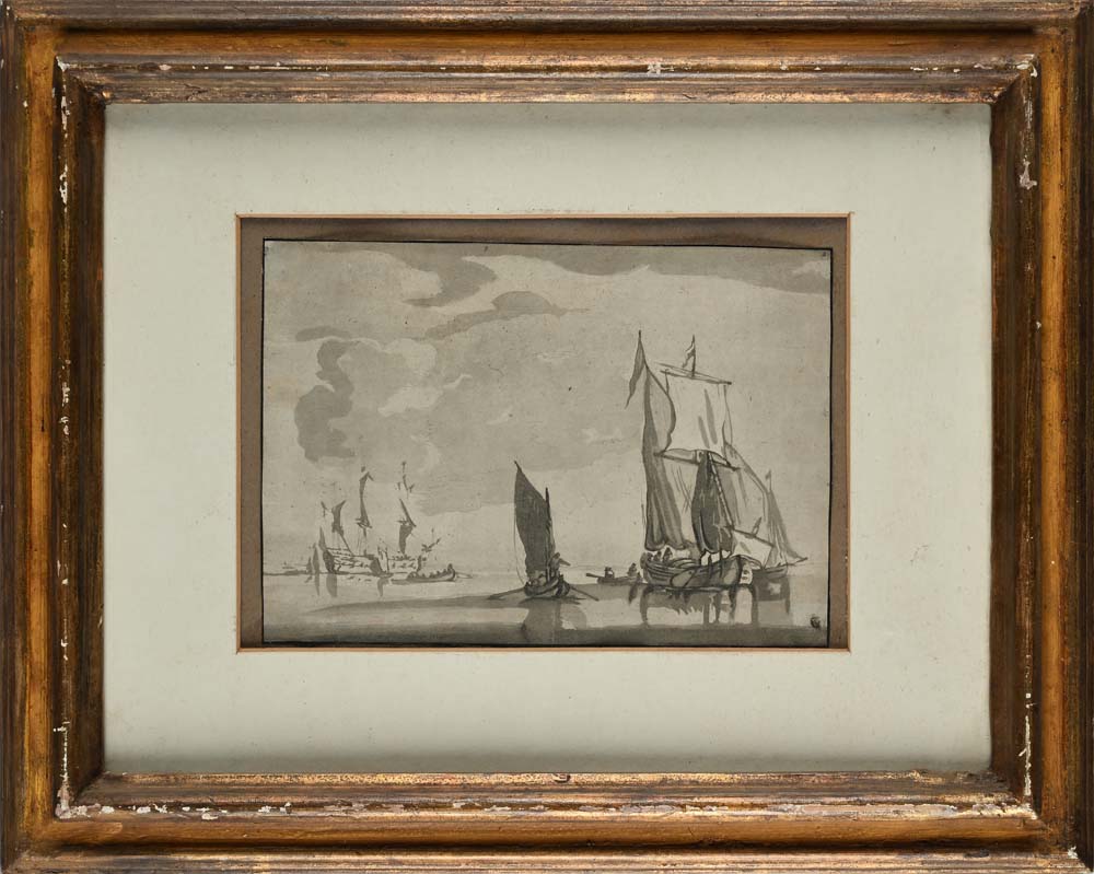 Willem van de Velde il Giovane (bottega di) Paesaggio con barche Inchiostro acquerellato su carta mm 165x230 - con cornice cm 36x45