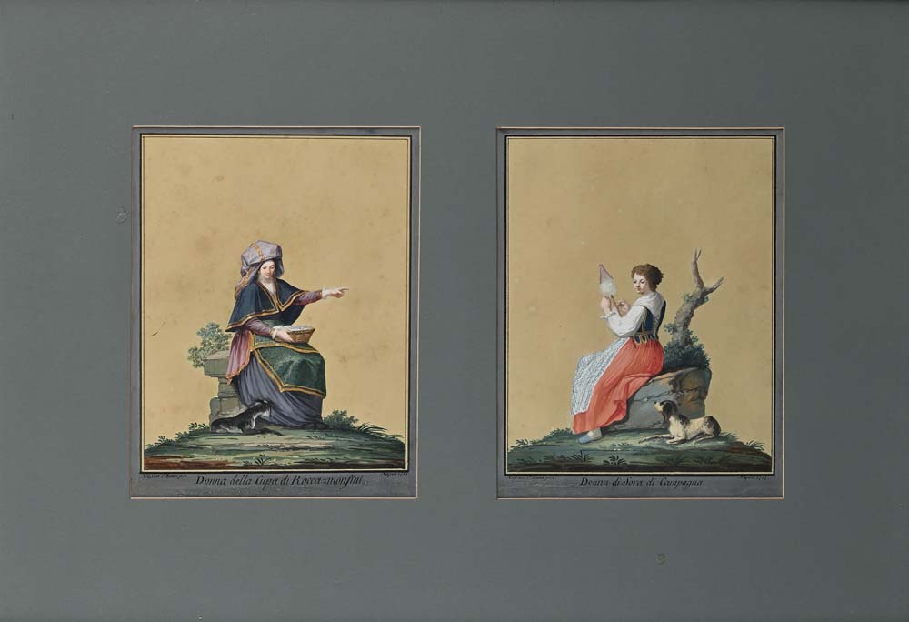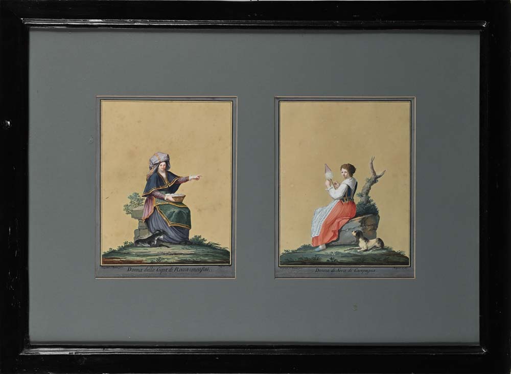 Alessandro D'Anna Donna della Cupa di Rocca Monfini; Donna di Sora di Campagna 1787 Firmati "Alessan. d'Anna pin." in basso a sinistra e datati "Napoli 1787" in basso a destra Tempere su carta mm 210x170 - con cornice cm 48x66