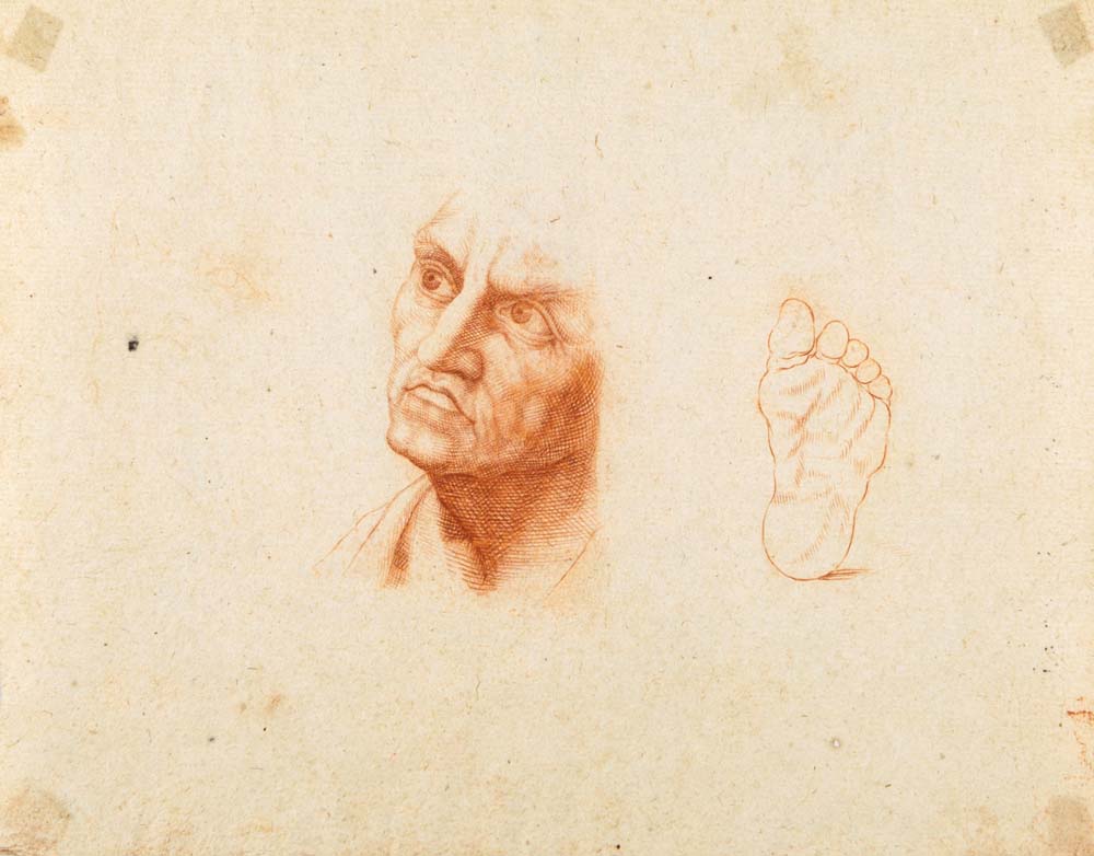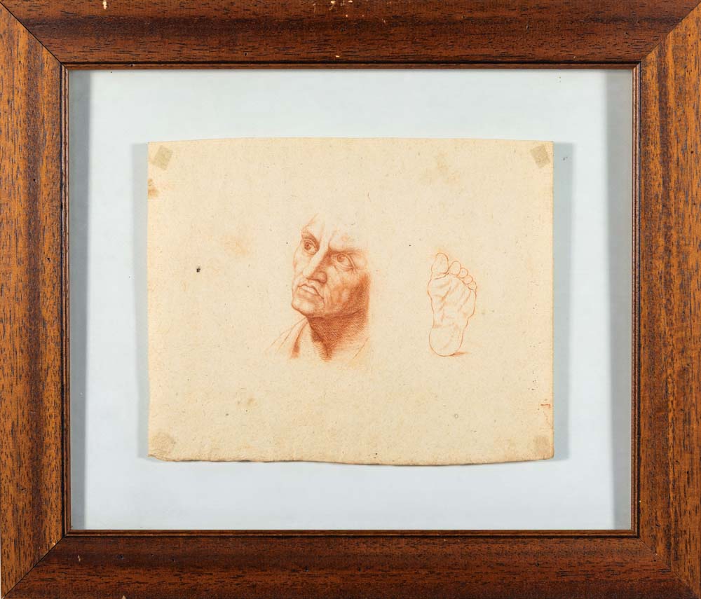Pittore Accademico degli inizi del XIX secolo Verso: Studio di volto e piede, Verso: Studi di piedi Sanguigna su carta mm 200x250 - con cornice cm 38x45