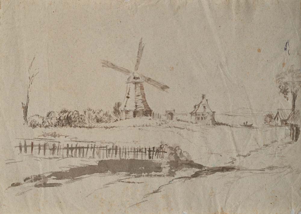 Scuola Fiamminga del XIX secolo Paesaggio olandese con mulino china su carta...