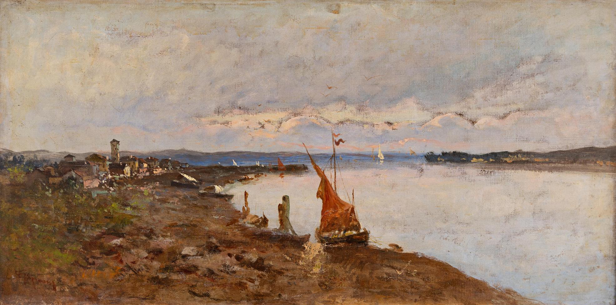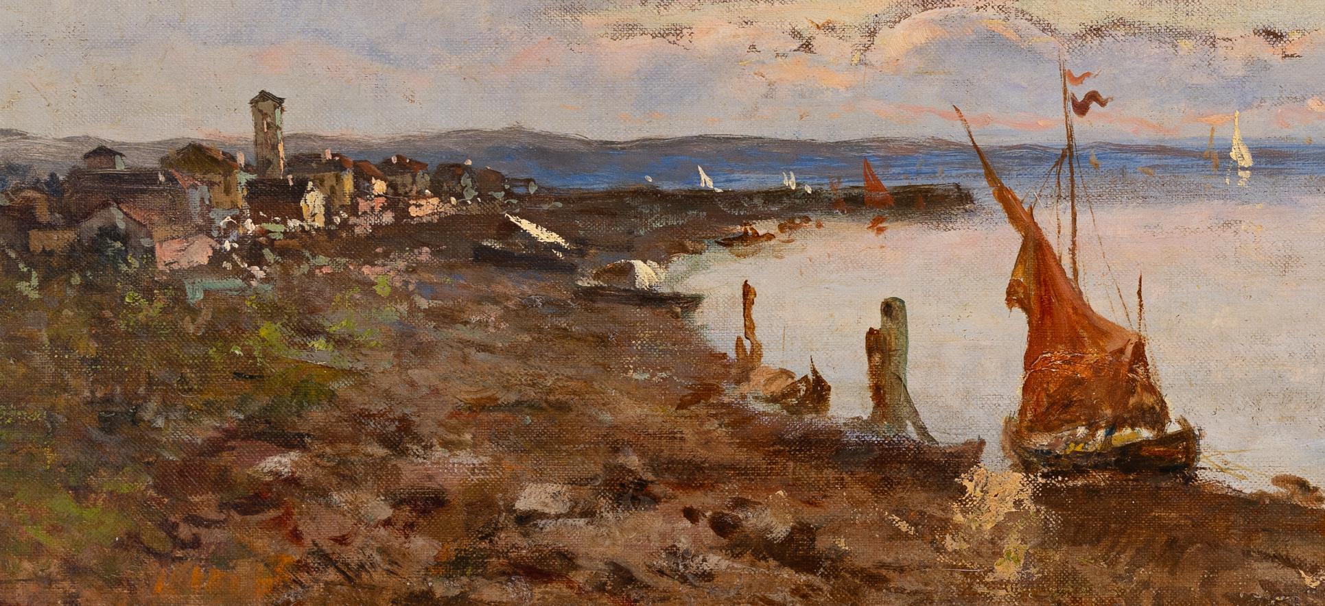 Lorenzo Gignous - Sesto Calende (1910) - Modena 1862 - Porto Ceresio (VA) 1958 - Olio su tela cm 45x90 - Lorenzo Gignous nacque a Modena nel 1862, ed è considerato uno dei principali esponenti della pittura paesaggistica italiana del XIX e XX secolo. Nipote del pittore Eugenio Gignous, intraprese gli studi all'Accademia di Belle Arti di Brera a Milano, dove affermò il suo talento per la pittura di paesaggio. Nel 1884, durante il suo periodo accademico, vinse il Premio Mylius per la pittura di paesaggio storico, con una veduta di Sesto Calende sul Lago Maggiore, che ricordava lo sbarco di Garibaldi e dei Cacciatori delle Alpi nel maggio del 1859. Questo tema divenne ricorrente nella sua produzione artistica, caratterizzata da un forte naturalismo.Nel corso della sua carriera, Gignous partecipò alle principali esposizioni nazionali, distinguendosi soprattutto per le sue rappresentazioni del Lago Maggiore, che dipinse frequentemente en plein air, spesso durante i soggiorni a Stresa con lo zio Eugenio, che si era trasferito in quella località nel 1887. La sua arte rifletteva una visione intima e dettagliata dei paesaggi naturali, contribuendo a consolidare la sua reputazione come paesaggista.Fino al 1922, oltre alla sua carriera pittorica, Gignous lavorò anche presso le Ferrovie dello Stato, un impiego che gli permise di entrare in contatto con importanti ambienti pubblici, ottenendo anche commissioni ufficiali. Lorenzo Gignous morì nel 1958 a Porto Ceresio, lasciando un'eredità significativa nel panorama della pittura italiana.