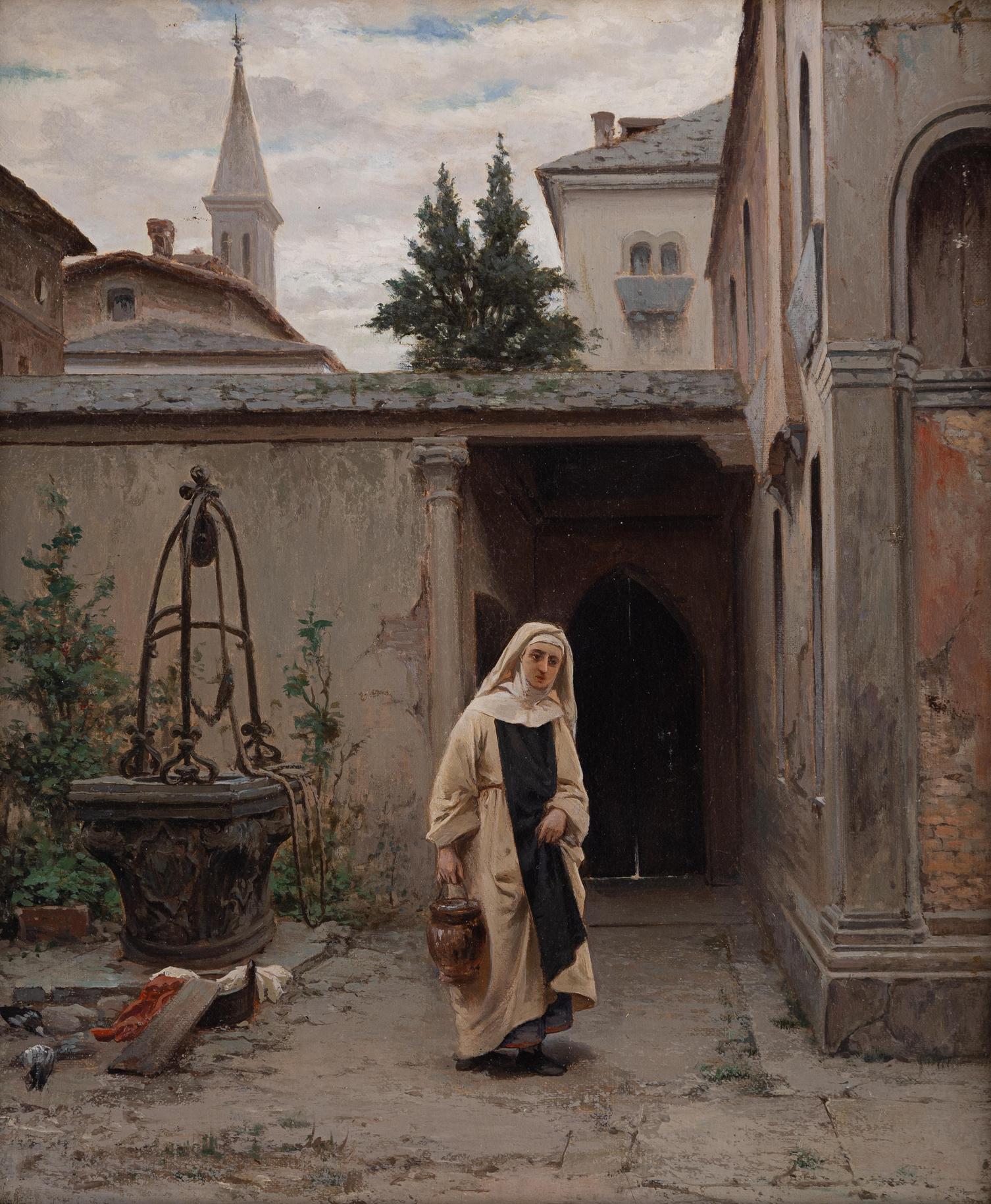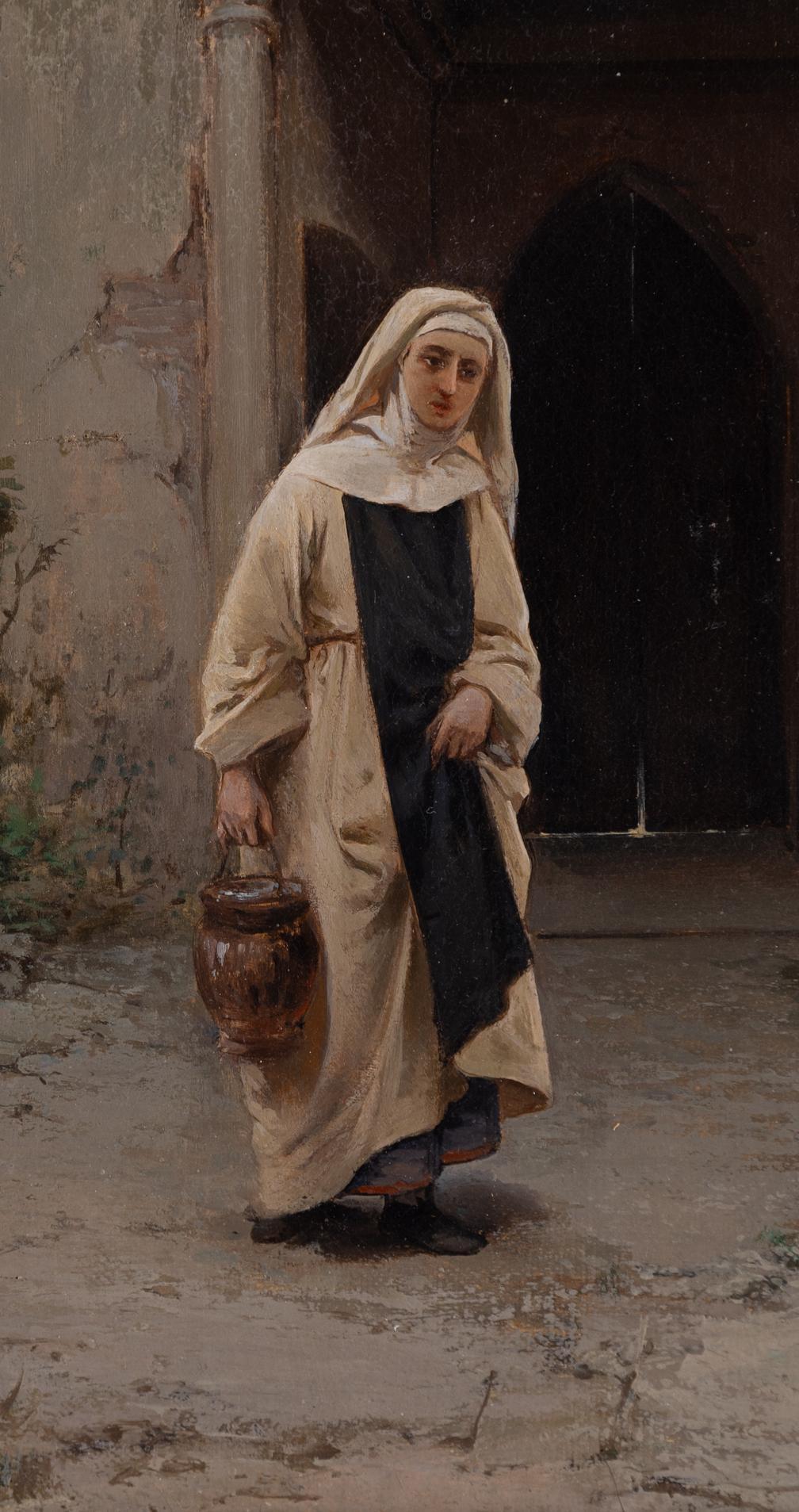 Lodovico Raymond - Nel convento - Torino 1825 - 1898 - Olio su tela cm 46x38 - Lodovico Raymond nacque a Torino nel 1825 e morì nel 1898. Si formò all'Accademia Albertina di Torino sotto la guida di Carlo Arienti. Successivamente, si trasferì a Firenze, dove soggiornò per cinque anni e venne in contatto con il gruppo dei Macchiaioli, un movimento artistico che influenzò profondamente la sua produzione. Nel 1861 partecipò all'Esposizione Nazionale di Firenze con un'opera a carattere monastico, tema che avrebbe caratterizzato gran parte della sua carriera. Molti dei suoi lavori furono acquistati dalla Casa Reale, e negli anni '70 realizzò una serie di opere ambientate nell'atmosfera veneziana, città che visitò più volte. Oltre a dipingere paesaggi e vedute, si dedicò anche alla rappresentazione di scene storiche e letterarie. Le sue opere sono oggi conservate in collezioni pubbliche e private, e continuano a essere apprezzate per la loro raffinatezza e sensibilità artistica.
