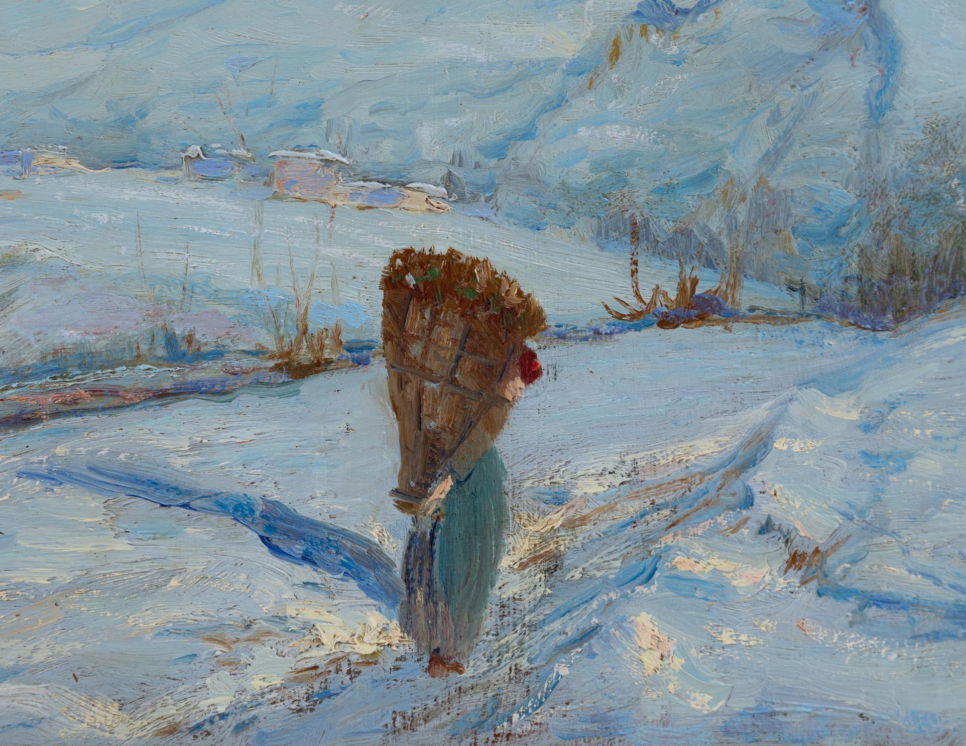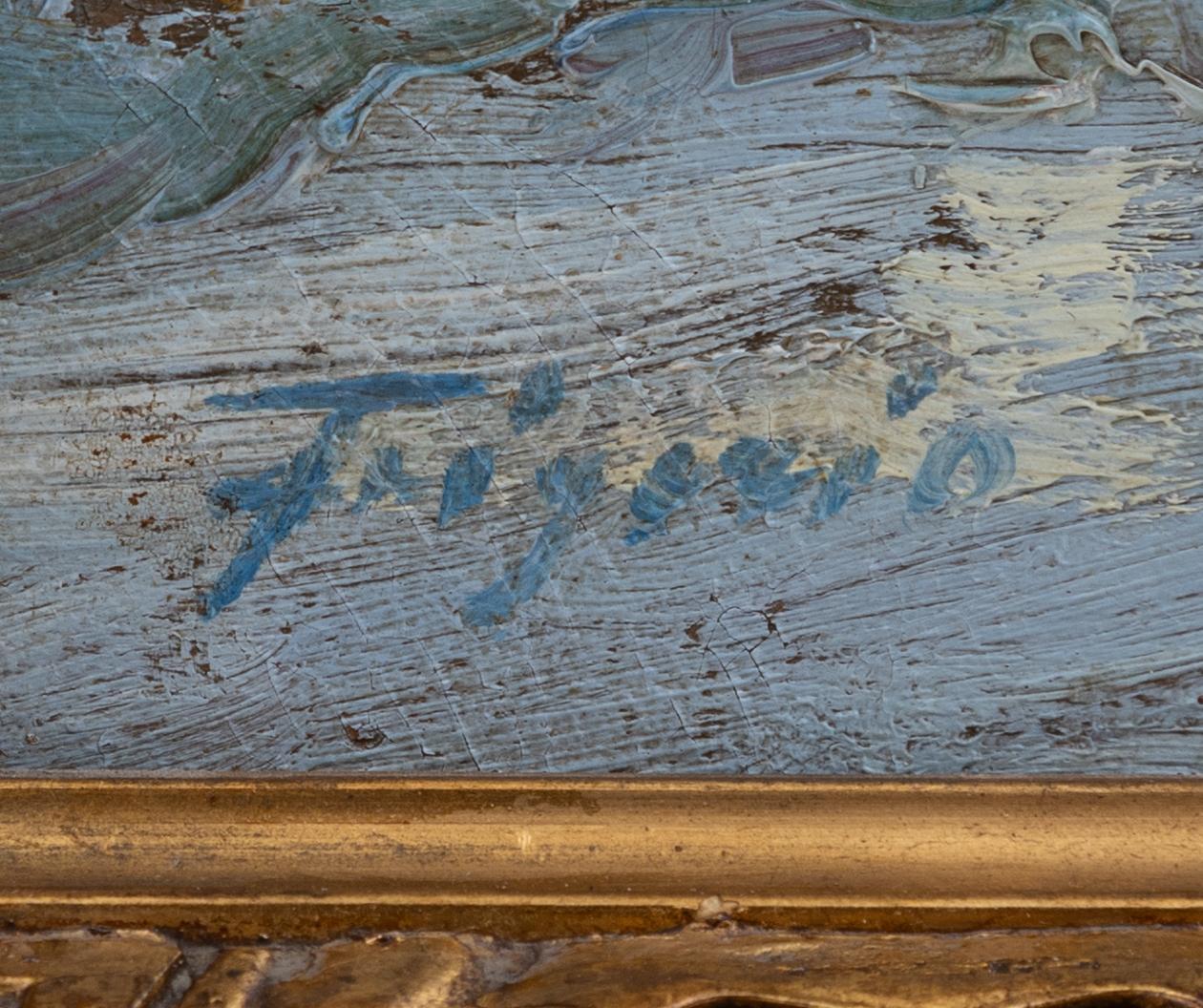 Luigi Frigerio - Paesaggio innevato - Milano 1873 - 1936 - Olio su tavola cm 44,5x60 - Luigi Frigerio nacque a Milano il 28 dicembre 1873 e si distinse come pittore autodidatta, sviluppando una particolare predilezione per il paesaggio. La sua arte si caratterizzò per la rappresentazione di scene di vita quotidiana, paesaggi marini e vedute urbane, spesso ispirate dalla luce e dall'atmosfera dei luoghi che dipingeva. L’uso di tecniche come l'olio, la tempera e il pastello gli permise di esplorare vari effetti di luce e colore, dando vita a opere vibranti e ricche di dettagli.Frigerio partecipò a numerose esposizioni artistiche, ottenendo il riconoscimento del pubblico e della critica. Le sue opere furono esposte a Brera, a Venezia e in altre importanti manifestazioni artistiche, tra cui la Mostra dell'Angelicum. La sua arte non si limitò solo alla partecipazione a mostre collettive, ma ottenne anche l'opportunità di tenere una personale alla Galleria della Rotonda di Bergamo nel 1949, consolidando ulteriormente la sua reputazione.Frigerio morì a Milano nel 1936Luigi Frigerio nacque a Milano il 28 dicembre 1873 e si distinse come pittore autodidatta, sviluppando una particolare predilezione per il paesaggio. La sua arte si caratterizzò per la rappresentazione di scene di vita quotidiana, paesaggi marini e vedute urbane, spesso ispirate dalla luce e dall'atmosfera dei luoghi che dipingeva. L’uso di tecniche come l'olio, la tempera e il pastello gli permise di esplorare vari effetti di luce e colore, dando vita a opere vibranti e ricche di dettagli.Frigerio partecipò a numerose esposizioni artistiche, ottenendo il riconoscimento del pubblico e della critica. Le sue opere furono esposte a Brera, a Venezia e in altre importanti manifestazioni artistiche, tra cui la Mostra dell'Angelicum. La sua arte non si limitò solo alla partecipazione a mostre collettive, ma ottenne anche l'opportunità di tenere una personale alla Galleria della Rotonda di Bergamo nel 1949, consolidando ulteriormente la sua reputazione.Frigerio morì a Milano nel 1936.