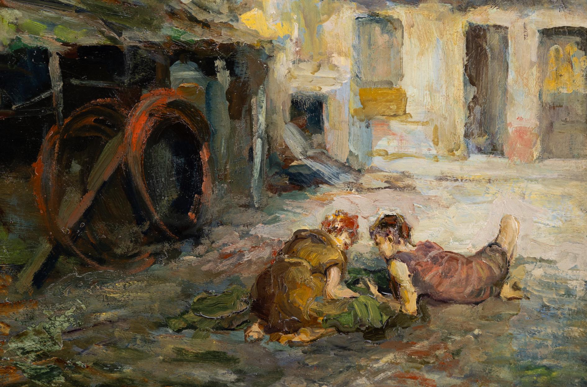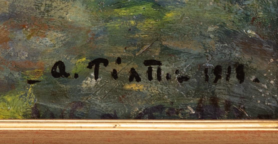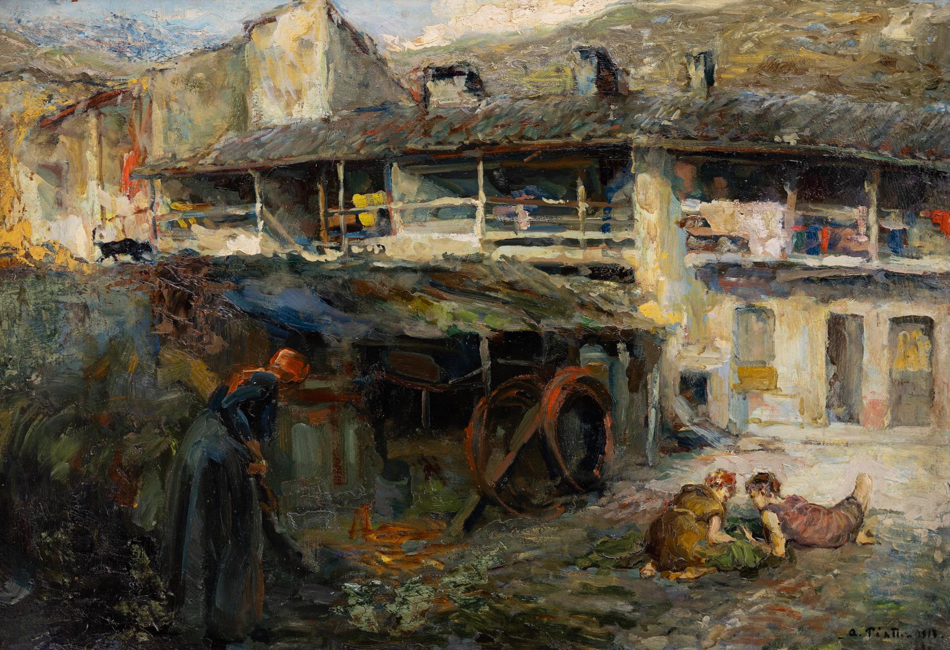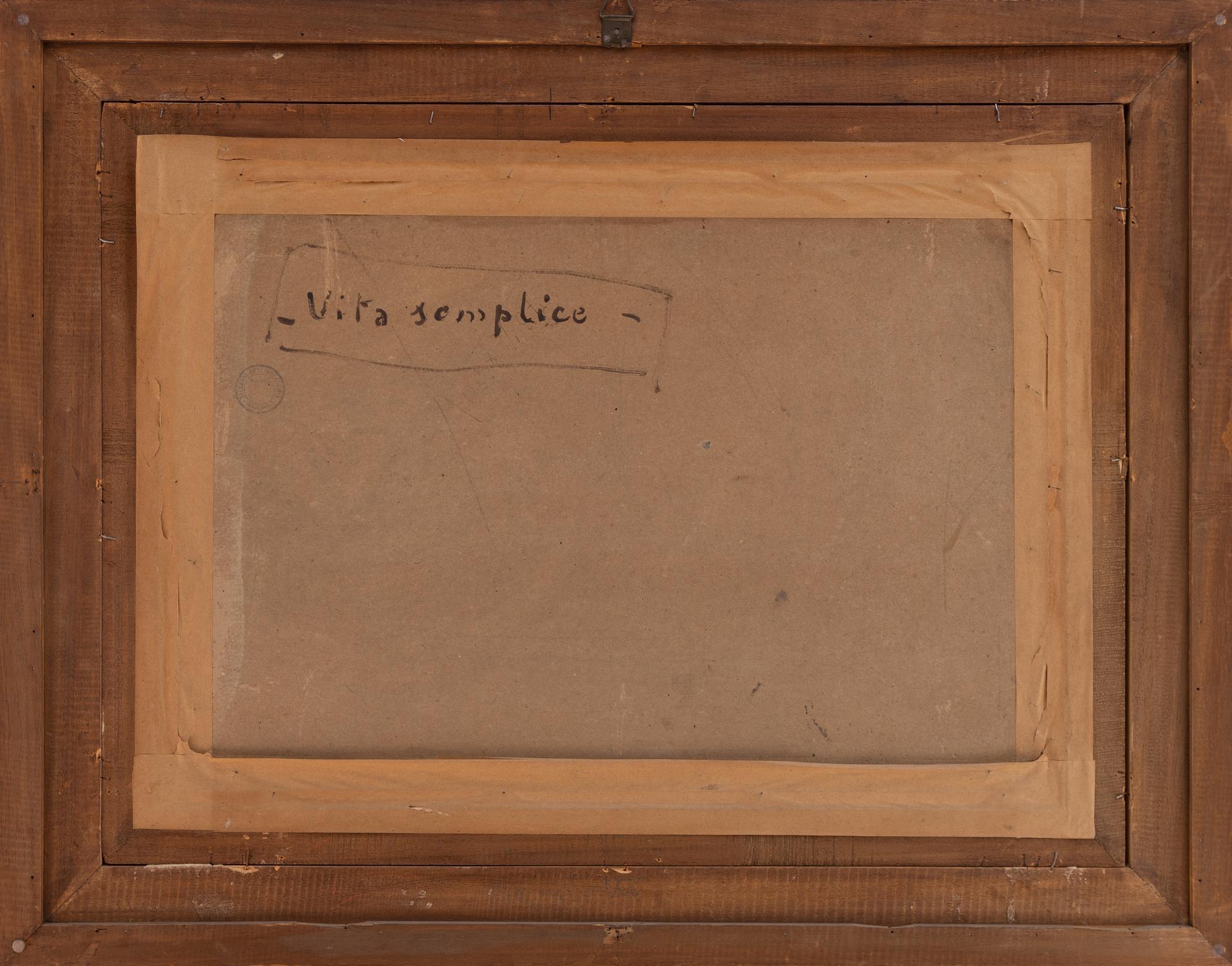 Antonio Piatti - Vita semplice (191?) - Viggiu (VA) 1875 - 1962 - Olio su cartone cm 46x66,5 - Antonio Piatti nacque a Viggiù, in provincia di Varese, il 12 giugno 1875. Cresciuto in un ambiente profondamente legato all'arte grazie al padre, lo scultore Domenico Piatti, fin da giovane si avvicinò al mondo artistico, lavorando nella bottega paterna a partire dai dodici anni. Il suo talento lo portò a perfezionarsi sotto la guida dello scultore torinese Leonardo Bistolfi. Nel 1892, all'età di diciassette anni, si trasferì a Cuneo, dove frequentò la scuola di disegno dell'Istituto Tecnico, continuando a coltivare la sua passione per l'arte.Nel 1894, Piatti entrò all'Accademia di Brera, una delle istituzioni artistiche più prestigiose d'Italia, dove studiò sotto la direzione di Cesare Tallone. Durante gli anni accademici si concentrò soprattutto sul ritratto e sulla figura umana, sviluppando uno stile espressivo che avrebbe caratterizzato la sua carriera. Il suo talento venne riconosciuto nel 1903, quando vinse il Premio Fumagalli alla Triennale di Brera, e nel 1904 ricevette il Pensionato Oggioni, che gli permise di recarsi a Parigi per un soggiorno artistico. A Parigi, Piatti ebbe modo di entrare in contatto con artisti di fama come Giovanni Boldini e di trarre ispirazione dalla vivace atmosfera parigina. Una delle sue opere più celebri di questo periodo è "Sorriso sulla Senna", che esprime la sua affinità con la città e la sua vita sociale.Successivamente, Piatti si trasferì a Roma, dove guadagnò l'ammirazione della regina Margherita, che acquistò alcune delle sue opere. Il suo successo continuò a crescere, e dal 1907 al 1930 partecipò regolarmente alle Biennali di Venezia, esponendo lavori che riflettevano la sua capacità di mescolare una resa emotiva con una ricerca espressiva unica. Opere come "Mia!" (1909), "Fremiti" (1910) e "Carezza buona" (1912) furono esposte in numerosi eventi internazionali, tra cui rassegne a Basilea, Monaco, Buenos Aires, Barcellona e Amsterdam.L'arte di Piatti si distinse per l'intensità emotiva e per una visione della realtà che fondeva la dimensione soggettiva con la potenza delle immagini. Tra le sue opere più significative si annoverano "La Senna al Pont Neuf" (1905), "Goethe e l'origine delle sue Elegie romane" (1906) e "Ascoltando la radio" (1934), che mostrano il suo continuo evolversi, passando dal ritratto alla riflessione sulla modernità e la cultura contemporanea.La sua eredità artistica rimane viva nelle collezioni pubbliche, come quelle della Galleria d'Arte Moderna di Milano, della Pinacoteca di Brera, della Galleria d'Arte Moderna di Udine e del Museo Civico di Cuneo. Antonio Piatti morì il 29 agosto 1962 a ViggiùAntonio Piatti nacque a Viggiù, in provincia di Varese, il 12 giugno 1875. Cresciuto in un ambiente profondamente legato all'arte grazie al padre, lo scultore Domenico Piatti, fin da giovane si avvicinò al mondo artistico, lavorando nella bottega paterna a partire dai dodici anni. Il suo talento lo portò a perfezionarsi sotto la guida dello scultore torinese Leonardo Bistolfi. Nel 1892, all'età di diciassette anni, si trasferì a Cuneo, dove frequentò la scuola di disegno dell'Istituto Tecnico, continuando a coltivare la sua passione per l'arte.Nel 1894, Piatti entrò all'Accademia di Brera, una delle istituzioni artistiche più prestigiose d'Italia, dove studiò sotto la direzione di Cesare Tallone. Durante gli anni accademici si concentrò soprattutto sul ritratto e sulla figura umana, sviluppando uno stile espressivo che avrebbe caratterizzato la sua carriera. Il suo talento venne riconosciuto nel 1903, quando vinse il Premio Fumagalli alla Triennale di Brera, e nel 1904 ricevette il Pensionato Oggioni, che gli permise di recarsi a Parigi per un soggiorno artistico. A Parigi, Piatti ebbe modo di entrare in contatto con artisti di fama come Giovanni Boldini e di trarre ispirazione dalla vivace atmosfera parigina. Una delle sue opere più celebri di questo periodo è "Sorriso sulla Senna", che esprime la sua affinità con la città e la sua vita sociale.Successivamente, Piatti si trasferì a Roma, dove guadagnò l'ammirazione della regina Margherita, che acquistò alcune delle sue opere. Il suo successo continuò a crescere, e dal 1907 al 1930 partecipò regolarmente alle Biennali di Venezia, esponendo lavori che riflettevano la sua capacità di mescolare una resa emotiva con una ricerca espressiva unica. Opere come "Mia!" (1909), "Fremiti" (1910) e "Carezza buona" (1912) furono esposte in numerosi eventi internazionali, tra cui rassegne a Basilea, Monaco, Buenos Aires, Barcellona e Amsterdam.L'arte di Piatti si distinse per l'intensità emotiva e per una visione della realtà che fondeva la dimensione soggettiva con la potenza delle immagini. Tra le sue opere più significative si annoverano "La Senna al Pont Neuf" (1905), "Goethe e l'origine delle sue Elegie romane" (1906) e "Ascoltando la radio" (1934), che mostrano il suo continuo evolversi, passando dal ritratto alla riflessione sulla modernità e la cultura contemporanea.La sua eredità artistica rimane viva nelle collezioni pubbliche, come quelle della Galleria d'Arte Moderna di Milano, della Pinacoteca di Brera, della Galleria d'Arte Moderna di Udine e del Museo Civico di Cuneo. Antonio Piatti morì il 29 agosto 1962 a Viggiù.