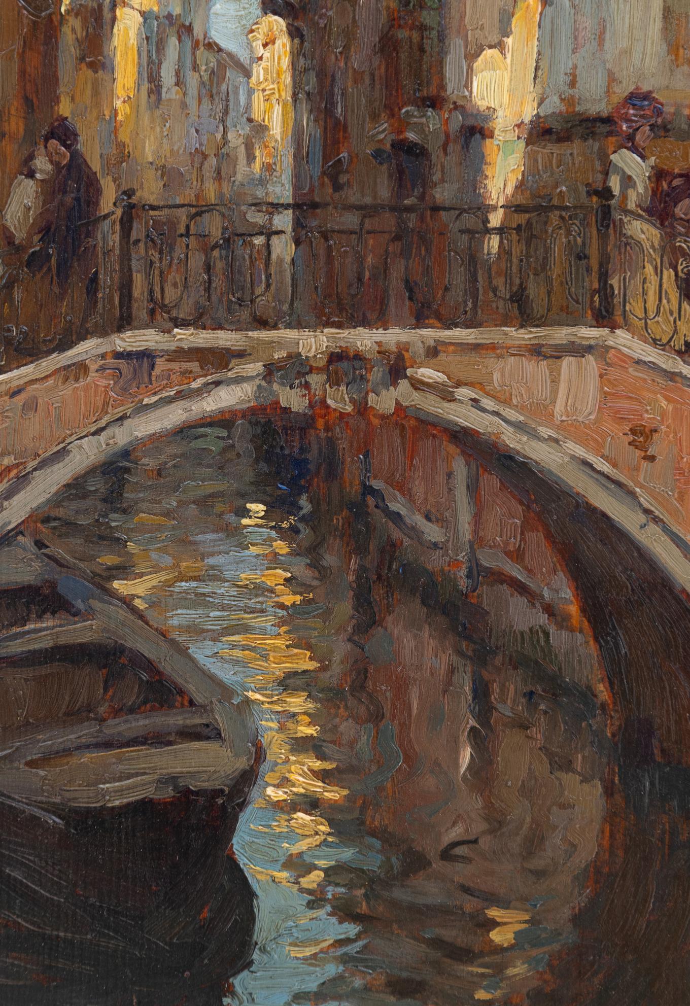 Zaccaria Dal Bo - Canale a Venezia - Venezia 1872 - 1935 - Olio su tavola cm 40,5x28,5 - Dal Bo è stato un pittore veneziano noto per le sue rappresentazioni della laguna e delle scene veneziane. Formatosi all'Istituto di Belle Arti di Venezia, partecipò a numerose esposizioni di rilievo, tra cui diverse edizioni della Biennale di Venezia: nel 1903, 1907, 1909 e 1910. Le sue opere furono esposte anche all'Esposizione Universale del Centenario di Buenos Aires nel 1910 e all'Esposizione Nazionale di Belle Arti di Brera nel 1912. Dal Bò espose inoltre a Parigi, Düsseldorf e Londra, ottenendo riconoscimenti per la sua capacità di catturare l'essenza della sua città natale. Una delle sue opere è conservata presso la Galleria Marangoni di Udine. La sua produzione artistica comprende paesaggi lagunari, vedute urbane e nature morte, caratterizzate da una tavolozza cromatica delicata e da una pennellata fluida.