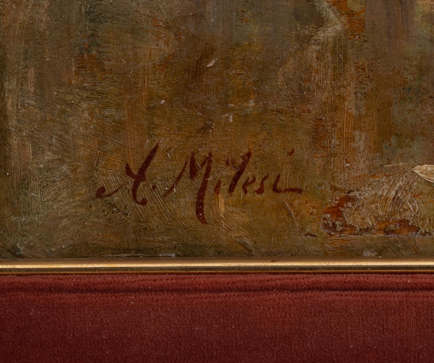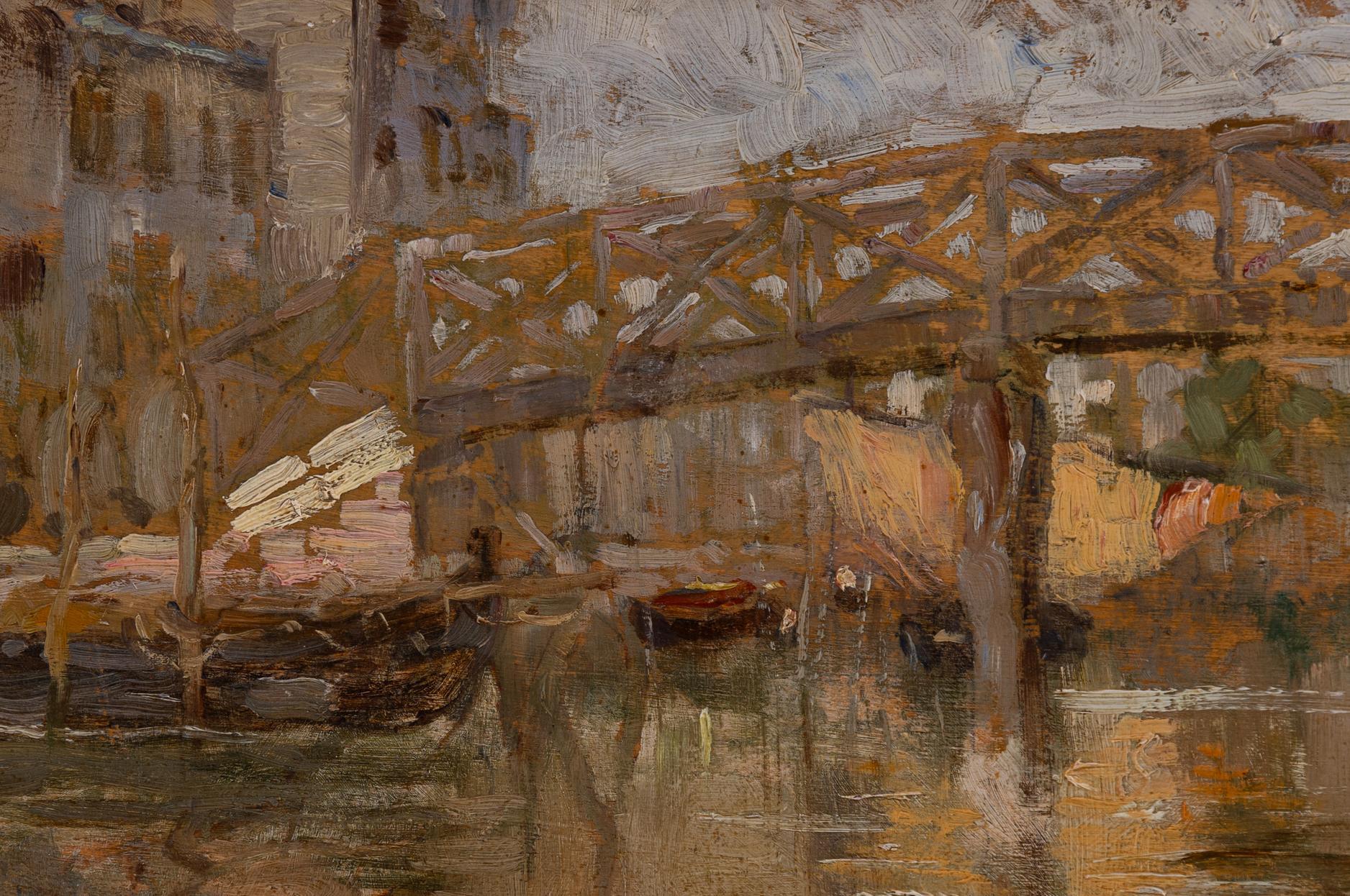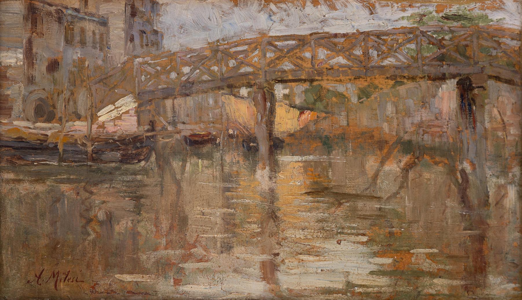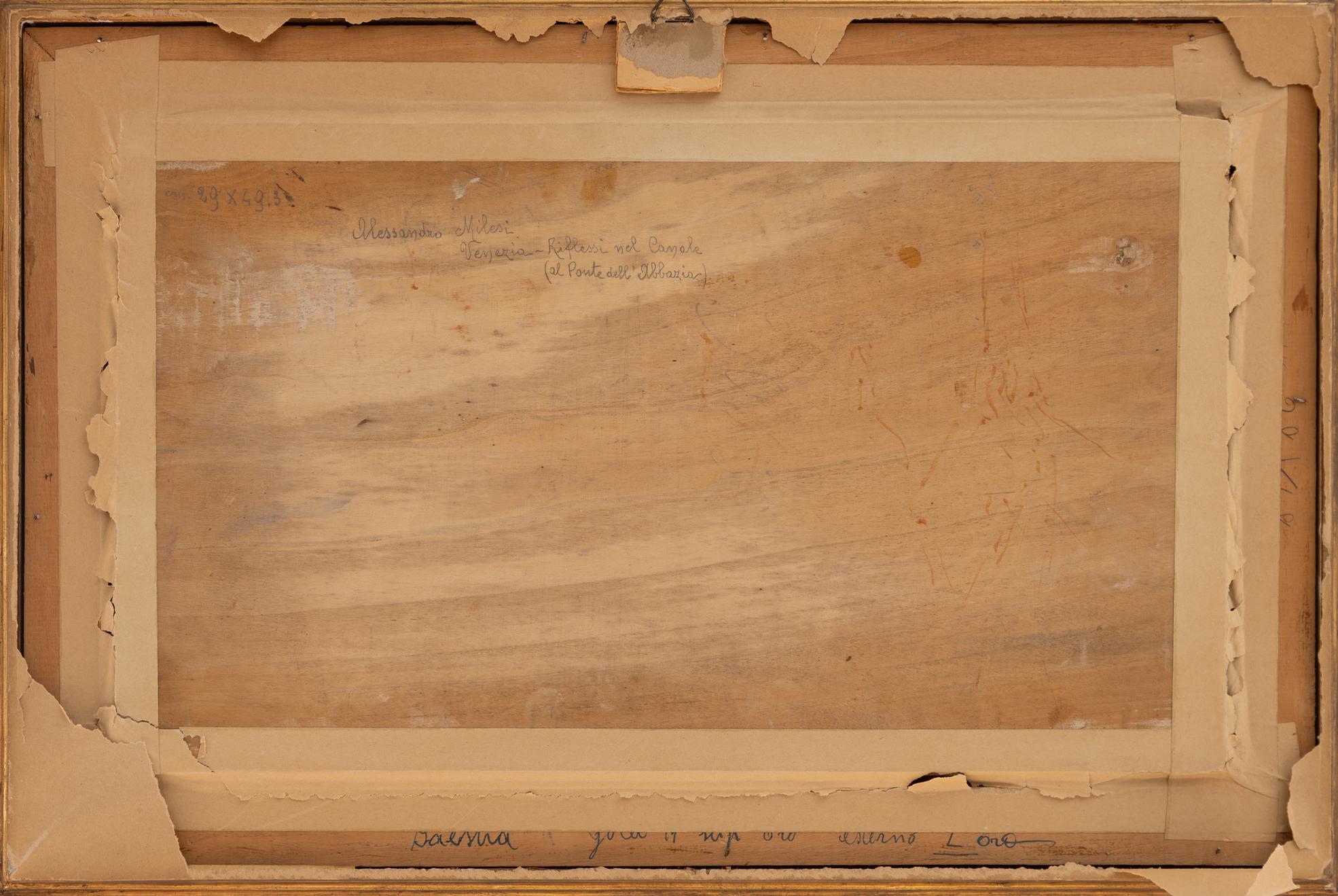 Alessandro Milesi - Venezia riflessi nel canale (Al ponte dell'Abazia) - Venezia 1856-1945 - Olio su tavola cm 29x49,5 - Alessandro Milesi, figlio di Giovanni Maria, un commerciante all'ingrosso di granaglie, e della sua seconda moglie Lucia Viola, vide la luce a Venezia il 29 aprile 1856. Fu battezzato il 4 maggio nella parrocchia di S. Trovaso, contribuendo così alla ricca tradizione artistica di questa città lagunare.La sua giovinezza fu segnata da sfide economiche a causa della malattia del padre, che lo spinsero a iniziare a lavorare come tabaccaio nei pressi di S. Simeone. Tuttavia, la sua passione per l'arte lo spinse a perseguire una carriera artistica.A soli tredici anni, il 15 novembre 1869, Alessandro si iscrisse all'Accademia di belle arti di Venezia, un importante passo nella sua formazione. Qui studiò con impegno e ottenne risultati lodevoli, come attestato dai documenti conservati negli Archivi dell'Accademia.Il suo percorso artistico lo portò successivamente a Verona, dove seguì il suo insegnante Napoleone Nani. Grazie all'aiuto di Nani, ottenne commissioni importanti, tra cui il dipinto del soffitto di una chiesa a Isola della Scala e altri lavori significativi.Tornato a Venezia, Alessandro Milesi creò opere notevoli, tra cui i ritratti del padre e della madre, esposti in importanti gallerie d'arte. Espose in diverse mostre nazionali ed internazionali, guadagnandosi una crescente reputazione.Le sue opere spesso rappresentavano scene di vita quotidiana veneziana, con gruppi di persone intente al lavoro o alla conversazione, influenzate dalla tendenza artistica di quegli anni. Le sue composizioni richiamavano l'attenzione di collezionisti e artisti stranieri.Nel 1886, Alessandro Milesi si sposò con Maria Ciardi, anch'essa proveniente da una famiglia di artisti. Continuò a dipingere con passione, realizzando ritratti e opere di grande impegno sociale.Partecipò regolarmente alla Biennale di Venezia, esponendo diverse opere che ottennero apprezzamento e premi. Il suo contributo all'arte veneziana fu significativo, con opere che riflettevano la vita e la cultura della città.Nel 1934, realizzò una pala d'altare per la chiesa di S. Teresa a Venezia, una delle rare opere a soggetto religioso della sua carriera.Alessandro Milesi trascorse gran parte della sua vita a Venezia, contribuendo in modo significativo alla scena artistica della città. Morì il 29 ottobre 1945 a Venezia, lasciando un eredità duratura nel mondo dell'arte veneziana. Le sue opere continuano a essere ammirate e studiate per la loro bellezza e autenticità.