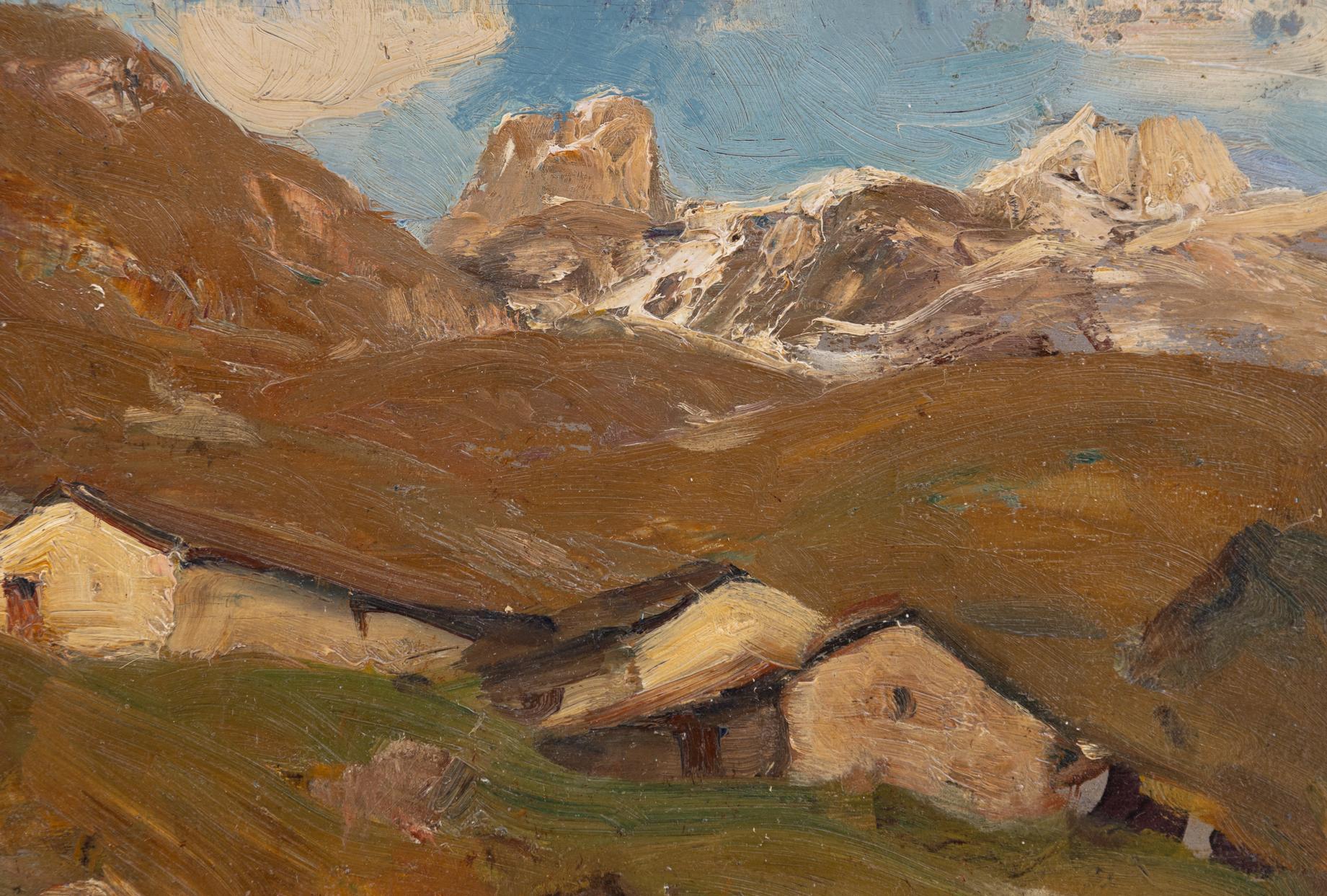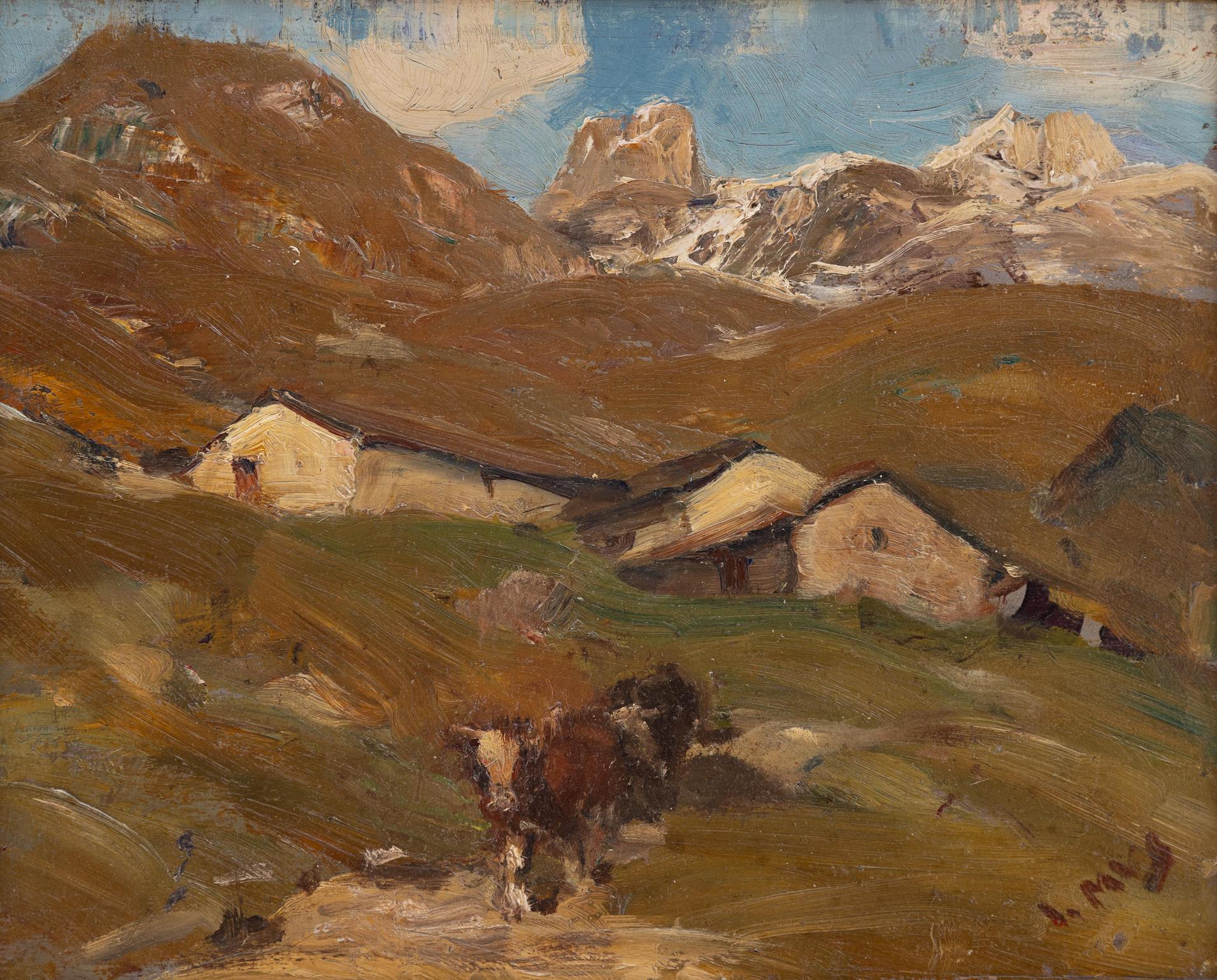 Italo Mus - Montagne valdostane - Chatillon AO 1892 - Saint Vincent AO 1967 - Olio su tavola cm 27,5x33,5 - Italo Mus nacque il 4 aprile 1892 a Châtillon, un piccolo villaggio della Valle d'Aosta. Cresciuto in una famiglia di artisti, suo padre Eugenio Mus era uno scultore che lo avviò sin da giovane allo studio del disegno e della scultura in legno nella sua bottega. Sebbene inizialmente si dedicasse all'intaglio, il giovane Italo si orientò verso la pittura, grazie anche all'incoraggiamento di Lorenzo Delleani, pittore di fama, che lo indirizzò verso una formazione accademica.Frequentò l'Accademia Albertina di Belle Arti di Torino, dove approfondì la sua preparazione sotto la guida di maestri come Paolo Gaidano, Andrea Marchisio, Giacomo Grosso e Luigi Onetti. La sua carriera artistica ebbe una svolta importante nel 1912, quando partecipò al Salone dei Giovani Pittori, ottenendo il primo premio, un riconoscimento che segnò l'inizio di una carriera brillante.Nel 1913, Mus ampliò la sua esperienza artistica collaborando alla realizzazione di decorazioni a fresco in città come Lione e Losanna. Ma fu la sua Valle d'Aosta, con i suoi paesaggi montani e le tradizioni rurali, a diventare la principale fonte di ispirazione per le sue opere. Le sue tele spesso raccontano scene di vita quotidiana, come il lavoro dei pastori, dei contadini e le peculiarità degli antichi edifici rurali come i rascard, tipiche costruzioni in legno e pietra delle Alpi.Tra le sue opere più celebri si ricordano "Pastore al lavoro", "Contadini: la semina" e "Rascard", che testimoniano la sua capacità di catturare la bellezza e la semplicità della vita montana. Con una tavolozza che riflette i toni caldi e terrosi dei paesaggi alpini, Mus riusciva a trasmettere un forte senso di identità e appartenenza alla sua terra.Italo Mus morì il 15 maggio 1967 a Saint-VincentItalo Mus nacque il 4 aprile 1892 a Châtillon, un piccolo villaggio della Valle d'Aosta. Cresciuto in una famiglia di artisti, suo padre Eugenio Mus era uno scultore che lo avviò sin da giovane allo studio del disegno e della scultura in legno nella sua bottega. Sebbene inizialmente si dedicasse all'intaglio, il giovane Italo si orientò verso la pittura, grazie anche all'incoraggiamento di Lorenzo Delleani, pittore di fama, che lo indirizzò verso una formazione accademica.Frequentò l'Accademia Albertina di Belle Arti di Torino, dove approfondì la sua preparazione sotto la guida di maestri come Paolo Gaidano, Andrea Marchisio, Giacomo Grosso e Luigi Onetti. La sua carriera artistica ebbe una svolta importante nel 1912, quando partecipò al Salone dei Giovani Pittori, ottenendo il primo premio, un riconoscimento che segnò l'inizio di una carriera brillante.Nel 1913, Mus ampliò la sua esperienza artistica collaborando alla realizzazione di decorazioni a fresco in città come Lione e Losanna. Ma fu la sua Valle d'Aosta, con i suoi paesaggi montani e le tradizioni rurali, a diventare la principale fonte di ispirazione per le sue opere. Le sue tele spesso raccontano scene di vita quotidiana, come il lavoro dei pastori, dei contadini e le peculiarità degli antichi edifici rurali come i rascard, tipiche costruzioni in legno e pietra delle Alpi.Tra le sue opere più celebri si ricordano "Pastore al lavoro", "Contadini: la semina" e "Rascard", che testimoniano la sua capacità di catturare la bellezza e la semplicità della vita montana. Con una tavolozza che riflette i toni caldi e terrosi dei paesaggi alpini, Mus riusciva a trasmettere un forte senso di identità e appartenenza alla sua terra.Italo Mus morì il 15 maggio 1967 a Saint-Vincent.