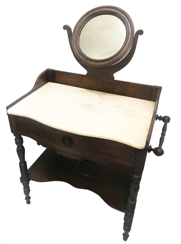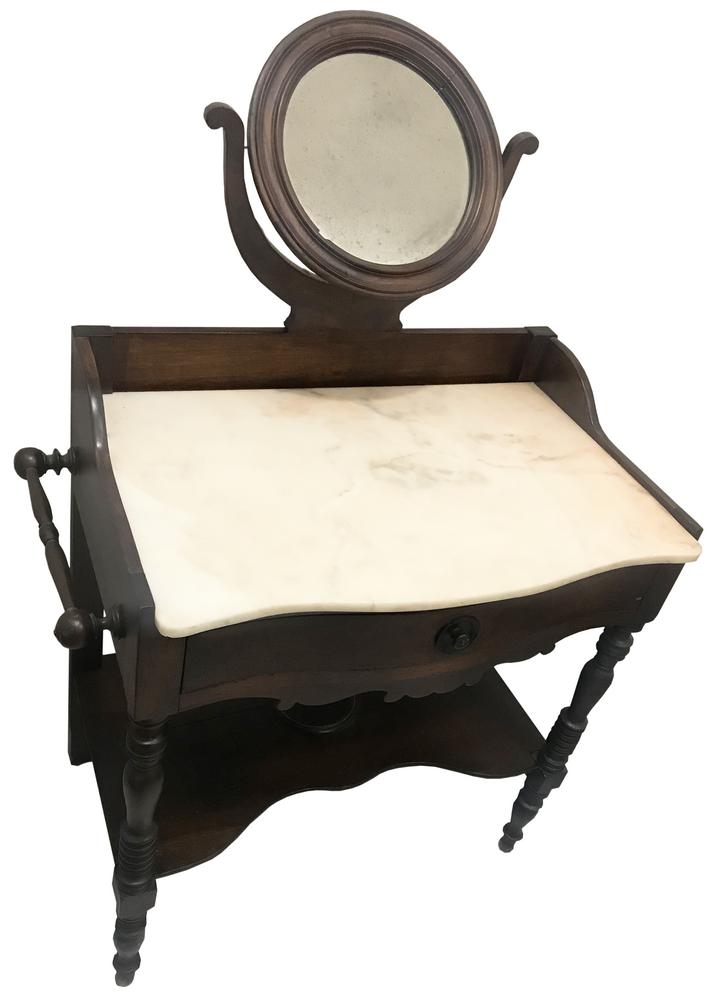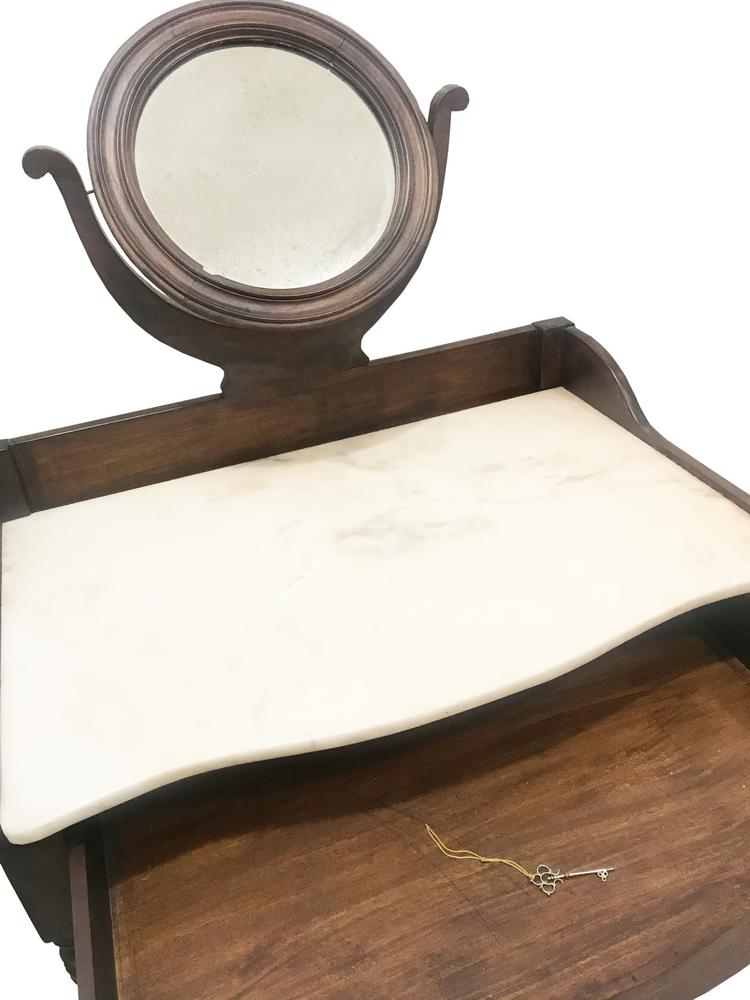 in noce con piano in marmo rosato ad un cassetto e specchio centrale epoca Luigi Filippo, accompagnata da seggiola in legno intagliato in stile ampezzano del XVIII secolo