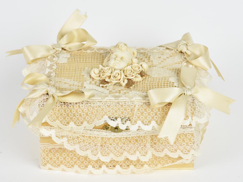 SCATOLA IN LEGNO decorata da merletti e nastri, figura di angelo sul...