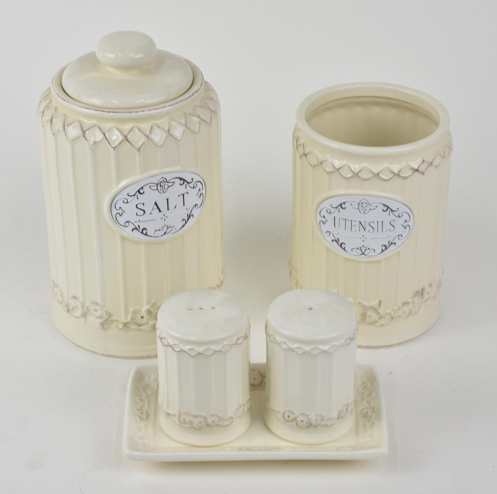 LOTTO DI OGGETTI DA CUCINA composto da sale e pepe con vassoietto, barattolo...